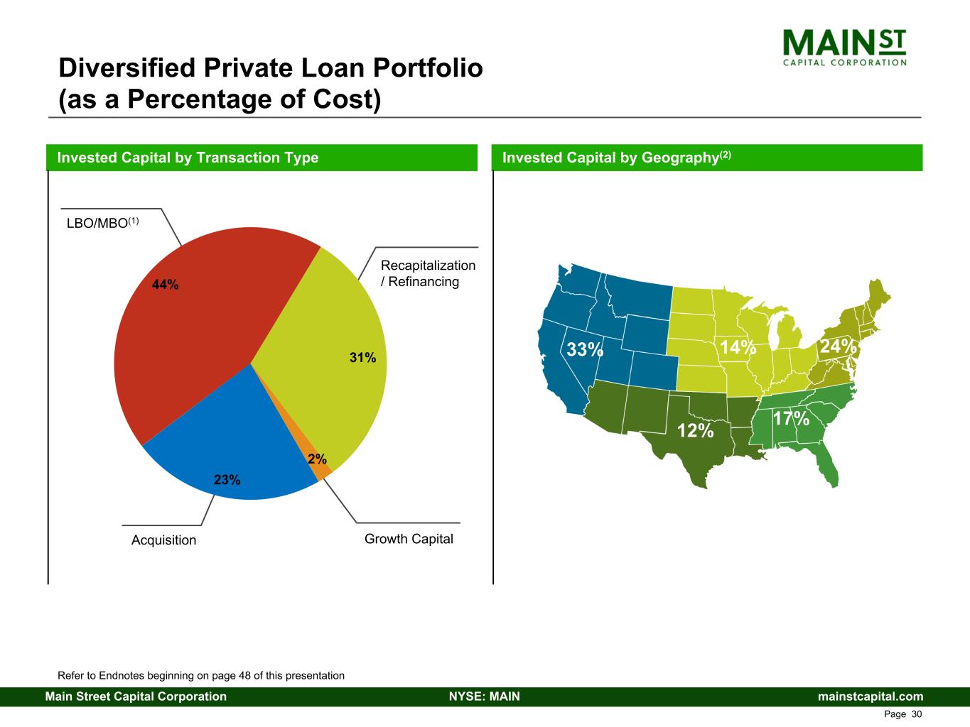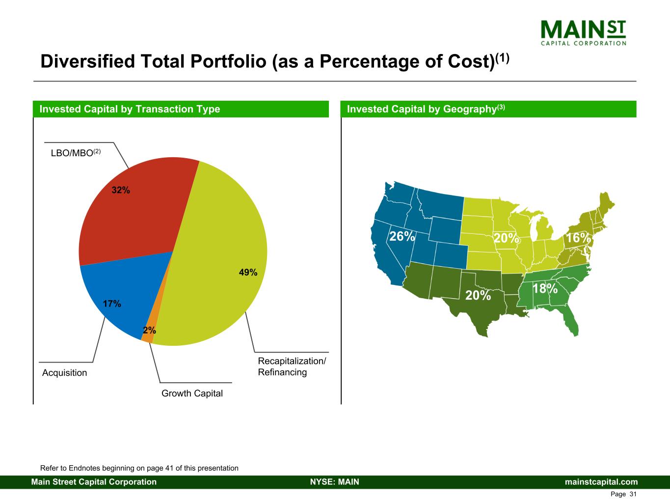 mainstcapital.comNYSE: MAINMain Street Capital Corporation www.mainstcapital.com Page 30 Diversified Private Loan Portfolio (as a Percentage of Cost) Invested Capital by Transaction Type Invested Capital by Geography(2) 33% 14% 12% 17% 24% LBO/MBO(1) Acquisition Growth Capital Recapitalization / Refinancing Refer to Endnotes beginning on page 48 of this presentation 23% 44% 31% 2%