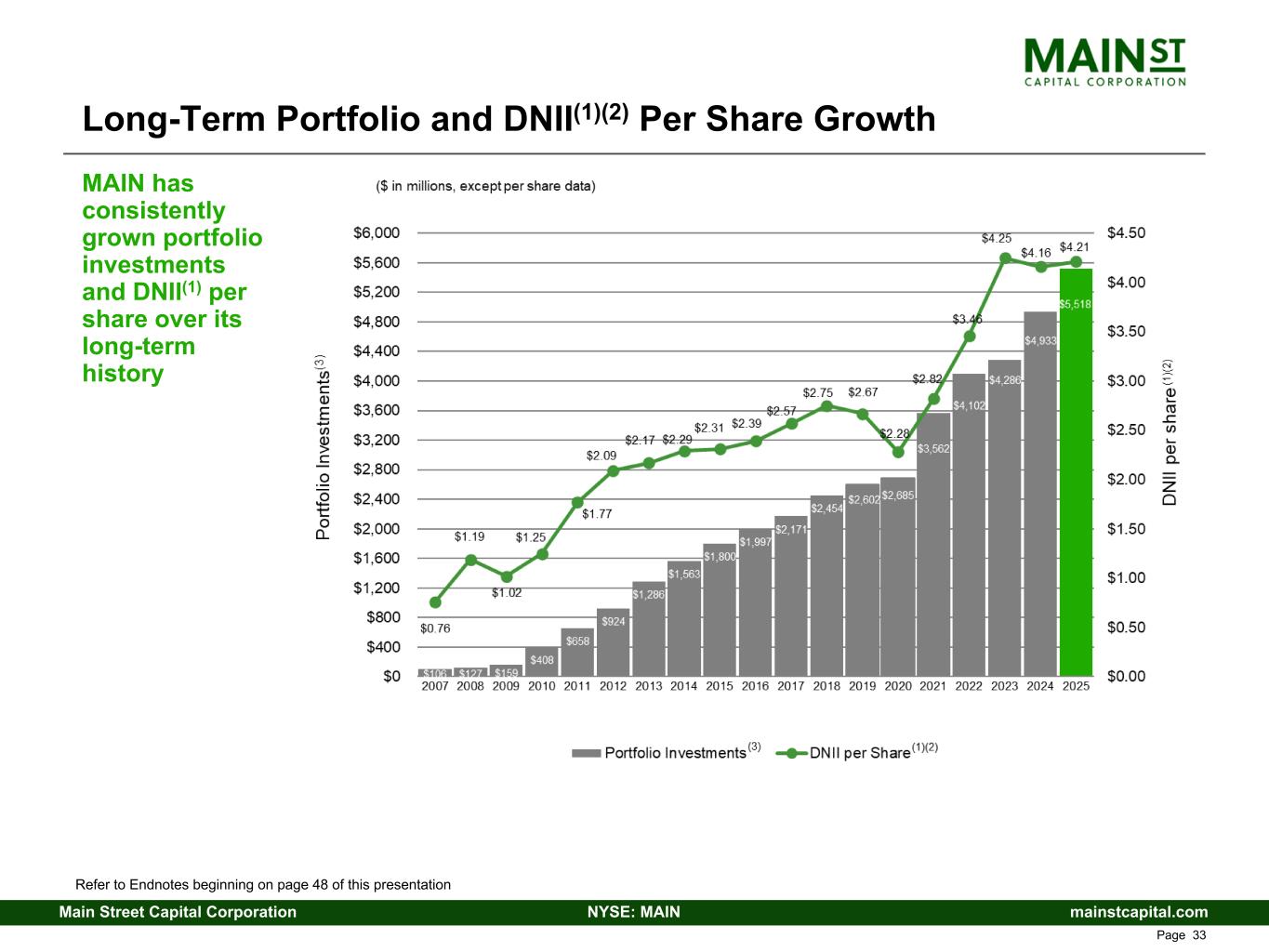 mainstcapital.comNYSE: MAINMain Street Capital Corporation www.mainstcapital.com Page 32 $222.6 $289.0 $376.9 $500.4 $541.0 $566.4 2020 2021 2022 2023 2024 2025 $0.0 $40.0 $80.0 $120.0 $160.0 $200.0 $240.0 $280.0 $320.0 $360.0 $400.0 $440.0 $480.0 $520.0 $560.0 $600.0 $149.6 $194.7 $257.5 $348.5 $361.3 $376.0 2020 2021 2022 2023 2024 2025 $0.0 $25.0 $50.0 $75.0 $100.0 $125.0 $150.0 $175.0 $200.0 $225.0 $250.0 $275.0 $300.0 $325.0 $350.0 $375.0 $400.0 MAIN Financial Performance Total Investment Income ($ in millions) Distributable Net Investment Income(1)(2) ($ in millions) Year over Year Change Year over Year Change 30% 30% 32%30% 4%8% 35%5% 4%33% Refer to Endnotes beginning on page 48 of this presentation