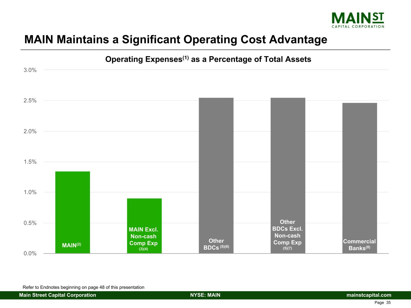 mainstcapital.comNYSE: MAINMain Street Capital Corporation www.mainstcapital.com Page 34 Efficient and Leverageable Operating Structure “Internally managed” structure means no external management fees or expenses are paid Alignment of interest between management and investors • Greater incentives to maximize increases to shareholder value and rationalize debt and equity capital raises • 100% of MAIN’s management efforts and activities are for the benefit of MAIN investors MAIN targets total operating expenses(1) as a percentage of average assets (Operating Expense to Assets Ratio) at or less than 2% • Long-term actual results have significantly outperformed target • An industry leading position in cost efficiency, with an Operating Expense to Assets Ratio of 1.3%(2) Significant portion of total operating expenses(1) are non-cash • Non-cash compensation expenses(3) were 32.5%(2) of total operating expenses(1) • Operating Expense to Assets Ratio of 0.9%(2) excluding non-cash compensation expenses(3) MAIN’s internally managed operating structure provides significant operating leverage and greater returns for our shareholders Refer to Endnotes beginning on page 48 of this presentation
