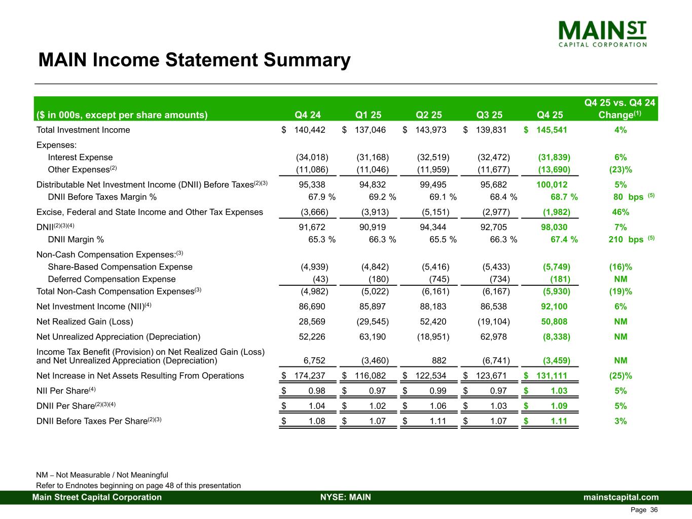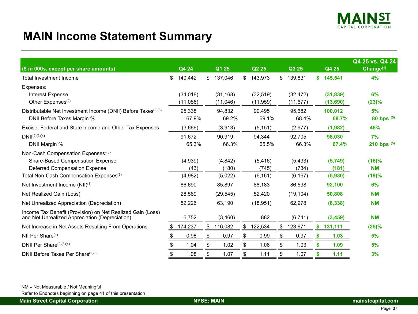 mainstcapital.comNYSE: MAINMain Street Capital Corporation www.mainstcapital.com Page 36 MAIN Income Statement Summary Q4 25 vs. Q4 24 ($ in 000s, except per share amounts) Q4 24 Q1 25 Q2 25 Q3 25 Q4 25 Change(1) Total Investment Income $ 140,442 $ 137,046 $ 143,973 $ 139,831 $ 145,541 4% Expenses: Interest Expense (34,018) (31,168) (32,519) (32,472) (31,839) 6% Other Expenses(2) (11,086) (11,046) (11,959) (11,677) (13,690) (23)% Distributable Net Investment Income (DNII) Before Taxes(2)(3) 95,338 94,832 99,495 95,682 100,012 5% DNII Before Taxes Margin % 67.9 % 69.2 % 69.1 % 68.4 % 68.7 % 80 bps (5) Excise, Federal and State Income and Other Tax Expenses (3,666) (3,913) (5,151) (2,977) (1,982) 46% DNII(2)(3)(4) 91,672 90,919 94,344 92,705 98,030 7% DNII Margin % 65.3 % 66.3 % 65.5 % 66.3 % 67.4 % 210 bps (5) Non-Cash Compensation Expenses:(3) Share-Based Compensation Expense (4,939) (4,842) (5,416) (5,433) (5,749) (16)% Deferred Compensation Expense (43) (180) (745) (734) (181) NM Total Non-Cash Compensation Expenses(3) (4,982) (5,022) (6,161) (6,167) (5,930) (19)% Net Investment Income (NII)(4) 86,690 85,897 88,183 86,538 92,100 6% Net Realized Gain (Loss) 28,569 (29,545) 52,420 (19,104) 50,808 NM Net Unrealized Appreciation (Depreciation) 52,226 63,190 (18,951) 62,978 (8,338) NM Income Tax Benefit (Provision) on Net Realized Gain (Loss) and Net Unrealized Appreciation (Depreciation) 6,752 (3,460) 882 (6,741) (3,459) NM Net Increase in Net Assets Resulting From Operations $ 174,237 $ 116,082 $ 122,534 $ 123,671 $ 131,111 (25)% NII Per Share(4) $ 0.98 $ 0.97 $ 0.99 $ 0.97 $ 1.03 5% DNII Per Share(2)(3)(4) $ 1.04 $ 1.02 $ 1.06 $ 1.03 $ 1.09 5% DNII Before Taxes Per Share(2)(3) $ 1.08 $ 1.07 $ 1.11 $ 1.07 $ 1.11 3% NM – Not Measurable / Not Meaningful Refer to Endnotes beginning on page 48 of this presentation