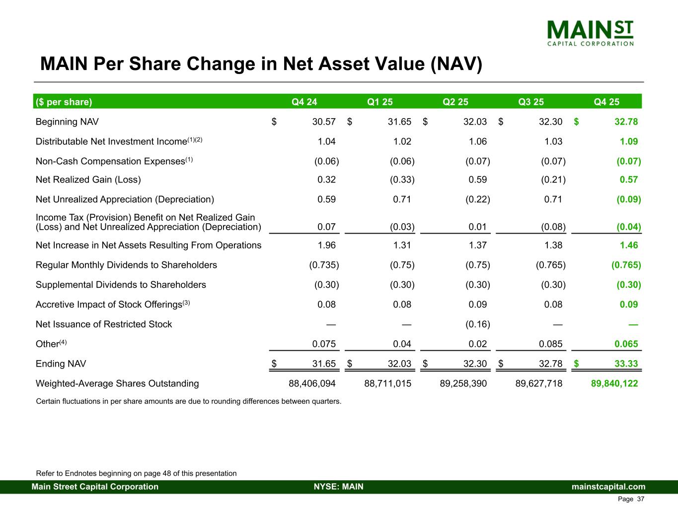 mainstcapital.comNYSE: MAINMain Street Capital Corporation www.mainstcapital.com Page 38 MAIN Per Share Change in Net Asset Value (NAV) Certain fluctuations in per share amounts are due to rounding differences between quarters. ($ per share) Q4 24 Q1 25 Q2 25 Q3 25 Q4 25 Beginning NAV $ 30.57 $ 31.65 $ 32.03 $ 32.30 $ 32.78 Distributable Net Investment Income(1)(2) 1.04 1.02 1.06 1.03 1.09 Non-Cash Compensation Expenses(1) (0.06) (0.06) (0.07) (0.07) (0.07) Net Realized Gain (Loss) 0.32 (0.33) 0.59 (0.21) 0.57 Net Unrealized Appreciation (Depreciation) 0.59 0.71 (0.22) 0.71 (0.09) Income Tax (Provision) Benefit on Net Realized Gain (Loss) and Net Unrealized Appreciation (Depreciation) 0.07 (0.03) 0.01 (0.08) (0.04) Net Increase in Net Assets Resulting From Operations 1.96 1.31 1.37 1.38 1.46 Regular Monthly Dividends to Shareholders (0.735) (0.75) (0.75) (0.765) (0.765) Supplemental Dividends to Shareholders (0.30) (0.30) (0.30) (0.30) (0.30) Accretive Impact of Stock Offerings(3) 0.08 0.08 0.09 0.08 0.09 Net Issuance of Restricted Stock — — (0.16) — — Other(4) 0.075 0.04 0.02 0.085 0.065 Ending NAV $ 31.65 $ 32.03 $ 32.30 $ 32.78 $ 33.33 Weighted-Average Shares Outstanding 88,406,094 88,711,015 89,258,390 89,627,718 89,840,122 Refer to Endnotes beginning on page 41 of this presentation