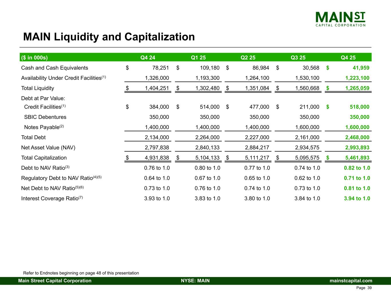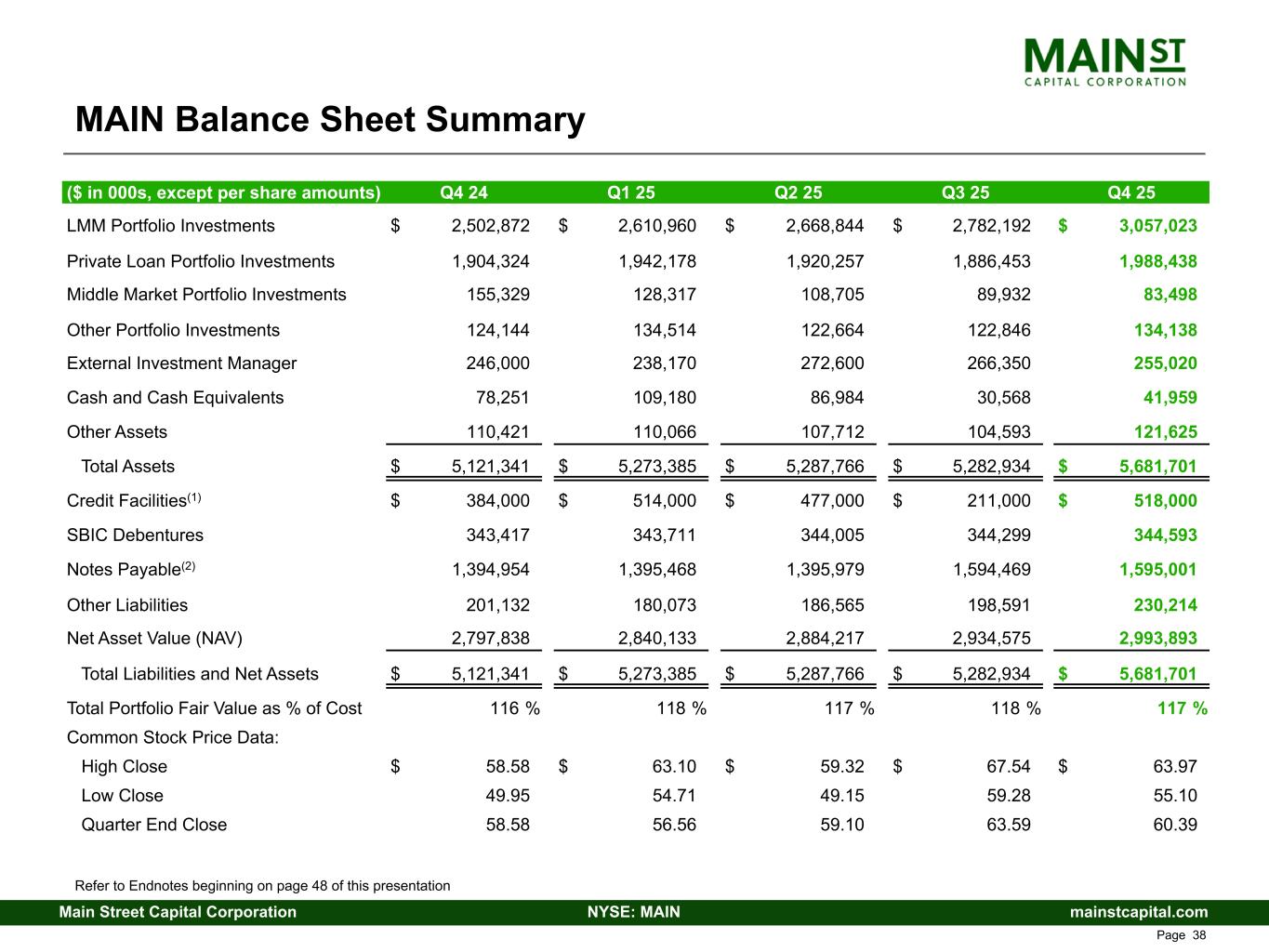 mainstcapital.comNYSE: MAINMain Street Capital Corporation www.mainstcapital.com Page 38 MAIN Balance Sheet Summary ($ in 000s, except per share amounts) Q4 24 Q1 25 Q2 25 Q3 25 Q4 25 LMM Portfolio Investments $ 2,502,872 $ 2,610,960 $ 2,668,844 $ 2,782,192 $ 3,057,023 Private Loan Portfolio Investments 1,904,324 1,942,178 1,920,257 1,886,453 1,988,438 Middle Market Portfolio Investments 155,329 128,317 108,705 89,932 83,498 Other Portfolio Investments 124,144 134,514 122,664 122,846 134,138 External Investment Manager 246,000 238,170 272,600 266,350 255,020 Cash and Cash Equivalents 78,251 109,180 86,984 30,568 41,959 Other Assets 110,421 110,066 107,712 104,593 121,625 Total Assets $ 5,121,341 $ 5,273,385 $ 5,287,766 $ 5,282,934 $ 5,681,701 Credit Facilities(1) $ 384,000 $ 514,000 $ 477,000 $ 211,000 $ 518,000 SBIC Debentures 343,417 343,711 344,005 344,299 344,593 Notes Payable(2) 1,394,954 1,395,468 1,395,979 1,594,469 1,595,001 Other Liabilities 201,132 180,073 186,565 198,591 230,214 Net Asset Value (NAV) 2,797,838 2,840,133 2,884,217 2,934,575 2,993,893 Total Liabilities and Net Assets $ 5,121,341 $ 5,273,385 $ 5,287,766 $ 5,282,934 $ 5,681,701 Total Portfolio Fair Value as % of Cost 116 % 118 % 117 % 118 % 117 % Common Stock Price Data: High Close $ 58.58 $ 63.10 $ 59.32 $ 67.54 $ 63.97 Low Close 49.95 54.71 49.15 59.28 55.10 Quarter End Close 58.58 56.56 59.10 63.59 60.39 Refer to Endnotes beginning on page 48 of this presentation
