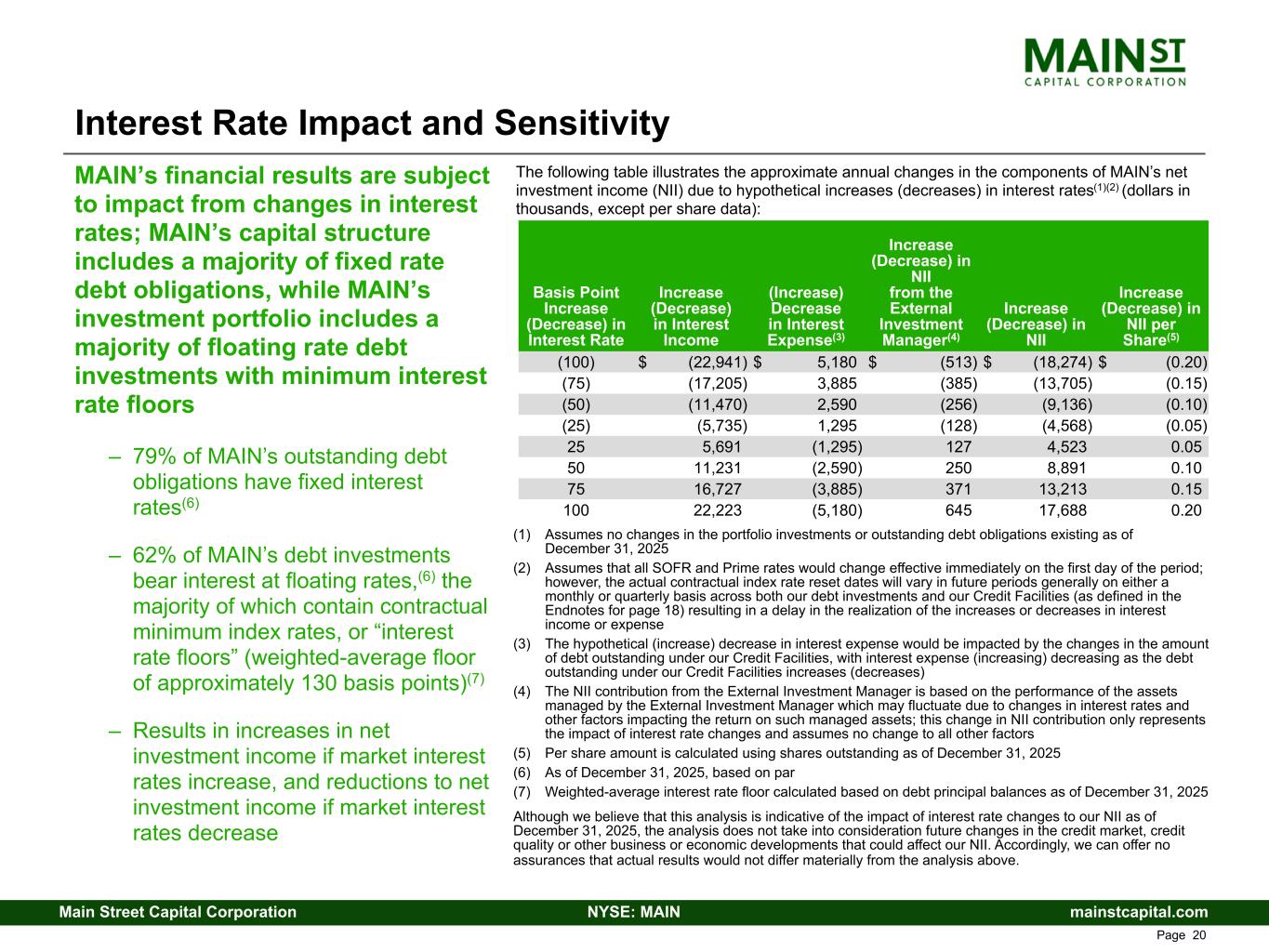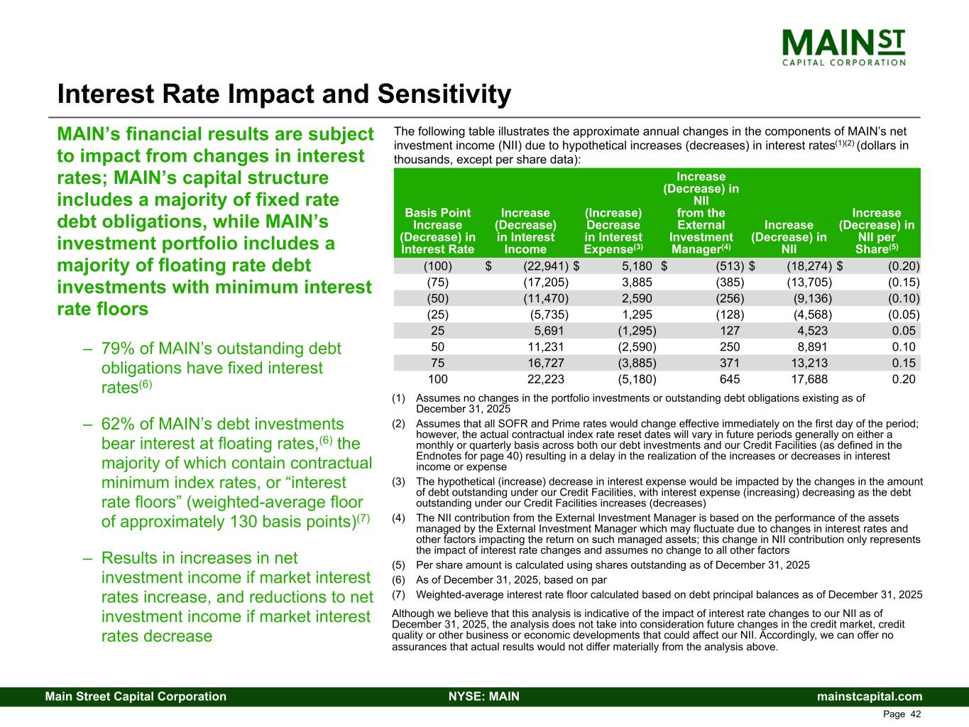 mainstcapital.comNYSE: MAINMain Street Capital Corporation www.mainstcapital.com Page 42 Interest Rate Impact and Sensitivity The following table illustrates the approximate annual changes in the components of MAIN’s net investment income (NII) due to hypothetical increases (decreases) in interest rates(1)(2) (dollars in thousands, except per share data): MAIN’s financial results are subject to impact from changes in interest rates; MAIN’s capital structure includes a majority of fixed rate debt obligations, while MAIN’s investment portfolio includes a majority of floating rate debt investments with minimum interest rate floors – 79% of MAIN’s outstanding debt obligations have fixed interest rates(6) – 62% of MAIN’s debt investments bear interest at floating rates,(6) the majority of which contain contractual minimum index rates, or “interest rate floors” (weighted-average floor of approximately 130 basis points)(7) – Results in increases in net investment income if market interest rates increase, and reductions to net investment income if market interest rates decrease (1) Assumes no changes in the portfolio investments or outstanding debt obligations existing as of December 31, 2025 (2) Assumes that all SOFR and Prime rates would change effective immediately on the first day of the period; however, the actual contractual index rate reset dates will vary in future periods generally on either a monthly or quarterly basis across both our debt investments and our Credit Facilities (as defined in the Endnotes for page 40) resulting in a delay in the realization of the increases or decreases in interest income or expense (3) The hypothetical (increase) decrease in interest expense would be impacted by the changes in the amount of debt outstanding under our Credit Facilities, with interest expense (increasing) decreasing as the debt outstanding under our Credit Facilities increases (decreases) (4) The NII contribution from the External Investment Manager is based on the performance of the assets managed by the External Investment Manager which may fluctuate due to changes in interest rates and other factors impacting the return on such managed assets; this change in NII contribution only represents the impact of interest rate changes and assumes no change to all other factors (5) Per share amount is calculated using shares outstanding as of December 31, 2025 (6) As of December 31, 2025, based on par (7) Weighted-average interest rate floor calculated based on debt principal balances as of December 31, 2025 Although we believe that this analysis is indicative of the impact of interest rate changes to our NII as of December 31, 2025, the analysis does not take into consideration future changes in the credit market, credit quality or other business or economic developments that could affect our NII. Accordingly, we can offer no assurances that actual results would not differ materially from the analysis above. Basis Point Increase (Decrease) in Interest Rate Increase (Decrease) in Interest Income (Increase) Decrease in Interest Expense(3) Increase (Decrease) in NII from the External Investment Manager(4) Increase (Decrease) in NII Increase (Decrease) in NII per Share(5) (100) $ (22,941) $ 5,180 $ (513) $ (18,274) $ (0.20) (75) (17,205) 3,885 (385) (13,705) (0.15) (50) (11,470) 2,590 (256) (9,136) (0.10) (25) (5,735) 1,295 (128) (4,568) (0.05) 25 5,691 (1,295) 127 4,523 0.05 50 11,231 (2,590) 250 8,891 0.10 75 16,727 (3,885) 371 13,213 0.15 100 22,223 (5,180) 645 17,688 0.20