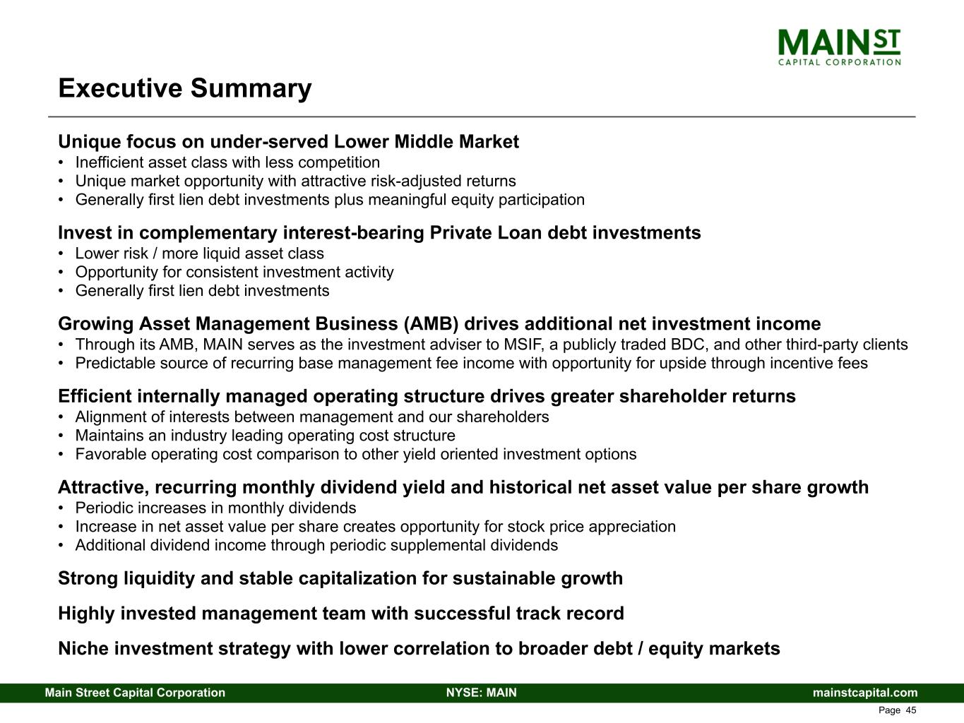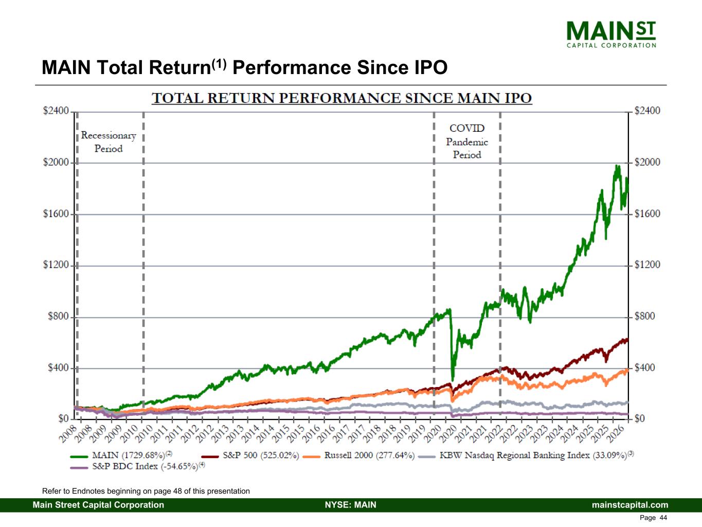 mainstcapital.comNYSE: MAINMain Street Capital Corporation www.mainstcapital.com Page 44 MAIN Total Return(1) Performance Since IPO Refer to Endnotes beginning on page 48 of this presentation