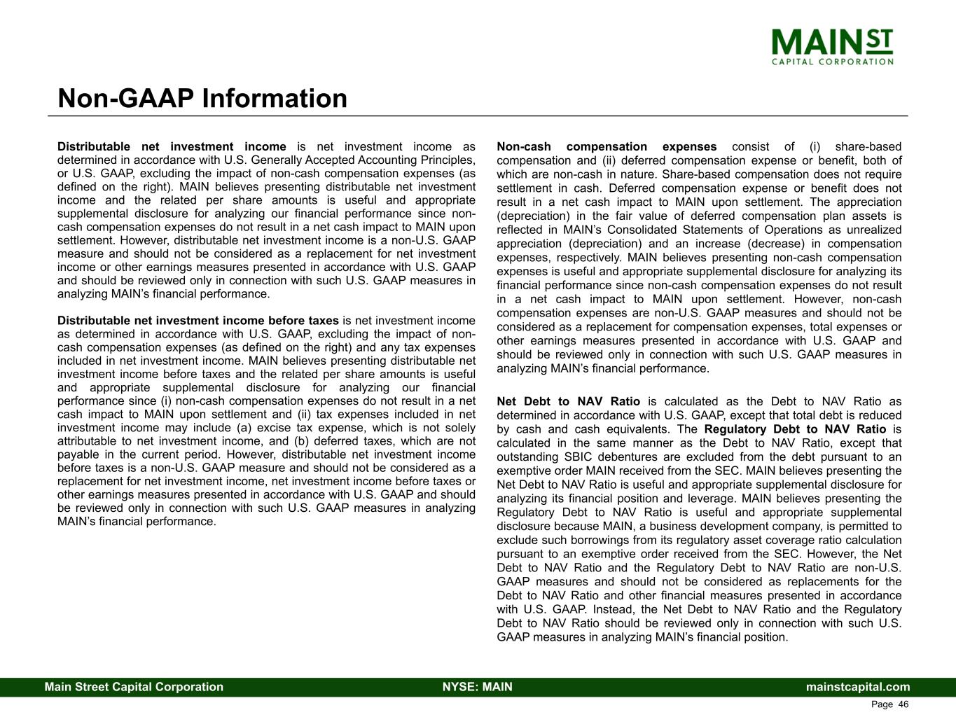 mainstcapital.comNYSE: MAINMain Street Capital Corporation www.mainstcapital.com Page 46 Non-GAAP Information Distributable net investment income is net investment income as determined in accordance with U.S. Generally Accepted Accounting Principles, or U.S. GAAP, excluding the impact of non-cash compensation expenses (as defined on the right). MAIN believes presenting distributable net investment income and the related per share amounts is useful and appropriate supplemental disclosure for analyzing our financial performance since non- cash compensation expenses do not result in a net cash impact to MAIN upon settlement. However, distributable net investment income is a non-U.S. GAAP measure and should not be considered as a replacement for net investment income or other earnings measures presented in accordance with U.S. GAAP and should be reviewed only in connection with such U.S. GAAP measures in analyzing MAIN’s financial performance. Distributable net investment income before taxes is net investment income as determined in accordance with U.S. GAAP, excluding the impact of non- cash compensation expenses (as defined on the right) and any tax expenses included in net investment income. MAIN believes presenting distributable net investment income before taxes and the related per share amounts is useful and appropriate supplemental disclosure for analyzing our financial performance since (i) non-cash compensation expenses do not result in a net cash impact to MAIN upon settlement and (ii) tax expenses included in net investment income may include (a) excise tax expense, which is not solely attributable to net investment income, and (b) deferred taxes, which are not payable in the current period. However, distributable net investment income before taxes is a non-U.S. GAAP measure and should not be considered as a replacement for net investment income, net investment income before taxes or other earnings measures presented in accordance with U.S. GAAP and should be reviewed only in connection with such U.S. GAAP measures in analyzing MAIN’s financial performance. Non-cash compensation expenses consist of (i) share-based compensation and (ii) deferred compensation expense or benefit, both of which are non-cash in nature. Share-based compensation does not require settlement in cash. Deferred compensation expense or benefit does not result in a net cash impact to MAIN upon settlement. The appreciation (depreciation) in the fair value of deferred compensation plan assets is reflected in MAIN’s Consolidated Statements of Operations as unrealized appreciation (depreciation) and an increase (decrease) in compensation expenses, respectively. MAIN believes presenting non-cash compensation expenses is useful and appropriate supplemental disclosure for analyzing its financial performance since non-cash compensation expenses do not result in a net cash impact to MAIN upon settlement. However, non-cash compensation expenses are non-U.S. GAAP measures and should not be considered as a replacement for compensation expenses, total expenses or other earnings measures presented in accordance with U.S. GAAP and should be reviewed only in connection with such U.S. GAAP measures in analyzing MAIN’s financial performance. Net Debt to NAV Ratio is calculated as the Debt to NAV Ratio as determined in accordance with U.S. GAAP, except that total debt is reduced by cash and cash equivalents. The Regulatory Debt to NAV Ratio is calculated in the same manner as the Debt to NAV Ratio, except that outstanding SBIC debentures are excluded from the debt pursuant to an exemptive order MAIN received from the SEC. MAIN believes presenting the Net Debt to NAV Ratio is useful and appropriate supplemental disclosure for analyzing its financial position and leverage. MAIN believes presenting the Regulatory Debt to NAV Ratio is useful and appropriate supplemental disclosure because MAIN, a business development company, is permitted to exclude such borrowings from its regulatory asset coverage ratio calculation pursuant to an exemptive order received from the SEC. However, the Net Debt to NAV Ratio and the Regulatory Debt to NAV Ratio are non-U.S. GAAP measures and should not be considered as replacements for the Debt to NAV Ratio and other financial measures presented in accordance with U.S. GAAP. Instead, the Net Debt to NAV Ratio and the Regulatory Debt to NAV Ratio should be reviewed only in connection with such U.S. GAAP measures in analyzing MAIN’s financial position.