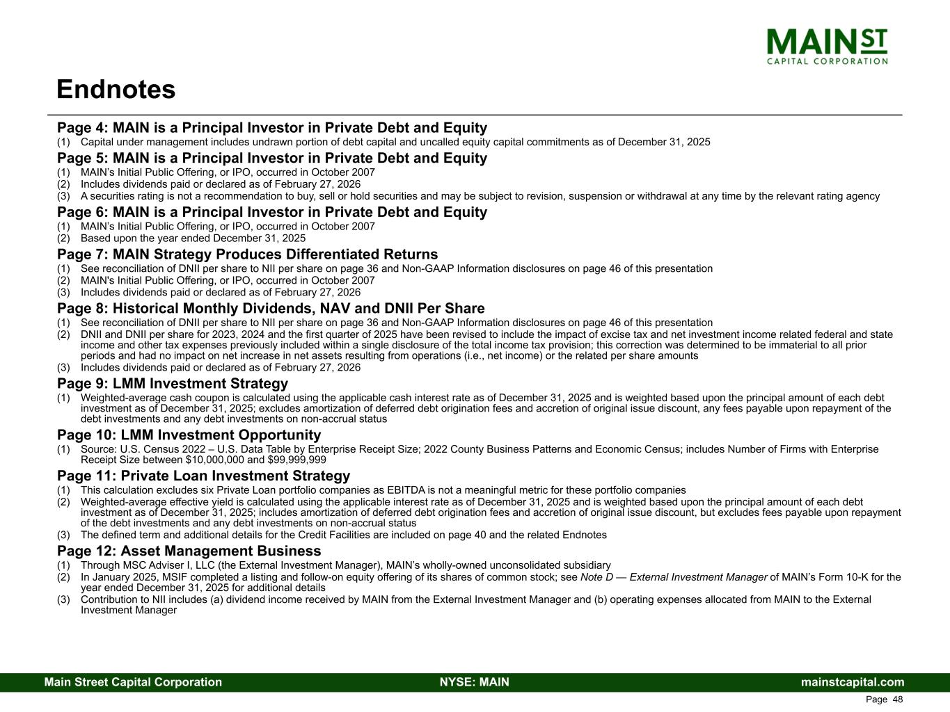 mainstcapital.comNYSE: MAINMain Street Capital Corporation www.mainstcapital.com Page 48 Page 4: MAIN is a Principal Investor in Private Debt and Equity (1) Capital under management includes undrawn portion of debt capital and uncalled equity capital commitments as of December 31, 2025 Page 5: MAIN is a Principal Investor in Private Debt and Equity (1) MAIN’s Initial Public Offering, or IPO, occurred in October 2007 (2) Includes dividends paid or declared as of February 27, 2026 (3) A securities rating is not a recommendation to buy, sell or hold securities and may be subject to revision, suspension or withdrawal at any time by the relevant rating agency Page 6: MAIN is a Principal Investor in Private Debt and Equity (1) MAIN’s Initial Public Offering, or IPO, occurred in October 2007 (2) Based upon the year ended December 31, 2025 Page 7: MAIN Strategy Produces Differentiated Returns (1) See reconciliation of DNII per share to NII per share on page 36 and Non-GAAP Information disclosures on page 46 of this presentation (2) MAIN's Initial Public Offering, or IPO, occurred in October 2007 (3) Includes dividends paid or declared as of February 27, 2026 Page 8: Historical Monthly Dividends, NAV and DNII Per Share (1) See reconciliation of DNII per share to NII per share on page 36 and Non-GAAP Information disclosures on page 46 of this presentation (2) DNII and DNII per share for 2023, 2024 and the first quarter of 2025 have been revised to include the impact of excise tax and net investment income related federal and state income and other tax expenses previously included within a single disclosure of the total income tax provision; this correction was determined to be immaterial to all prior periods and had no impact on net increase in net assets resulting from operations (i.e., net income) or the related per share amounts (3) Includes dividends paid or declared as of February 27, 2026 Page 9: LMM Investment Strategy (1) Weighted-average cash coupon is calculated using the applicable cash interest rate as of December 31, 2025 and is weighted based upon the principal amount of each debt investment as of December 31, 2025; excludes amortization of deferred debt origination fees and accretion of original issue discount, any fees payable upon repayment of the debt investments and any debt investments on non-accrual status Page 10: LMM Investment Opportunity (1) Source: U.S. Census 2022 – U.S. Data Table by Enterprise Receipt Size; 2022 County Business Patterns and Economic Census; includes Number of Firms with Enterprise Receipt Size between $10,000,000 and $99,999,999 Page 11: Private Loan Investment Strategy (1) This calculation excludes six Private Loan portfolio companies as EBITDA is not a meaningful metric for these portfolio companies (2) Weighted-average effective yield is calculated using the applicable interest rate as of December 31, 2025 and is weighted based upon the principal amount of each debt investment as of December 31, 2025; includes amortization of deferred debt origination fees and accretion of original issue discount, but excludes fees payable upon repayment of the debt investments and any debt investments on non-accrual status (3) The defined term and additional details for the Credit Facilities are included on page 40 and the related Endnotes Page 12: Asset Management Business (1) Through MSC Adviser I, LLC (the External Investment Manager), MAIN’s wholly-owned unconsolidated subsidiary (2) In January 2025, MSIF completed a listing and follow-on equity offering of its shares of common stock; see Note D — External Investment Manager of MAIN’s Form 10-K for the year ended December 31, 2025 for additional details (3) Contribution to NII includes (a) dividend income received by MAIN from the External Investment Manager and (b) operating expenses allocated from MAIN to the External Investment Manager Endnotes