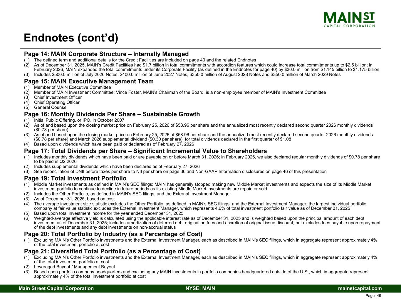 mainstcapital.comNYSE: MAINMain Street Capital Corporation www.mainstcapital.com Page 49 Page 14: MAIN Corporate Structure – Internally Managed (1) The defined term and additional details for the Credit Facilities are included on page 40 and the related Endnotes (2) As of December 31, 2025, MAIN’s Credit Facilities had $1.7 billion in total commitments with accordion features which could increase total commitments up to $2.5 billion; in February 2026, MAIN expanded the total commitments under its Corporate Facility (as defined in the Endnotes for page 40) by $30.0 million from $1.145 billion to $1.175 billion (3) Includes $500.0 million of July 2026 Notes, $400.0 million of June 2027 Notes, $350.0 million of August 2028 Notes and $350.0 million of March 2029 Notes Page 15: MAIN Executive Management Team (1) Member of MAIN Executive Committee (2) Member of MAIN Investment Committee; Vince Foster, MAIN’s Chairman of the Board, is a non-employee member of MAIN’s Investment Committee (3) Chief Investment Officer (4) Chief Operating Officer (5) General Counsel Page 16: Monthly Dividends Per Share – Sustainable Growth (1) Initial Public Offering, or IPO, in October 2007 (2) As of and based upon the closing market price on February 25, 2026 of $58.96 per share and the annualized most recently declared second quarter 2026 monthly dividends ($0.78 per share) (3) As of and based upon the closing market price on February 25, 2026 of $58.96 per share and the annualized most recently declared second quarter 2026 monthly dividends ($0.78 per share) and March 2026 supplemental dividend ($0.30 per share), for total dividends declared in the first quarter of $1.08 (4) Based upon dividends which have been paid or declared as of February 27, 2026 Page 17: Total Dividends per Share – Significant Incremental Value to Shareholders (1) Includes monthly dividends which have been paid or are payable on or before March 31, 2026; in February 2026, we also declared regular monthly dividends of $0.78 per share to be paid in Q2 2026 (2) Includes supplemental dividends which have been declared as of February 27, 2026 (3) See reconciliation of DNII before taxes per share to NII per share on page 36 and Non-GAAP Information disclosures on page 46 of this presentation Page 19: Total Investment Portfolio (1) Middle Market investments as defined in MAIN’s SEC filings; MAIN has generally stopped making new Middle Market investments and expects the size of its Middle Market investment portfolio to continue to decline in future periods as its existing Middle Market investments are repaid or sold (2) Includes the Other Portfolio, as defined in MAIN’s SEC filings, and the External Investment Manager (3) As of December 31, 2025; based on cost (4) The average investment size statistic excludes the Other Portfolio, as defined in MAIN’s SEC filings, and the External Investment Manager; the largest individual portfolio company at fair value statistic excludes the External Investment Manager, which represents 4.6% of total investment portfolio fair value as of December 31, 2025 (5) Based upon total investment income for the year ended December 31, 2025 (6) Weighted-average effective yield is calculated using the applicable interest rate as of December 31, 2025 and is weighted based upon the principal amount of each debt investment as of December 31, 2025; includes amortization of deferred debt origination fees and accretion of original issue discount, but excludes fees payable upon repayment of the debt investments and any debt investments on non-accrual status Page 20: Total Portfolio by Industry (as a Percentage of Cost) (1) Excluding MAIN’s Other Portfolio investments and the External Investment Manager, each as described in MAIN’s SEC filings, which in aggregate represent approximately 4% of the total investment portfolio at cost Page 21: Diversified Total Portfolio (as a Percentage of Cost) (1) Excluding MAIN’s Other Portfolio investments and the External Investment Manager, each as described in MAIN’s SEC filings, which in aggregate represent approximately 4% of the total investment portfolio at cost (2) Leveraged Buyout / Management Buyout (3) Based upon portfolio company headquarters and excluding any MAIN investments in portfolio companies headquartered outside of the U.S., which in aggregate represent approximately 4% of the total investment portfolio at cost Endnotes (cont’d)