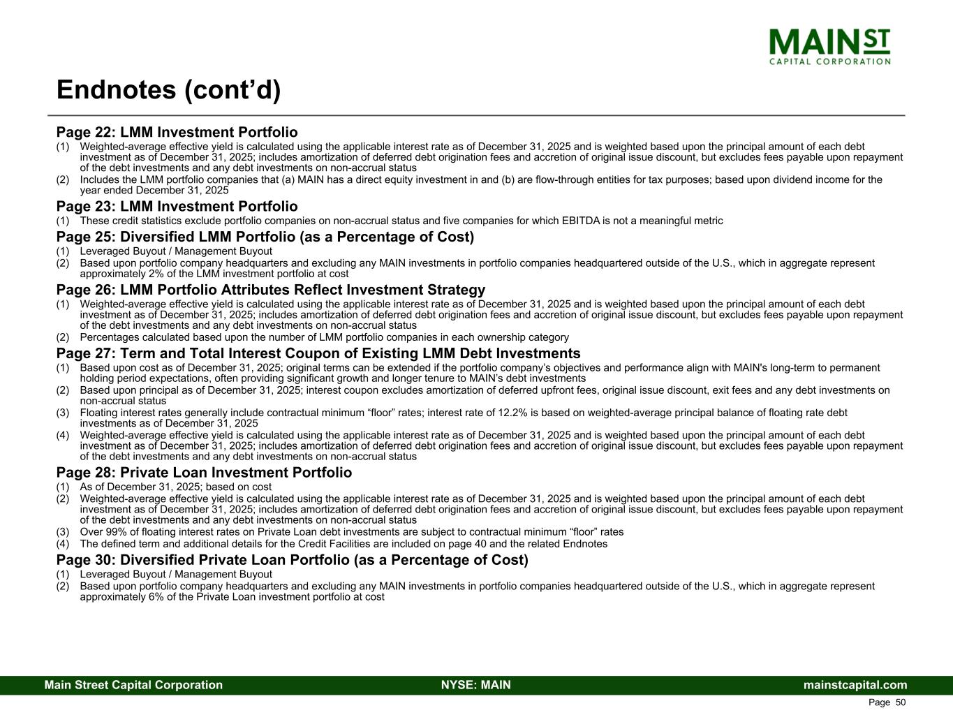 mainstcapital.comNYSE: MAINMain Street Capital Corporation www.mainstcapital.com Page 50 Page 22: LMM Investment Portfolio (1) Weighted-average effective yield is calculated using the applicable interest rate as of December 31, 2025 and is weighted based upon the principal amount of each debt investment as of December 31, 2025; includes amortization of deferred debt origination fees and accretion of original issue discount, but excludes fees payable upon repayment of the debt investments and any debt investments on non-accrual status (2) Includes the LMM portfolio companies that (a) MAIN has a direct equity investment in and (b) are flow-through entities for tax purposes; based upon dividend income for the year ended December 31, 2025 Page 23: LMM Investment Portfolio (1) These credit statistics exclude portfolio companies on non-accrual status and five companies for which EBITDA is not a meaningful metric Page 25: Diversified LMM Portfolio (as a Percentage of Cost) (1) Leveraged Buyout / Management Buyout (2) Based upon portfolio company headquarters and excluding any MAIN investments in portfolio companies headquartered outside of the U.S., which in aggregate represent approximately 2% of the LMM investment portfolio at cost Page 26: LMM Portfolio Attributes Reflect Investment Strategy (1) Weighted-average effective yield is calculated using the applicable interest rate as of December 31, 2025 and is weighted based upon the principal amount of each debt investment as of December 31, 2025; includes amortization of deferred debt origination fees and accretion of original issue discount, but excludes fees payable upon repayment of the debt investments and any debt investments on non-accrual status (2) Percentages calculated based upon the number of LMM portfolio companies in each ownership category Page 27: Term and Total Interest Coupon of Existing LMM Debt Investments (1) Based upon cost as of December 31, 2025; original terms can be extended if the portfolio company’s objectives and performance align with MAIN's long-term to permanent holding period expectations, often providing significant growth and longer tenure to MAIN’s debt investments (2) Based upon principal as of December 31, 2025; interest coupon excludes amortization of deferred upfront fees, original issue discount, exit fees and any debt investments on non-accrual status (3) Floating interest rates generally include contractual minimum “floor” rates; interest rate of 12.2% is based on weighted-average principal balance of floating rate debt investments as of December 31, 2025 (4) Weighted-average effective yield is calculated using the applicable interest rate as of December 31, 2025 and is weighted based upon the principal amount of each debt investment as of December 31, 2025; includes amortization of deferred debt origination fees and accretion of original issue discount, but excludes fees payable upon repayment of the debt investments and any debt investments on non-accrual status Page 28: Private Loan Investment Portfolio (1) As of December 31, 2025; based on cost (2) Weighted-average effective yield is calculated using the applicable interest rate as of December 31, 2025 and is weighted based upon the principal amount of each debt investment as of December 31, 2025; includes amortization of deferred debt origination fees and accretion of original issue discount, but excludes fees payable upon repayment of the debt investments and any debt investments on non-accrual status (3) Over 99% of floating interest rates on Private Loan debt investments are subject to contractual minimum “floor” rates (4) The defined term and additional details for the Credit Facilities are included on page 40 and the related Endnotes Page 30: Diversified Private Loan Portfolio (as a Percentage of Cost) (1) Leveraged Buyout / Management Buyout (2) Based upon portfolio company headquarters and excluding any MAIN investments in portfolio companies headquartered outside of the U.S., which in aggregate represent approximately 6% of the Private Loan investment portfolio at cost Endnotes (cont’d)