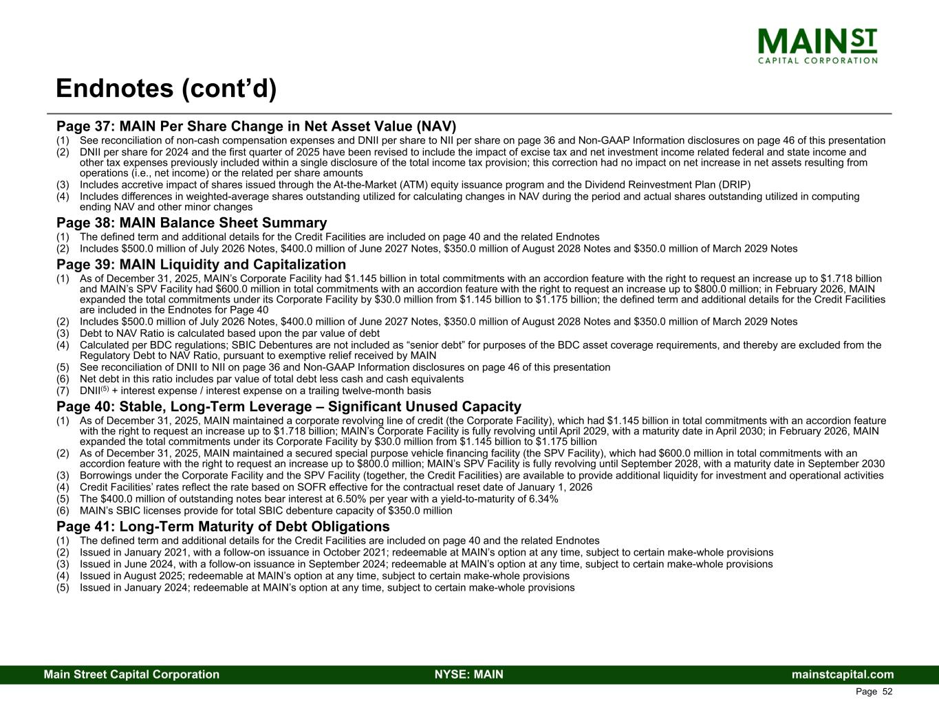 mainstcapital.comNYSE: MAINMain Street Capital Corporation www.mainstcapital.com Page 52 Endnotes (cont’d) Page 37: MAIN Per Share Change in Net Asset Value (NAV) (1) See reconciliation of non-cash compensation expenses and DNII per share to NII per share on page 36 and Non-GAAP Information disclosures on page 46 of this presentation (2) DNII per share for 2024 and the first quarter of 2025 have been revised to include the impact of excise tax and net investment income related federal and state income and other tax expenses previously included within a single disclosure of the total income tax provision; this correction had no impact on net increase in net assets resulting from operations (i.e., net income) or the related per share amounts (3) Includes accretive impact of shares issued through the At-the-Market (ATM) equity issuance program and the Dividend Reinvestment Plan (DRIP) (4) Includes differences in weighted-average shares outstanding utilized for calculating changes in NAV during the period and actual shares outstanding utilized in computing ending NAV and other minor changes Page 38: MAIN Balance Sheet Summary (1) The defined term and additional details for the Credit Facilities are included on page 40 and the related Endnotes (2) Includes $500.0 million of July 2026 Notes, $400.0 million of June 2027 Notes, $350.0 million of August 2028 Notes and $350.0 million of March 2029 Notes Page 39: MAIN Liquidity and Capitalization (1) As of December 31, 2025, MAIN’s Corporate Facility had $1.145 billion in total commitments with an accordion feature with the right to request an increase up to $1.718 billion and MAIN’s SPV Facility had $600.0 million in total commitments with an accordion feature with the right to request an increase up to $800.0 million; in February 2026, MAIN expanded the total commitments under its Corporate Facility by $30.0 million from $1.145 billion to $1.175 billion; the defined term and additional details for the Credit Facilities are included in the Endnotes for Page 40 (2) Includes $500.0 million of July 2026 Notes, $400.0 million of June 2027 Notes, $350.0 million of August 2028 Notes and $350.0 million of March 2029 Notes (3) Debt to NAV Ratio is calculated based upon the par value of debt (4) Calculated per BDC regulations; SBIC Debentures are not included as “senior debt” for purposes of the BDC asset coverage requirements, and thereby are excluded from the Regulatory Debt to NAV Ratio, pursuant to exemptive relief received by MAIN (5) See reconciliation of DNII to NII on page 36 and Non-GAAP Information disclosures on page 46 of this presentation (6) Net debt in this ratio includes par value of total debt less cash and cash equivalents (7) DNII(5) + interest expense / interest expense on a trailing twelve-month basis Page 40: Stable, Long-Term Leverage – Significant Unused Capacity (1) As of December 31, 2025, MAIN maintained a corporate revolving line of credit (the Corporate Facility), which had $1.145 billion in total commitments with an accordion feature with the right to request an increase up to $1.718 billion; MAIN’s Corporate Facility is fully revolving until April 2029, with a maturity date in April 2030; in February 2026, MAIN expanded the total commitments under its Corporate Facility by $30.0 million from $1.145 billion to $1.175 billion (2) As of December 31, 2025, MAIN maintained a secured special purpose vehicle financing facility (the SPV Facility), which had $600.0 million in total commitments with an accordion feature with the right to request an increase up to $800.0 million; MAIN’s SPV Facility is fully revolving until September 2028, with a maturity date in September 2030 (3) Borrowings under the Corporate Facility and the SPV Facility (together, the Credit Facilities) are available to provide additional liquidity for investment and operational activities (4) Credit Facilities’ rates reflect the rate based on SOFR effective for the contractual reset date of January 1, 2026 (5) The $400.0 million of outstanding notes bear interest at 6.50% per year with a yield-to-maturity of 6.34% (6) MAIN’s SBIC licenses provide for total SBIC debenture capacity of $350.0 million Page 41: Long-Term Maturity of Debt Obligations (1) The defined term and additional details for the Credit Facilities are included on page 40 and the related Endnotes (2) Issued in January 2021, with a follow-on issuance in October 2021; redeemable at MAIN’s option at any time, subject to certain make-whole provisions (3) Issued in June 2024, with a follow-on issuance in September 2024; redeemable at MAIN’s option at any time, subject to certain make-whole provisions (4) Issued in August 2025; redeemable at MAIN’s option at any time, subject to certain make-whole provisions (5) Issued in January 2024; redeemable at MAIN’s option at any time, subject to certain make-whole provisions