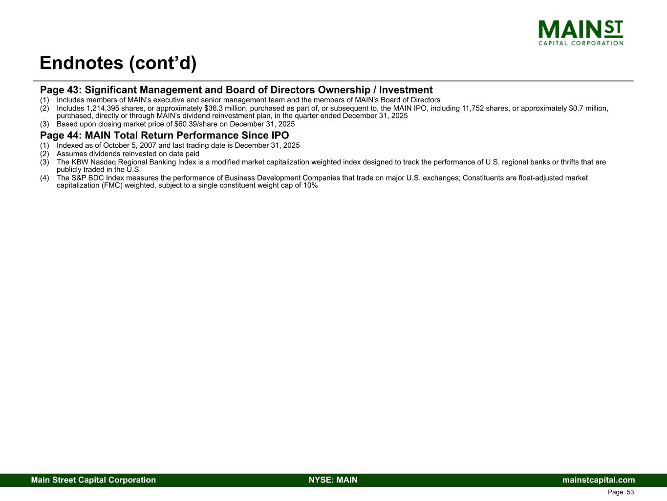 mainstcapital.comNYSE: MAINMain Street Capital Corporation www.mainstcapital.com Page 53 Endnotes (cont’d) Page 43: Significant Management and Board of Directors Ownership / Investment (1) Includes members of MAIN’s executive and senior management team and the members of MAIN’s Board of Directors (2) Includes 1,214,395 shares, or approximately $36.3 million, purchased as part of, or subsequent to, the MAIN IPO, including 11,752 shares, or approximately $0.7 million, purchased, directly or through MAIN’s dividend reinvestment plan, in the quarter ended December 31, 2025 (3) Based upon closing market price of $60.39/share on December 31, 2025 Page 44: MAIN Total Return Performance Since IPO (1) Indexed as of October 5, 2007 and last trading date is December 31, 2025 (2) Assumes dividends reinvested on date paid (3) The KBW Nasdaq Regional Banking Index is a modified market capitalization weighted index designed to track the performance of U.S. regional banks or thrifts that are publicly traded in the U.S. (4) The S&P BDC Index measures the performance of Business Development Companies that trade on major U.S. exchanges; Constituents are float-adjusted market capitalization (FMC) weighted, subject to a single constituent weight cap of 10%