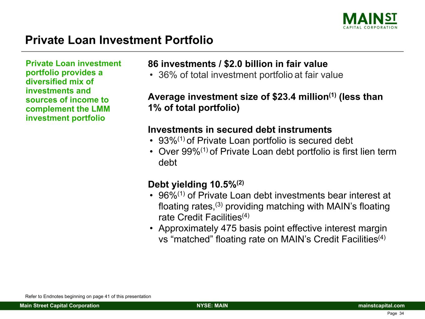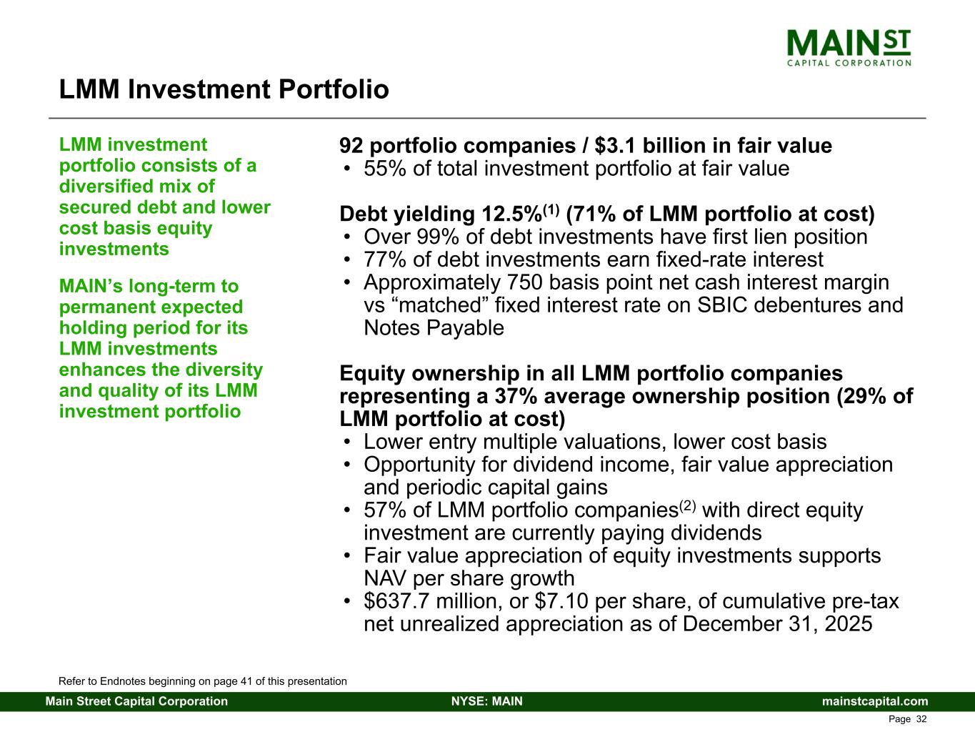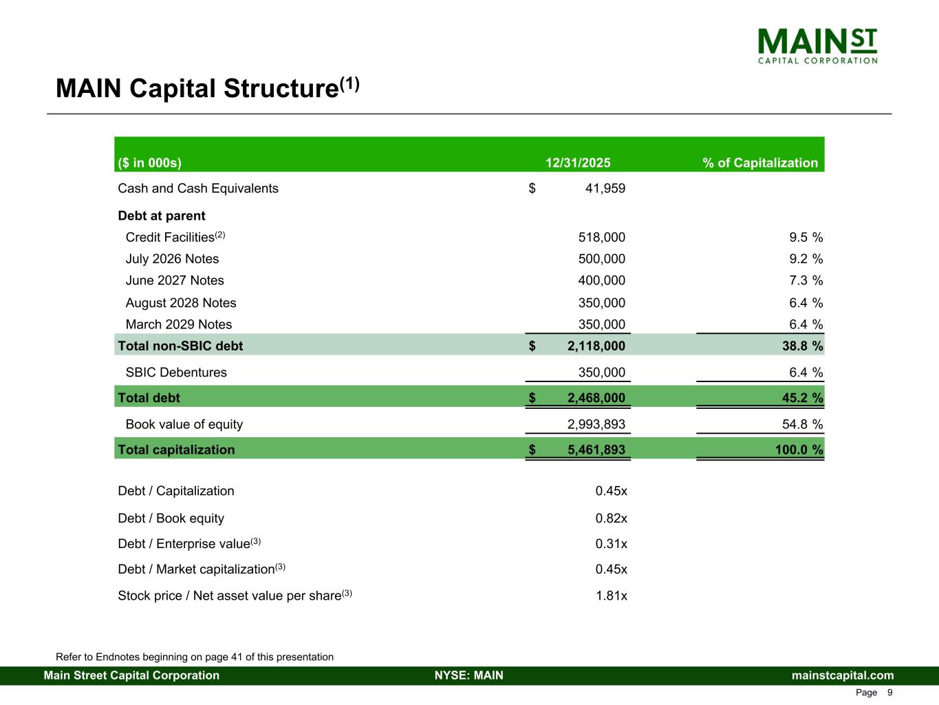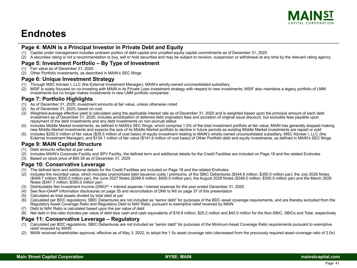 mainstcapital.comNYSE: MAINMain Street Capital Corporation www.mainstcapital.com Page 39 MAIN Balance Sheet Summary ($ in 000s, except per share amounts) Q4 24 Q1 25 Q2 25 Q3 25 Q4 25 LMM Portfolio Investments $ 2,502,872 $ 2,610,960 $ 2,668,844 $ 2,782,192 $ 3,057,023 Private Loan Portfolio Investments 1,904,324 1,942,178 1,920,257 1,886,453 1,988,438 Middle Market Portfolio Investments 155,329 128,317 108,705 89,932 83,498 Other Portfolio Investments 124,144 134,514 122,664 122,846 134,138 External Investment Manager 246,000 238,170 272,600 266,350 255,020 Cash and Cash Equivalents 78,251 109,180 86,984 30,568 41,959 Other Assets 110,421 110,066 107,712 104,593 121,625 Total Assets $ 5,121,341 $ 5,273,385 $ 5,287,766 $ 5,282,934 $ 5,681,701 Credit Facilities(1) $ 384,000 $ 514,000 $ 477,000 $ 211,000 $ 518,000 SBIC Debentures 343,417 343,711 344,005 344,299 344,593 Notes Payable(2) 1,394,954 1,395,468 1,395,979 1,594,469 1,595,001 Other Liabilities 201,132 180,073 186,565 198,591 230,214 Net Asset Value (NAV) 2,797,838 2,840,133 2,884,217 2,934,575 2,993,893 Total Liabilities and Net Assets $ 5,121,341 $ 5,273,385 $ 5,287,766 $ 5,282,934 $ 5,681,701 Total Portfolio Fair Value as % of Cost 116 % 118 % 117 % 118 % 117 % Common Stock Price Data: High Close $ 58.58 $ 63.10 $ 59.32 $ 67.54 $ 63.97 Low Close 49.95 54.71 49.15 59.28 55.10 Quarter End Close 58.58 56.56 59.10 63.59 60.39 Refer to Endnotes beginning on page 41 of this presentation