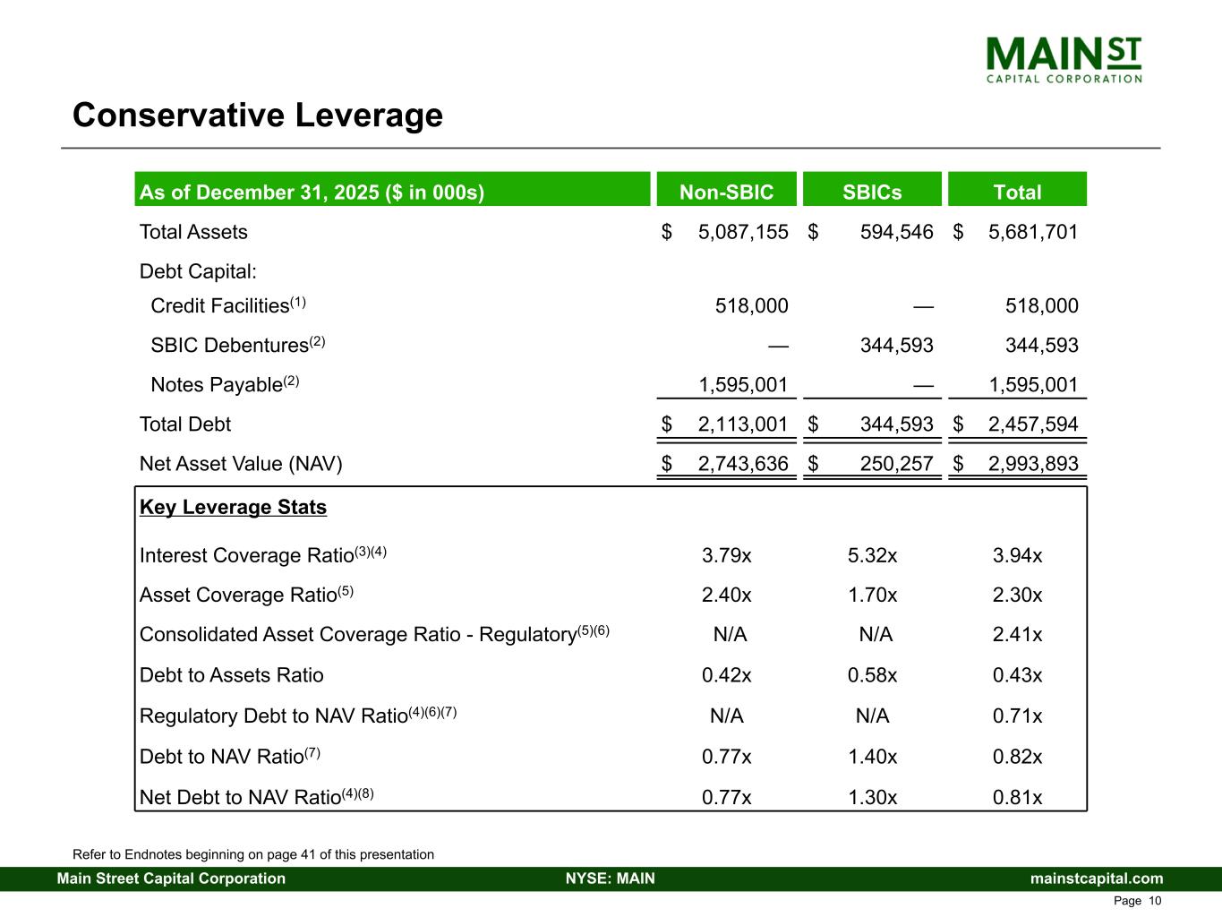 mainstcapital.comNYSE: MAINMain Street Capital Corporation www.mainstcapital.com Page 9 MAIN Capital Structure(1) ($ in 000s) 12/31/2025 % of Capitalization Cash and Cash Equivalents $ 41,959 Debt at parent Credit Facilities(2) 518,000 9.5 % July 2026 Notes 500,000 9.2 % June 2027 Notes 400,000 7.3 % August 2028 Notes 350,000 6.4 % March 2029 Notes 350,000 6.4 % Total non-SBIC debt $ 2,118,000 38.8 % SBIC Debentures 350,000 6.4 % Total debt $ 2,468,000 45.2 % Book value of equity 2,993,893 54.8 % Total capitalization $ 5,461,893 100.0 % Debt / Capitalization 0.45x Debt / Book equity 0.82x Debt / Enterprise value(3) 0.31x Debt / Market capitalization(3) 0.45x Stock price / Net asset value per share(3) 1.81x Refer to Endnotes beginning on page 41 of this presentation