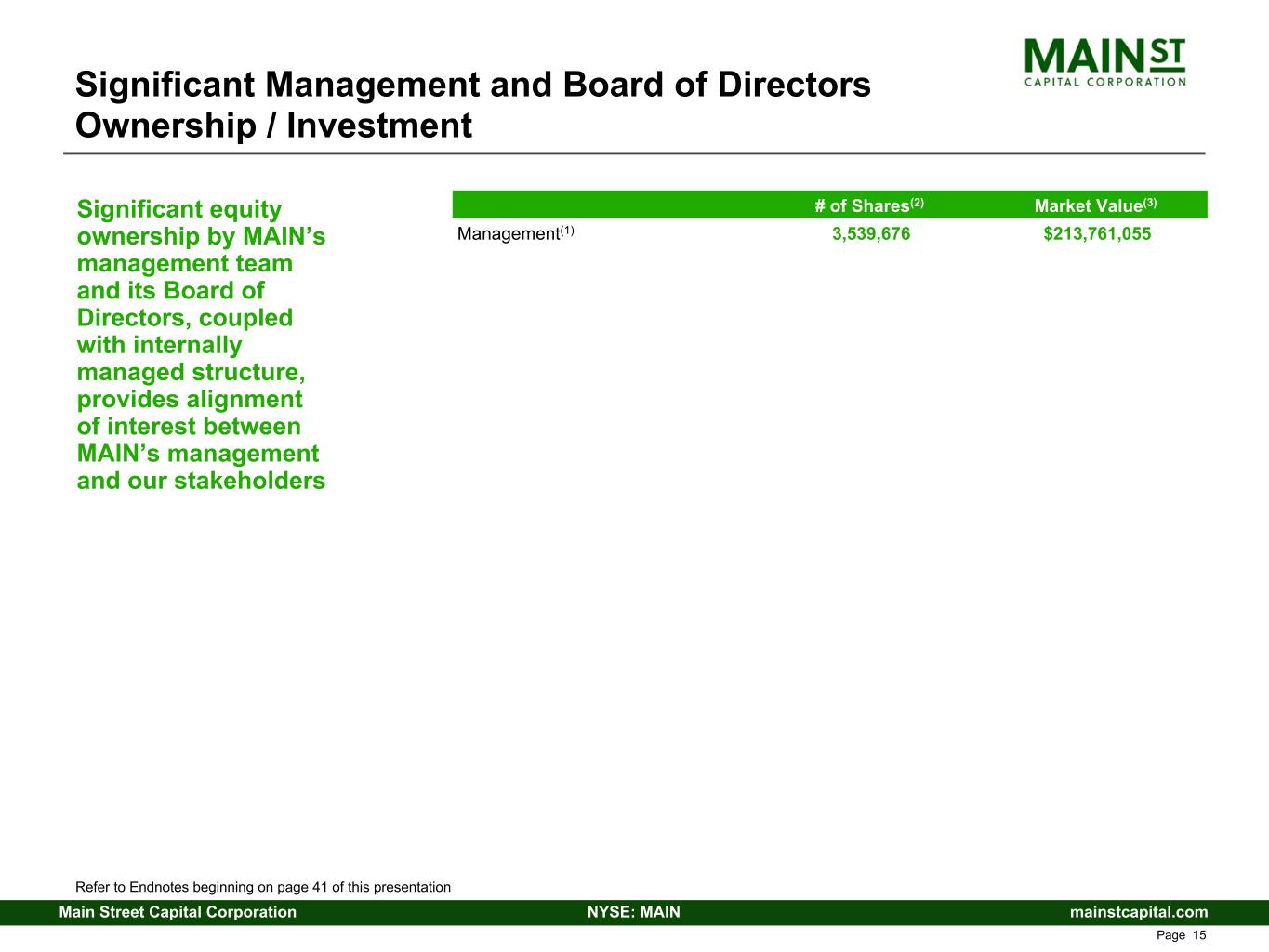 mainstcapital.comNYSE: MAINMain Street Capital Corporation www.mainstcapital.com Page 14 David Magdol(1)(2) President and CIO(3) Jesse Morris(1) EVP, COO(4) and Senior Managing Director • Co-founded MAIN in 2002; affiliated with Main Street group since 1999 • Director of Acquisitions & Integration with Quanta Services (NYSE: PWR) • Manager with a Big 5 Accounting Firm’s audit and transaction services groups Dwayne Hyzak(1)(2) CEO Jason Beauvais, JD(1) EVP, GC(5) and Secretary • Joined MAIN in 2008 • Attorney for Occidental Petroleum Corporation (NYSE: OXY) • Associate in the corporate and securities section at Baker Botts LLP • Joined MAIN in 2019 • Executive Vice President with Quanta Services (NYSE: PWR) • Vice President and CFO Foodservice Operations with Sysco Corporation (NYSE: SYY) • Manager with a Big 5 Accounting Firm • Co-founded MAIN in 2002 • Vice President in Lazard Freres Investment Banking Division • Vice President of McMullen Group (John J. McMullen’s Family Office) Ryan Nelson CFO • Joined MAIN in 2022 • Vice President and Chief Accounting Officer with Conn’s, Inc. • Director of Operations Accounting with EnLink Midstream Partners • Senior Associate with a Big 4 Accounting Firm MAIN Executive Management Team Refer to Endnotes beginning on page 41 of this presentation