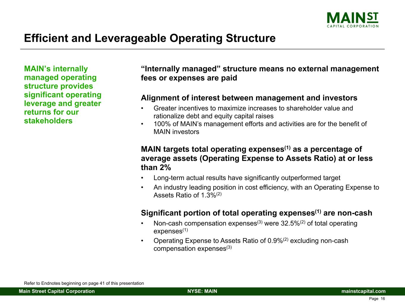 mainstcapital.comNYSE: MAINMain Street Capital Corporation www.mainstcapital.com Page 15 Significant equity ownership by MAIN’s management team and its Board of Directors, coupled with internally managed structure, provides alignment of interest between MAIN’s management and our stakeholders # of Shares(2) Market Value(3) Management(1) 3,539,676 $213,761,055 Significant Management and Board of Directors Ownership / Investment Refer to Endnotes beginning on page 41 of this presentation