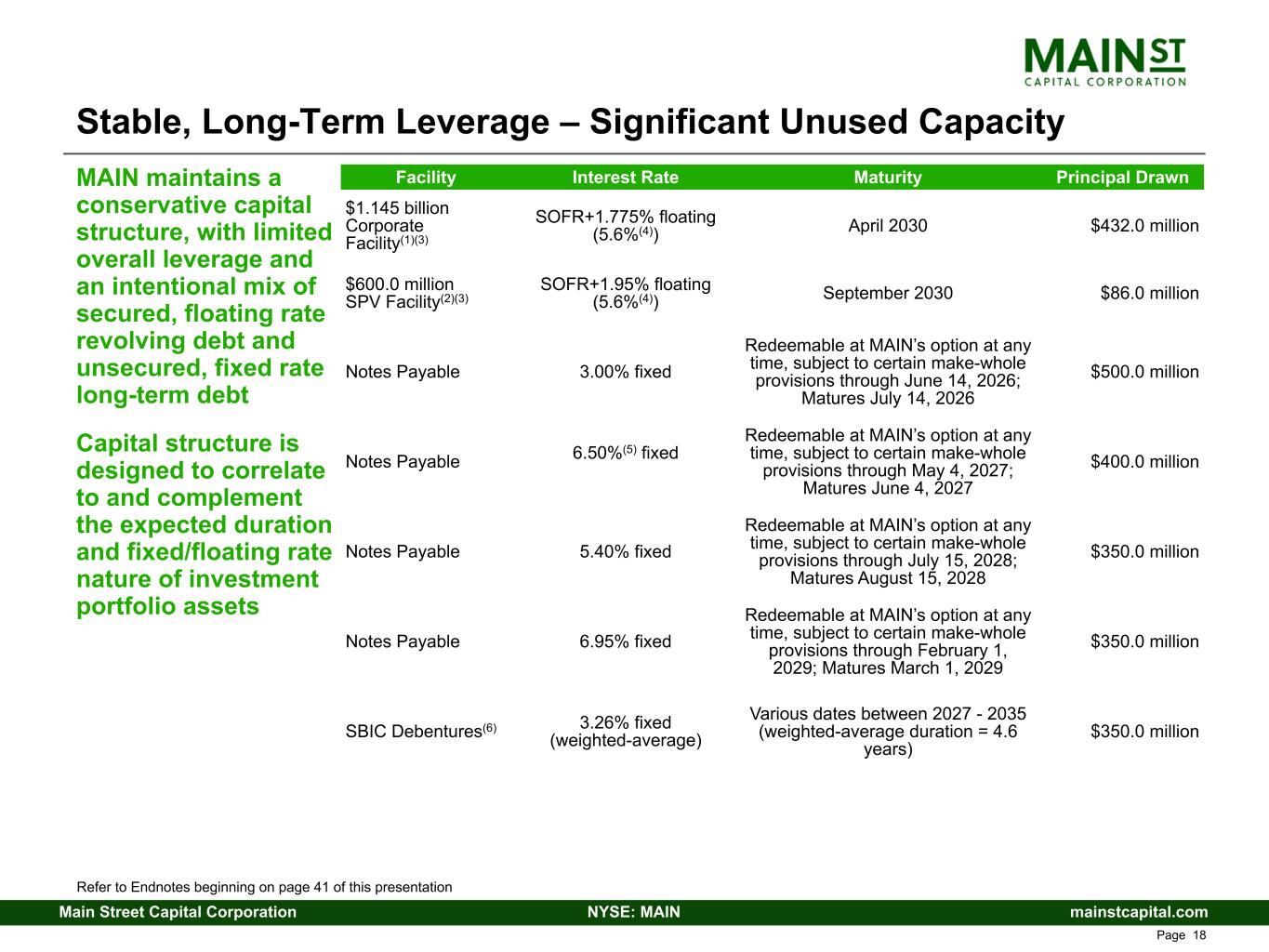 mainstcapital.comNYSE: MAINMain Street Capital Corporation www.mainstcapital.com Page 40 Stable, Long-Term Leverage – Significant Unused Capacity MAIN maintains a conservative capital structure, with limited overall leverage and an intentional mix of secured, floating rate revolving debt and unsecured, fixed rate long-term debt Capital structure is designed to correlate to and complement the expected duration and fixed/floating rate nature of investment portfolio assets Facility Interest Rate Maturity Principal Drawn $1.145 billion Corporate Facility(1)(3) SOFR+1.775% floating (5.6%(4)) April 2030 $432.0 million $600.0 million SPV Facility(2)(3) SOFR+1.95% floating (5.6%(4)) September 2030 $86.0 million Notes Payable 3.00% fixed Redeemable at MAIN’s option at any time, subject to certain make-whole provisions through June 14, 2026; Matures July 14, 2026 $500.0 million Notes Payable 6.50%(5) fixed Redeemable at MAIN’s option at any time, subject to certain make-whole provisions through May 4, 2027; Matures June 4, 2027 $400.0 million Notes Payable 5.40% fixed Redeemable at MAIN’s option at any time, subject to certain make-whole provisions through July 15, 2028; Matures August 15, 2028 $350.0 million Notes Payable 6.95% fixed Redeemable at MAIN’s option at any time, subject to certain make-whole provisions through February 1, 2029; Matures March 1, 2029 $350.0 million SBIC Debentures(6) 3.26% fixed (weighted-average) Various dates between 2027 - 2035 (weighted-average duration = 4.6 years) $350.0 million Refer to Endnotes beginning on page 48 of this presentation