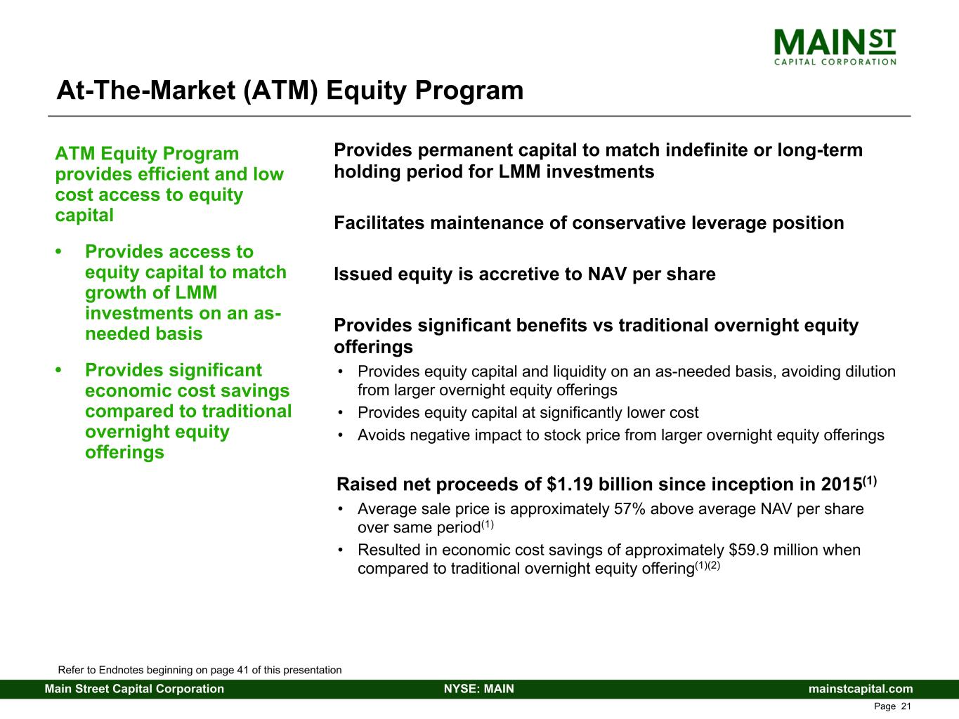mainstcapital.comNYSE: MAINMain Street Capital Corporation www.mainstcapital.com Page 20 Basis Point Increase (Decrease) in Interest Rate Increase (Decrease) in Interest Income (Increase) Decrease in Interest Expense(3) Increase (Decrease) in NII from the External Investment Manager(4) Increase (Decrease) in NII Increase (Decrease) in NII per Share(5) (100) $ (22,941) $ 5,180 $ (513) $ (18,274) $ (0.20) (75) (17,205) 3,885 (385) (13,705) (0.15) (50) (11,470) 2,590 (256) (9,136) (0.10) (25) (5,735) 1,295 (128) (4,568) (0.05) 25 5,691 (1,295) 127 4,523 0.05 50 11,231 (2,590) 250 8,891 0.10 75 16,727 (3,885) 371 13,213 0.15 100 22,223 (5,180) 645 17,688 0.20 MAIN’s financial results are subject to impact from changes in interest rates; MAIN’s capital structure includes a majority of fixed rate debt obligations, while MAIN’s investment portfolio includes a majority of floating rate debt investments with minimum interest rate floors – 79% of MAIN’s outstanding debt obligations have fixed interest rates(6) – 62% of MAIN’s debt investments bear interest at floating rates,(6) the majority of which contain contractual minimum index rates, or “interest rate floors” (weighted-average floor of approximately 130 basis points)(7) – Results in increases in net investment income if market interest rates increase, and reductions to net investment income if market interest rates decrease (1) Assumes no changes in the portfolio investments or outstanding debt obligations existing as of December 31, 2025 (2) Assumes that all SOFR and Prime rates would change effective immediately on the first day of the period; however, the actual contractual index rate reset dates will vary in future periods generally on either a monthly or quarterly basis across both our debt investments and our Credit Facilities (as defined in the Endnotes for page 18) resulting in a delay in the realization of the increases or decreases in interest income or expense (3) The hypothetical (increase) decrease in interest expense would be impacted by the changes in the amount of debt outstanding under our Credit Facilities, with interest expense (increasing) decreasing as the debt outstanding under our Credit Facilities increases (decreases) (4) The NII contribution from the External Investment Manager is based on the performance of the assets managed by the External Investment Manager which may fluctuate due to changes in interest rates and other factors impacting the return on such managed assets; this change in NII contribution only represents the impact of interest rate changes and assumes no change to all other factors (5) Per share amount is calculated using shares outstanding as of December 31, 2025 (6) As of December 31, 2025, based on par (7) Weighted-average interest rate floor calculated based on debt principal balances as of December 31, 2025 Although we believe that this analysis is indicative of the impact of interest rate changes to our NII as of December 31, 2025, the analysis does not take into consideration future changes in the credit market, credit quality or other business or economic developments that could affect our NII. Accordingly, we can offer no assurances that actual results would not differ materially from the analysis above. The following table illustrates the approximate annual changes in the components of MAIN’s net investment income (NII) due to hypothetical increases (decreases) in interest rates(1)(2) (dollars in thousands, except per share data): Interest Rate Impact and Sensitivity