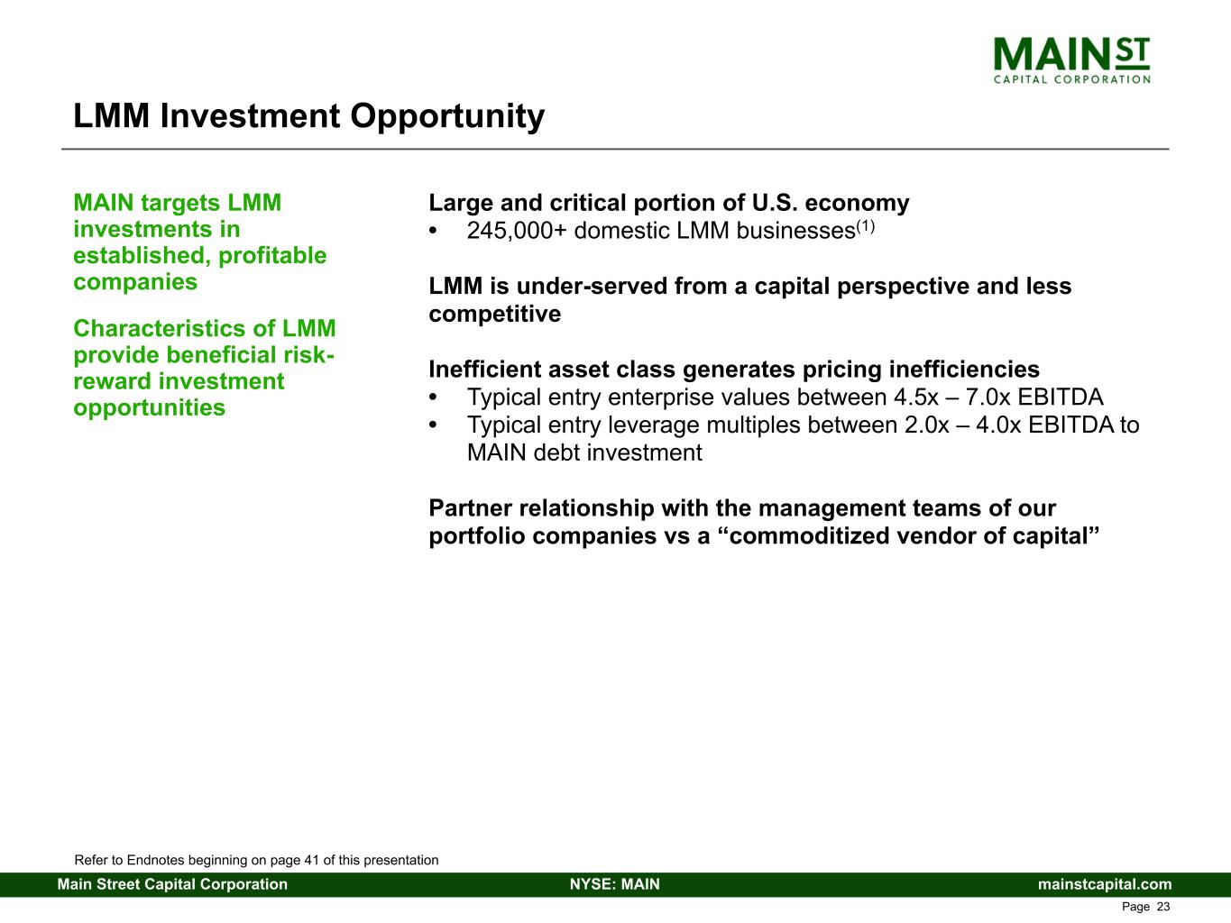 mainstcapital.comNYSE: MAINMain Street Capital Corporation www.mainstcapital.com Page 22 LMM Investment Strategy Investment Objectives • Attractive cash yield from secured debt investments (12.3%(1) weighted-average cash coupon as of December 31, 2025); plus • Dividend income, fair value appreciation and periodic capital gains from equity investments Investments are structured for (i) protection of capital, (ii) high recurring income and (iii) meaningful capital gain opportunity Focus on self-sponsored, “one-stop” financing opportunities • Partner with business owners, management teams and entrepreneurs • Provide highly customized financing solutions • Recapitalization, buyout, growth and acquisition capital • Extensive network of grass roots referral sources • Strong and growing “Main Street” brand recognition / reputation Investments have low correlation to the broader debt and equity markets and attractive risk-adjusted returns Unique LMM strategy, combined with MAIN’s perpetual capital structure and goal to be long-term partners, results in a highly diversified and high-quality investment portfolio LMM investment strategy differentiates MAIN from its competitors and provides attractive risk- adjusted returns MAIN’s permanent capital structure as a publicly traded investment firm allows MAIN to maintain a long- term to permanent expected holding period for its LMM investments, providing significant benefits to both MAIN and our LMM portfolio companies Refer to Endnotes beginning on page 41 of this presentation