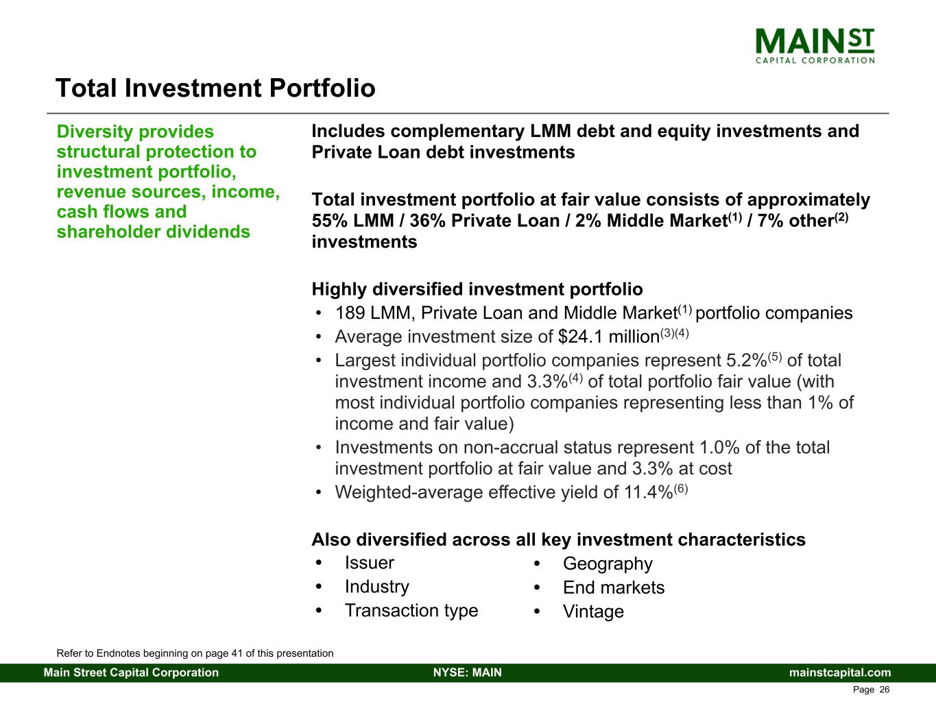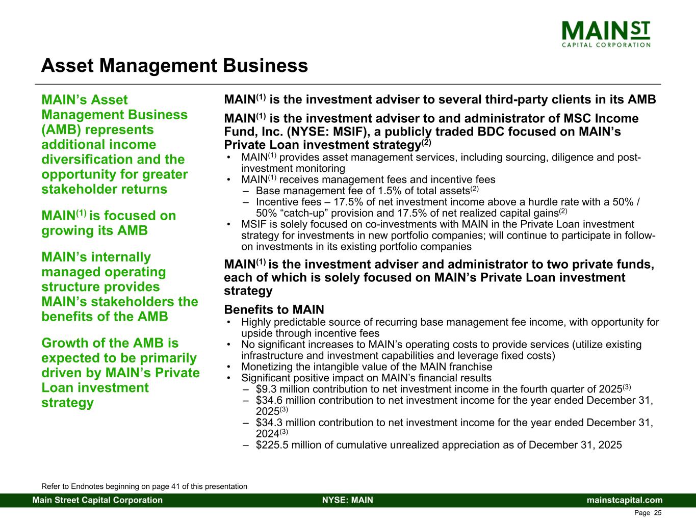 mainstcapital.comNYSE: MAINMain Street Capital Corporation www.mainstcapital.com Page 25 MAIN(1) is the investment adviser to several third-party clients in its AMB MAIN(1) is the investment adviser to and administrator of MSC Income Fund, Inc. (NYSE: MSIF), a publicly traded BDC focused on MAIN’s Private Loan investment strategy(2) • MAIN(1) provides asset management services, including sourcing, diligence and post- investment monitoring • MAIN(1) receives management fees and incentive fees – Base management fee of 1.5% of total assets(2) – Incentive fees – 17.5% of net investment income above a hurdle rate with a 50% / 50% “catch-up” provision and 17.5% of net realized capital gains(2) • MSIF is solely focused on co-investments with MAIN in the Private Loan investment strategy for investments in new portfolio companies; will continue to participate in follow- on investments in its existing portfolio companies MAIN(1) is the investment adviser and administrator to two private funds, each of which is solely focused on MAIN’s Private Loan investment strategy Benefits to MAIN • Highly predictable source of recurring base management fee income, with opportunity for upside through incentive fees • No significant increases to MAIN’s operating costs to provide services (utilize existing infrastructure and investment capabilities and leverage fixed costs) • Monetizing the intangible value of the MAIN franchise • Significant positive impact on MAIN’s financial results – $9.3 million contribution to net investment income in the fourth quarter of 2025(3) – $34.6 million contribution to net investment income for the year ended December 31, 2025(3) – $34.3 million contribution to net investment income for the year ended December 31, 2024(3) – $225.5 million of cumulative unrealized appreciation as of December 31, 2025 MAIN’s Asset Management Business (AMB) represents additional income diversification and the opportunity for greater stakeholder returns MAIN(1) is focused on growing its AMB MAIN’s internally managed operating structure provides MAIN’s stakeholders the benefits of the AMB Growth of the AMB is expected to be primarily driven by MAIN’s Private Loan investment strategy Refer to Endnotes beginning on page 41 of this presentation Asset Management Business