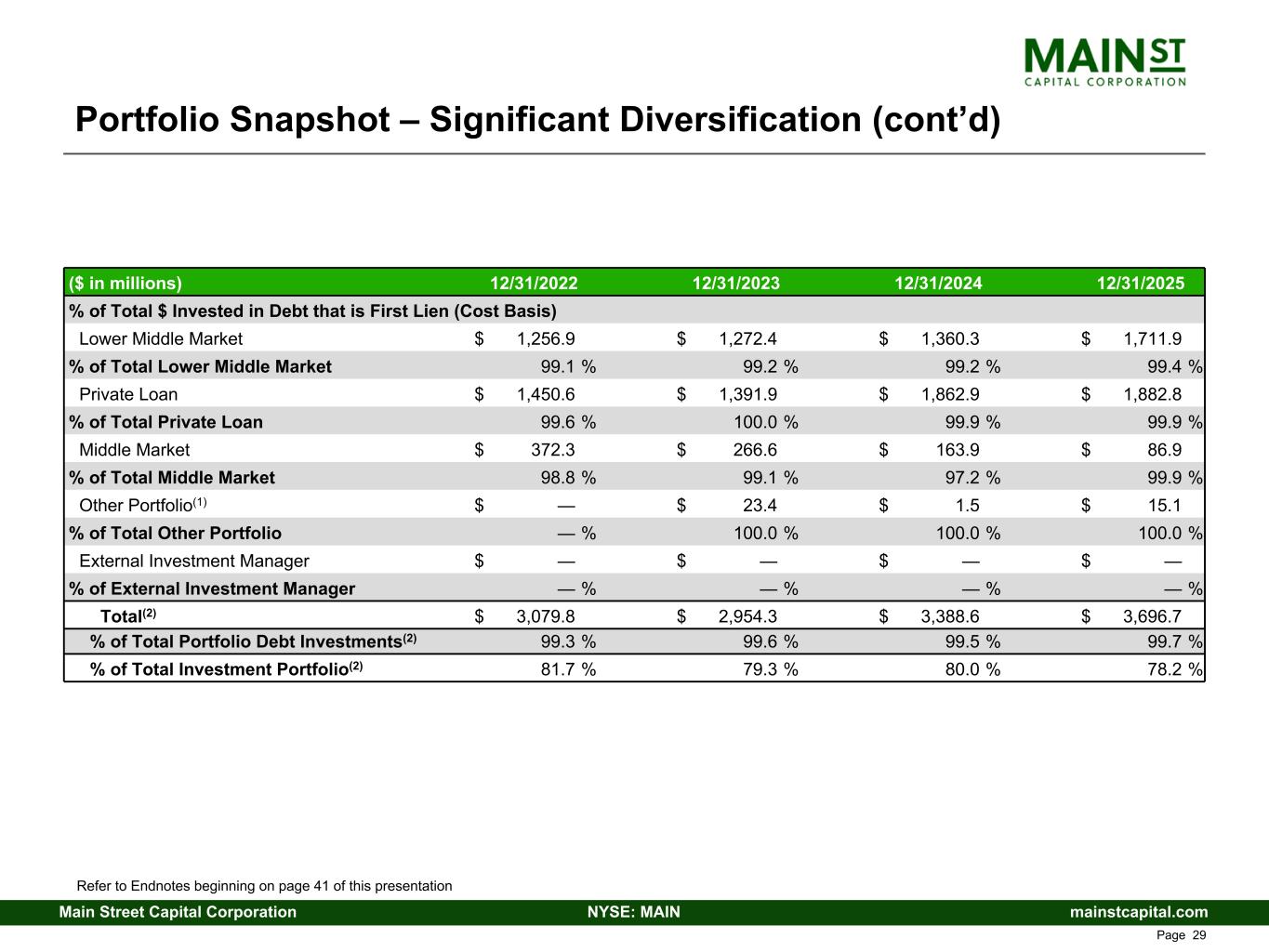 mainstcapital.comNYSE: MAINMain Street Capital Corporation www.mainstcapital.com Page 28 Portfolio Snapshot – Significant Diversification (cont’d) ($ in millions) 12/31/2022 12/31/2023 12/31/2024 12/31/2025 $ Invested - Fair Value Lower Middle Market $ 2,060.5 $ 2,273.0 $ 2,502.9 $ 3,057.0 % of Total 50.3 % 53.0 % 50.8 % 55.4 % Private Loan $ 1,471.5 $ 1,453.5 $ 1,904.3 $ 1,988.4 % of Total 35.9 % 33.9 % 38.6 % 36.1 % Middle Market $ 329.1 $ 243.7 $ 155.3 $ 83.5 % of Total 8.0 % 5.7 % 3.1 % 1.5 % Other Portfolio(1) $ 116.3 $ 142.0 $ 124.1 $ 134.1 % of Total 2.8 % 3.3 % 2.5 % 2.4 % External Investment Manager $ 122.9 $ 174.1 $ 246.0 $ 255.0 % of Total 3.0 % 4.1 % 5.0 % 4.6 % Total(2) $ 4,100.3 $ 4,286.3 $ 4,932.6 $ 5,518.1 % of Total $ Invested in Debt (Cost Basis) Lower Middle Market $ 1,267.7 $ 1,282.8 $ 1,371.3 $ 1,723.1 % of Total Lower Middle Market 73.7 % 72.0 % 70.8 % 71.2 % Private Loan $ 1,457.0 $ 1,391.9 $ 1,863.2 $ 1,882.9 % of Total Private Loan 97.1 % 94.7 % 95.4 % 93.5 % Middle Market $ 376.9 $ 269.2 $ 168.7 $ 87.0 % of Total Middle Market 93.8 % 91.4 % 86.5 % 72.4 % Other Portfolio(1) $ — $ 23.4 $ 1.5 $ 15.1 % of Total Other Portfolio — % 15.7 % 1.3 % 10.6 % External Investment Manager $ — $ — $ — $ — % of External Investment Manager — % — % — % — % Total(2) $ 3,101.6 $ 2,967.3 $ 3,404.7 $ 3,708.0 % of Total Investment Portfolio(2) 82.2 % 79.6 % 80.3 % 78.5 % Refer to Endnotes beginning on page 41 of this presentation