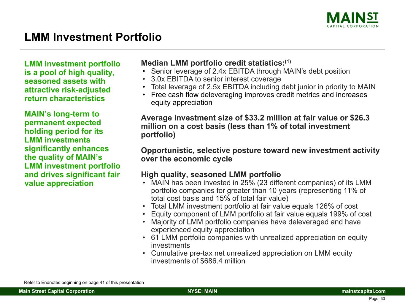 mainstcapital.comNYSE: MAINMain Street Capital Corporation www.mainstcapital.com Page 32 LMM Investment Portfolio 92 portfolio companies / $3.1 billion in fair value • 55% of total investment portfolio at fair value Debt yielding 12.5%(1) (71% of LMM portfolio at cost) • Over 99% of debt investments have first lien position • 77% of debt investments earn fixed-rate interest • Approximately 750 basis point net cash interest margin vs “matched” fixed interest rate on SBIC debentures and Notes Payable Equity ownership in all LMM portfolio companies representing a 37% average ownership position (29% of LMM portfolio at cost) • Lower entry multiple valuations, lower cost basis • Opportunity for dividend income, fair value appreciation and periodic capital gains • 57% of LMM portfolio companies(2) with direct equity investment are currently paying dividends • Fair value appreciation of equity investments supports NAV per share growth • $637.7 million, or $7.10 per share, of cumulative pre-tax net unrealized appreciation as of December 31, 2025 LMM investment portfolio consists of a diversified mix of secured debt and lower cost basis equity investments MAIN’s long-term to permanent expected holding period for its LMM investments enhances the diversity and quality of its LMM investment portfolio Refer to Endnotes beginning on page 41 of this presentation