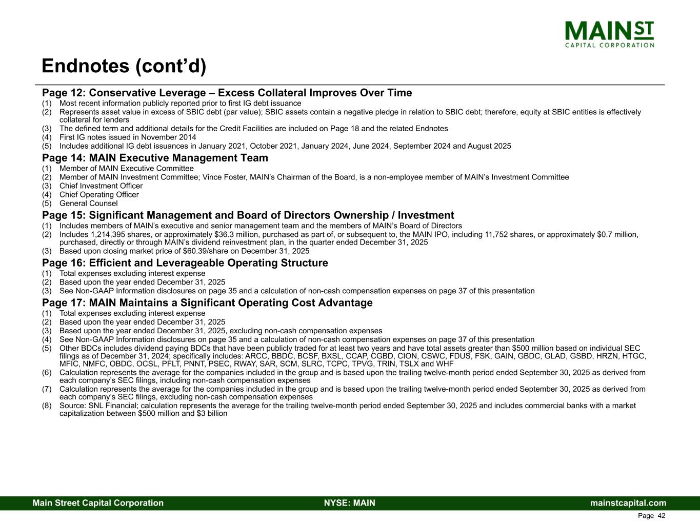 mainstcapital.comNYSE: MAINMain Street Capital Corporation www.mainstcapital.com Page 42 Page 12: Conservative Leverage – Excess Collateral Improves Over Time (1) Most recent information publicly reported prior to first IG debt issuance (2) Represents asset value in excess of SBIC debt (par value); SBIC assets contain a negative pledge in relation to SBIC debt; therefore, equity at SBIC entities is effectively collateral for lenders (3) The defined term and additional details for the Credit Facilities are included on Page 18 and the related Endnotes (4) First IG notes issued in November 2014 (5) Includes additional IG debt issuances in January 2021, October 2021, January 2024, June 2024, September 2024 and August 2025 Page 14: MAIN Executive Management Team (1) Member of MAIN Executive Committee (2) Member of MAIN Investment Committee; Vince Foster, MAIN’s Chairman of the Board, is a non-employee member of MAIN’s Investment Committee (3) Chief Investment Officer (4) Chief Operating Officer (5) General Counsel Page 15: Significant Management and Board of Directors Ownership / Investment (1) Includes members of MAIN’s executive and senior management team and the members of MAIN’s Board of Directors (2) Includes 1,214,395 shares, or approximately $36.3 million, purchased as part of, or subsequent to, the MAIN IPO, including 11,752 shares, or approximately $0.7 million, purchased, directly or through MAIN’s dividend reinvestment plan, in the quarter ended December 31, 2025 (3) Based upon closing market price of $60.39/share on December 31, 2025 Page 16: Efficient and Leverageable Operating Structure (1) Total expenses excluding interest expense (2) Based upon the year ended December 31, 2025 (3) See Non-GAAP Information disclosures on page 35 and a calculation of non-cash compensation expenses on page 37 of this presentation Page 17: MAIN Maintains a Significant Operating Cost Advantage (1) Total expenses excluding interest expense (2) Based upon the year ended December 31, 2025 (3) Based upon the year ended December 31, 2025, excluding non-cash compensation expenses (4) See Non-GAAP Information disclosures on page 35 and a calculation of non-cash compensation expenses on page 37 of this presentation (5) Other BDCs includes dividend paying BDCs that have been publicly traded for at least two years and have total assets greater than $500 million based on individual SEC filings as of December 31, 2024; specifically includes: ARCC, BBDC, BCSF, BXSL, CCAP, CGBD, CION, CSWC, FDUS, FSK, GAIN, GBDC, GLAD, GSBD, HRZN, HTGC, MFIC, NMFC, OBDC, OCSL, PFLT, PNNT, PSEC, RWAY, SAR, SCM, SLRC, TCPC, TPVG, TRIN, TSLX and WHF (6) Calculation represents the average for the companies included in the group and is based upon the trailing twelve-month period ended September 30, 2025 as derived from each company’s SEC filings, including non-cash compensation expenses (7) Calculation represents the average for the companies included in the group and is based upon the trailing twelve-month period ended September 30, 2025 as derived from each company’s SEC filings, excluding non-cash compensation expenses (8) Source: SNL Financial; calculation represents the average for the trailing twelve-month period ended September 30, 2025 and includes commercial banks with a market capitalization between $500 million and $3 billion Endnotes (cont’d)