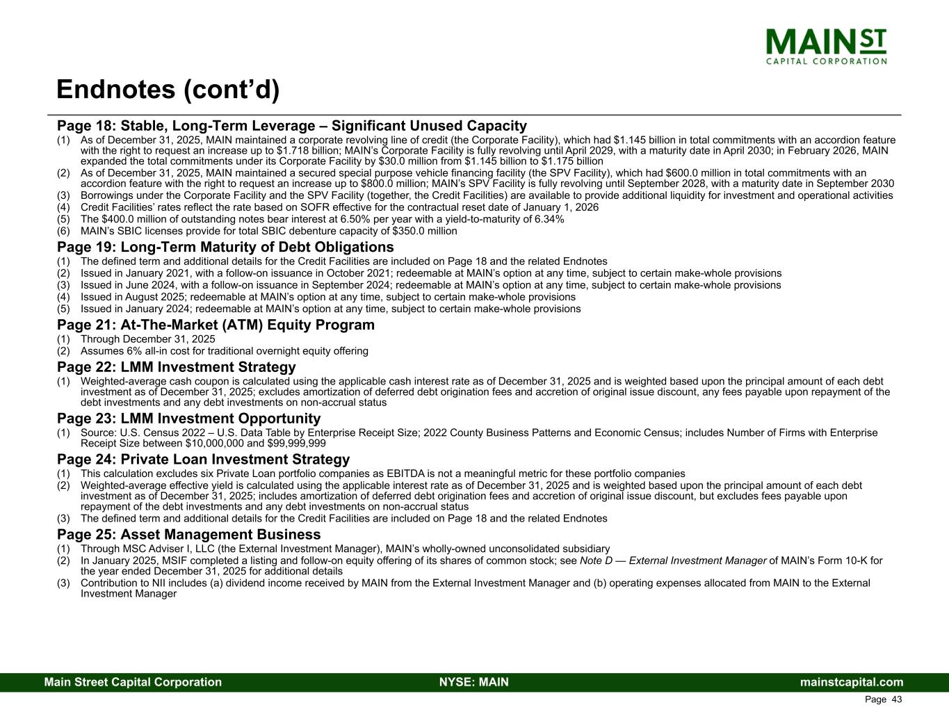mainstcapital.comNYSE: MAINMain Street Capital Corporation www.mainstcapital.com Page 43 Page 18: Stable, Long-Term Leverage – Significant Unused Capacity (1) As of December 31, 2025, MAIN maintained a corporate revolving line of credit (the Corporate Facility), which had $1.145 billion in total commitments with an accordion feature with the right to request an increase up to $1.718 billion; MAIN’s Corporate Facility is fully revolving until April 2029, with a maturity date in April 2030; in February 2026, MAIN expanded the total commitments under its Corporate Facility by $30.0 million from $1.145 billion to $1.175 billion (2) As of December 31, 2025, MAIN maintained a secured special purpose vehicle financing facility (the SPV Facility), which had $600.0 million in total commitments with an accordion feature with the right to request an increase up to $800.0 million; MAIN’s SPV Facility is fully revolving until September 2028, with a maturity date in September 2030 (3) Borrowings under the Corporate Facility and the SPV Facility (together, the Credit Facilities) are available to provide additional liquidity for investment and operational activities (4) Credit Facilities’ rates reflect the rate based on SOFR effective for the contractual reset date of January 1, 2026 (5) The $400.0 million of outstanding notes bear interest at 6.50% per year with a yield-to-maturity of 6.34% (6) MAIN’s SBIC licenses provide for total SBIC debenture capacity of $350.0 million Page 19: Long-Term Maturity of Debt Obligations (1) The defined term and additional details for the Credit Facilities are included on Page 18 and the related Endnotes (2) Issued in January 2021, with a follow-on issuance in October 2021; redeemable at MAIN’s option at any time, subject to certain make-whole provisions (3) Issued in June 2024, with a follow-on issuance in September 2024; redeemable at MAIN’s option at any time, subject to certain make-whole provisions (4) Issued in August 2025; redeemable at MAIN’s option at any time, subject to certain make-whole provisions (5) Issued in January 2024; redeemable at MAIN’s option at any time, subject to certain make-whole provisions Page 21: At-The-Market (ATM) Equity Program (1) Through December 31, 2025 (2) Assumes 6% all-in cost for traditional overnight equity offering Page 22: LMM Investment Strategy (1) Weighted-average cash coupon is calculated using the applicable cash interest rate as of December 31, 2025 and is weighted based upon the principal amount of each debt investment as of December 31, 2025; excludes amortization of deferred debt origination fees and accretion of original issue discount, any fees payable upon repayment of the debt investments and any debt investments on non-accrual status Page 23: LMM Investment Opportunity (1) Source: U.S. Census 2022 – U.S. Data Table by Enterprise Receipt Size; 2022 County Business Patterns and Economic Census; includes Number of Firms with Enterprise Receipt Size between $10,000,000 and $99,999,999 Page 24: Private Loan Investment Strategy (1) This calculation excludes six Private Loan portfolio companies as EBITDA is not a meaningful metric for these portfolio companies (2) Weighted-average effective yield is calculated using the applicable interest rate as of December 31, 2025 and is weighted based upon the principal amount of each debt investment as of December 31, 2025; includes amortization of deferred debt origination fees and accretion of original issue discount, but excludes fees payable upon repayment of the debt investments and any debt investments on non-accrual status (3) The defined term and additional details for the Credit Facilities are included on Page 18 and the related Endnotes Page 25: Asset Management Business (1) Through MSC Adviser I, LLC (the External Investment Manager), MAIN’s wholly-owned unconsolidated subsidiary (2) In January 2025, MSIF completed a listing and follow-on equity offering of its shares of common stock; see Note D — External Investment Manager of MAIN’s Form 10-K for the year ended December 31, 2025 for additional details (3) Contribution to NII includes (a) dividend income received by MAIN from the External Investment Manager and (b) operating expenses allocated from MAIN to the External Investment Manager Endnotes (cont’d)