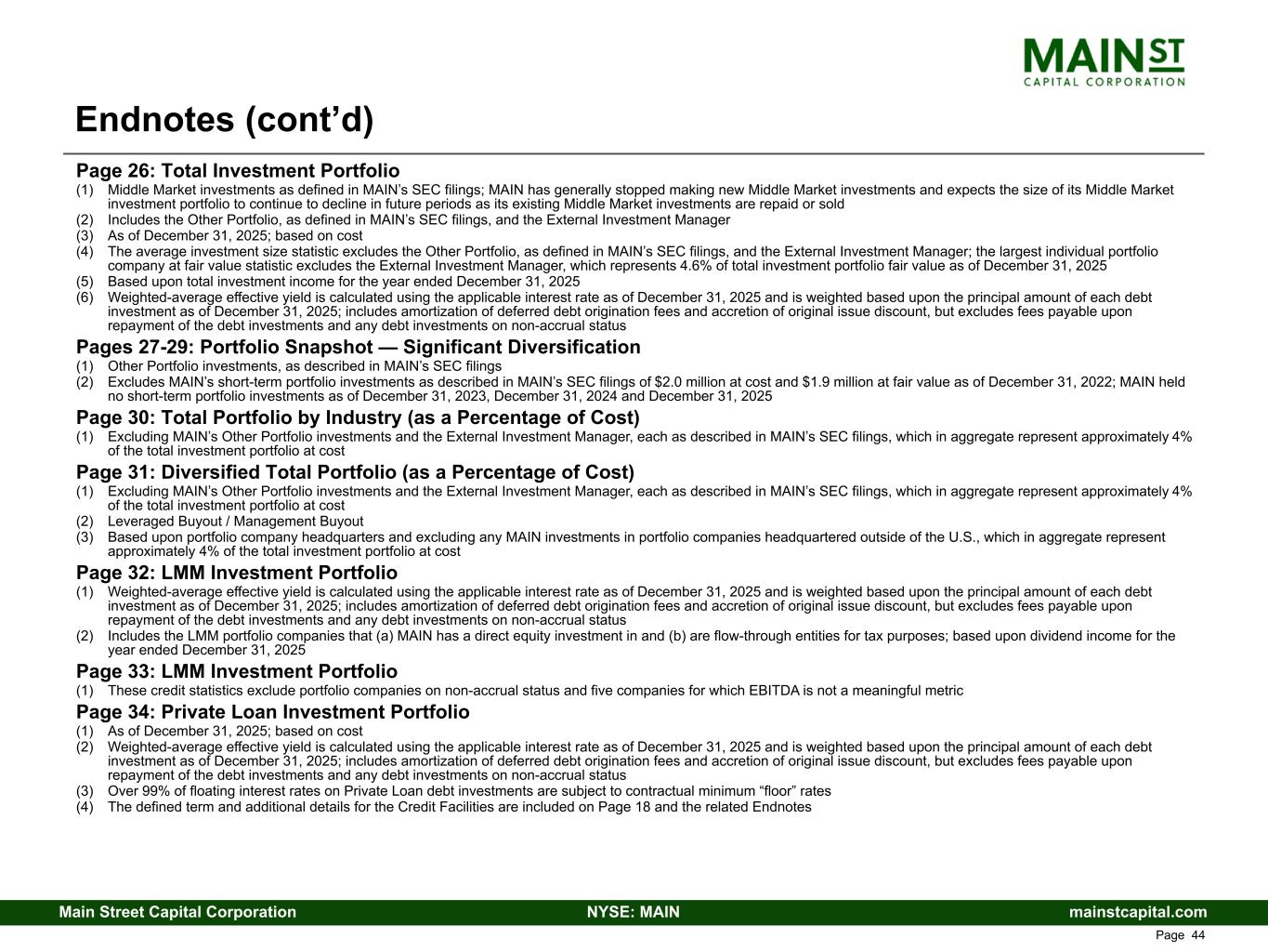 mainstcapital.comNYSE: MAINMain Street Capital Corporation www.mainstcapital.com Page 44 Page 26: Total Investment Portfolio (1) Middle Market investments as defined in MAIN’s SEC filings; MAIN has generally stopped making new Middle Market investments and expects the size of its Middle Market investment portfolio to continue to decline in future periods as its existing Middle Market investments are repaid or sold (2) Includes the Other Portfolio, as defined in MAIN’s SEC filings, and the External Investment Manager (3) As of December 31, 2025; based on cost (4) The average investment size statistic excludes the Other Portfolio, as defined in MAIN’s SEC filings, and the External Investment Manager; the largest individual portfolio company at fair value statistic excludes the External Investment Manager, which represents 4.6% of total investment portfolio fair value as of December 31, 2025 (5) Based upon total investment income for the year ended December 31, 2025 (6) Weighted-average effective yield is calculated using the applicable interest rate as of December 31, 2025 and is weighted based upon the principal amount of each debt investment as of December 31, 2025; includes amortization of deferred debt origination fees and accretion of original issue discount, but excludes fees payable upon repayment of the debt investments and any debt investments on non-accrual status Pages 27-29: Portfolio Snapshot — Significant Diversification (1) Other Portfolio investments, as described in MAIN’s SEC filings (2) Excludes MAIN’s short-term portfolio investments as described in MAIN’s SEC filings of $2.0 million at cost and $1.9 million at fair value as of December 31, 2022; MAIN held no short-term portfolio investments as of December 31, 2023, December 31, 2024 and December 31, 2025 Page 30: Total Portfolio by Industry (as a Percentage of Cost) (1) Excluding MAIN’s Other Portfolio investments and the External Investment Manager, each as described in MAIN’s SEC filings, which in aggregate represent approximately 4% of the total investment portfolio at cost Page 31: Diversified Total Portfolio (as a Percentage of Cost) (1) Excluding MAIN’s Other Portfolio investments and the External Investment Manager, each as described in MAIN’s SEC filings, which in aggregate represent approximately 4% of the total investment portfolio at cost (2) Leveraged Buyout / Management Buyout (3) Based upon portfolio company headquarters and excluding any MAIN investments in portfolio companies headquartered outside of the U.S., which in aggregate represent approximately 4% of the total investment portfolio at cost Page 32: LMM Investment Portfolio (1) Weighted-average effective yield is calculated using the applicable interest rate as of December 31, 2025 and is weighted based upon the principal amount of each debt investment as of December 31, 2025; includes amortization of deferred debt origination fees and accretion of original issue discount, but excludes fees payable upon repayment of the debt investments and any debt investments on non-accrual status (2) Includes the LMM portfolio companies that (a) MAIN has a direct equity investment in and (b) are flow-through entities for tax purposes; based upon dividend income for the year ended December 31, 2025 Page 33: LMM Investment Portfolio (1) These credit statistics exclude portfolio companies on non-accrual status and five companies for which EBITDA is not a meaningful metric Page 34: Private Loan Investment Portfolio (1) As of December 31, 2025; based on cost (2) Weighted-average effective yield is calculated using the applicable interest rate as of December 31, 2025 and is weighted based upon the principal amount of each debt investment as of December 31, 2025; includes amortization of deferred debt origination fees and accretion of original issue discount, but excludes fees payable upon repayment of the debt investments and any debt investments on non-accrual status (3) Over 99% of floating interest rates on Private Loan debt investments are subject to contractual minimum “floor” rates (4) The defined term and additional details for the Credit Facilities are included on Page 18 and the related Endnotes Endnotes (cont’d)