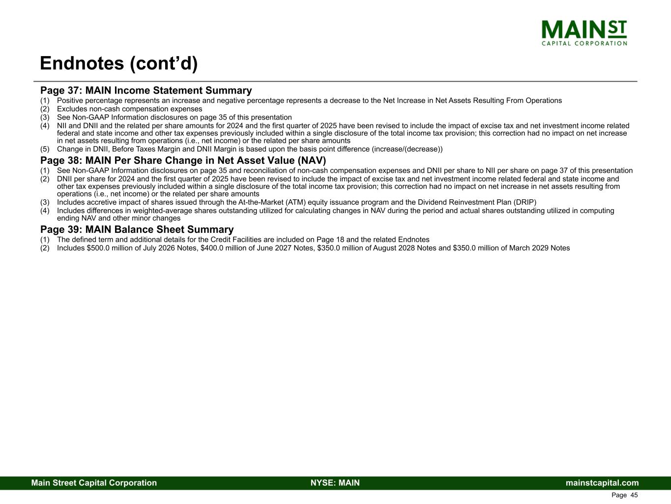 mainstcapital.comNYSE: MAINMain Street Capital Corporation www.mainstcapital.com Page 45 Page 37: MAIN Income Statement Summary (1) Positive percentage represents an increase and negative percentage represents a decrease to the Net Increase in Net Assets Resulting From Operations (2) Excludes non-cash compensation expenses (3) See Non-GAAP Information disclosures on page 35 of this presentation (4) NII and DNII and the related per share amounts for 2024 and the first quarter of 2025 have been revised to include the impact of excise tax and net investment income related federal and state income and other tax expenses previously included within a single disclosure of the total income tax provision; this correction had no impact on net increase in net assets resulting from operations (i.e., net income) or the related per share amounts (5) Change in DNII, Before Taxes Margin and DNII Margin is based upon the basis point difference (increase/(decrease)) Page 38: MAIN Per Share Change in Net Asset Value (NAV) (1) See Non-GAAP Information disclosures on page 35 and reconciliation of non-cash compensation expenses and DNII per share to NII per share on page 37 of this presentation (2) DNII per share for 2024 and the first quarter of 2025 have been revised to include the impact of excise tax and net investment income related federal and state income and other tax expenses previously included within a single disclosure of the total income tax provision; this correction had no impact on net increase in net assets resulting from operations (i.e., net income) or the related per share amounts (3) Includes accretive impact of shares issued through the At-the-Market (ATM) equity issuance program and the Dividend Reinvestment Plan (DRIP) (4) Includes differences in weighted-average shares outstanding utilized for calculating changes in NAV during the period and actual shares outstanding utilized in computing ending NAV and other minor changes Page 39: MAIN Balance Sheet Summary (1) The defined term and additional details for the Credit Facilities are included on Page 18 and the related Endnotes (2) Includes $500.0 million of July 2026 Notes, $400.0 million of June 2027 Notes, $350.0 million of August 2028 Notes and $350.0 million of March 2029 Notes Endnotes (cont’d)