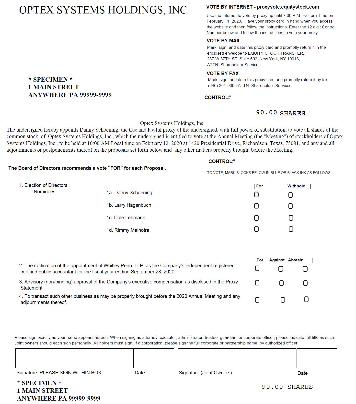 You are cordially invited to attend the 2020 Annual Meeting of Shareholders (the “Annual Meeting”) of Optex Systems Holdings, Inc., a Delaware corporation (the “Company”), to be held at 10:00 AM local time on February 12, 2020, DoubleTree by Hilton Hotel Dallas - Richardson, 1981 North Central Expressway, Richardson, Texas, 75080 to consider and vote upon the following proposals: