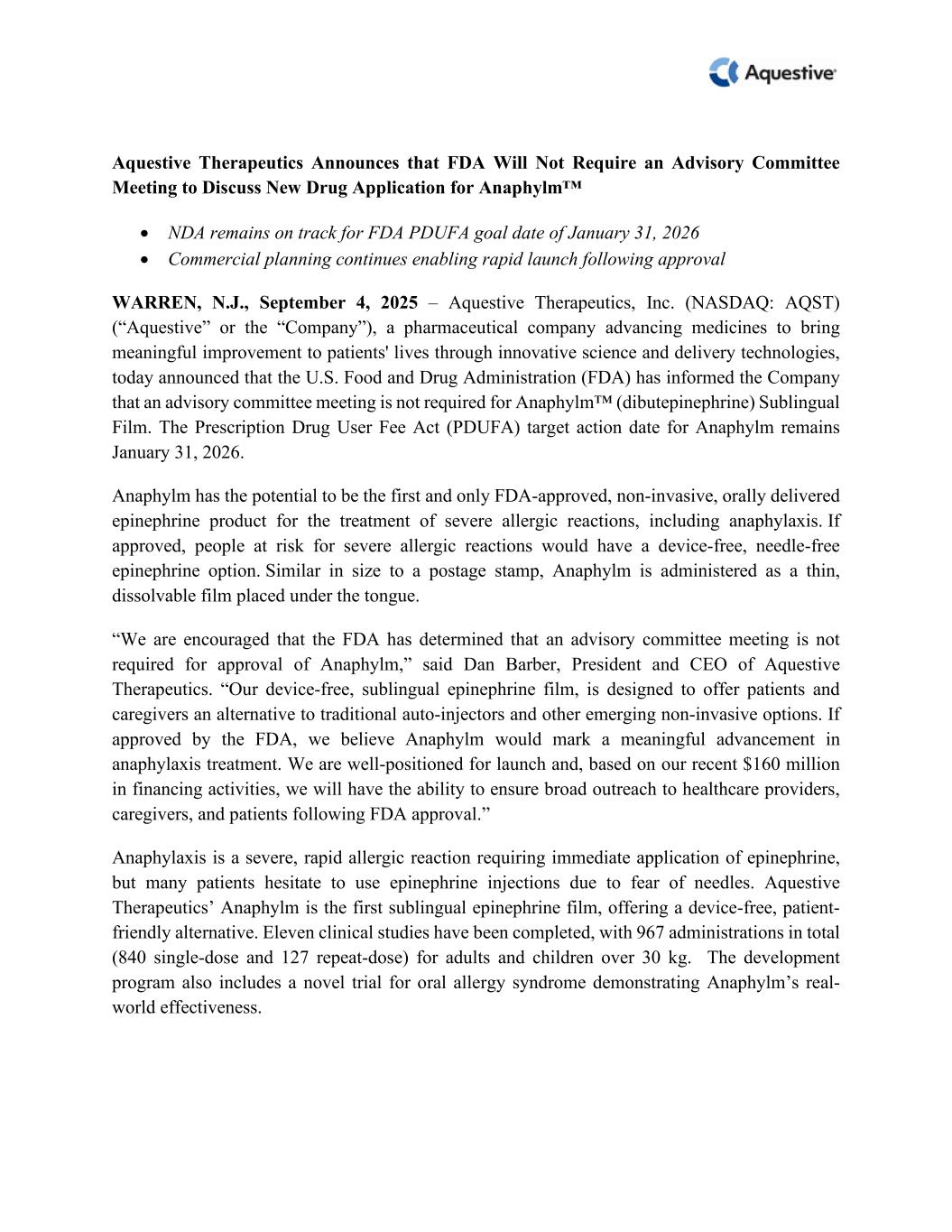 Aquestive Therapeutics Announces that FDA Will Not Require an Advisory Committee  Meeting to Discuss New Drug Application for Anaphylm™  • NDA remains on track for FDA PDUFA goal date of January 31, 2026  • Commercial planning continues enabling rapid launch following approval  WARREN, N.J., September 4, 2025 – Aquestive Therapeutics, Inc. (NASDAQ: AQST)  (“Aquestive” or the “Company”), a pharmaceutical company advancing medicines to bring  meaningful improvement to patients' lives through innovative science and delivery technologies,  today announced that the U.S. Food and Drug Administration (FDA) has informed the Company  that an advisory committee meeting is not required for Anaphylm™ (dibutepinephrine) Sublingual  Film. The Prescription Drug User Fee Act (PDUFA) target action date for Anaphylm remains  January 31, 2026.   Anaphylm has the potential to be the first and only FDA-approved, non-invasive, orally delivered  epinephrine product for the treatment of severe allergic reactions, including anaphylaxis. If  approved, people at risk for severe allergic reactions would have a device-free, needle-free  epinephrine option. Similar in size to a postage stamp, Anaphylm is administered as a thin,  dissolvable film placed under the tongue.  “We are encouraged that the FDA has determined that an advisory committee meeting is not  required for approval of Anaphylm,” said Dan Barber, President and CEO of Aquestive  Therapeutics. “Our device-free, sublingual epinephrine film, is designed to offer patients and  caregivers an alternative to traditional auto-injectors and other emerging non-invasive options. If  approved by the FDA, we believe Anaphylm would mark a meaningful advancement in  anaphylaxis treatment. We are well-positioned for launch and, based on our recent $160 million  in financing activities, we will have the ability to ensure broad outreach to healthcare providers,  caregivers, and patients following FDA approval.”   Anaphylaxis is a severe, rapid allergic reaction requiring immediate application of epinephrine,  but many patients hesitate to use epinephrine injections due to fear of needles. Aquestive  Therapeutics’ Anaphylm is the first sublingual epinephrine film, offering a device-free, patient- friendly alternative. Eleven clinical studies have been completed, with 967 administrations in total  (840 single-dose and 127 repeat-dose) for adults and children over 30 kg.  The development  program also includes a novel trial for oral allergy syndrome demonstrating Anaphylm’s real- world effectiveness.