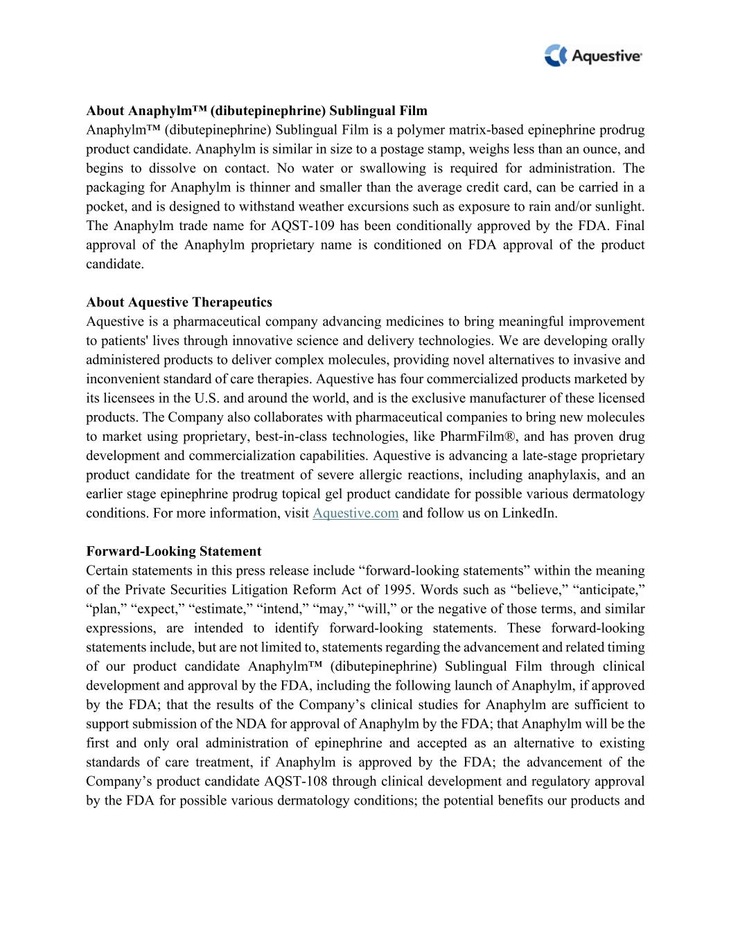 About Anaphylm™ (dibutepinephrine) Sublingual Film   Anaphylm™ (dibutepinephrine) Sublingual Film is a polymer matrix-based epinephrine prodrug  product candidate. Anaphylm is similar in size to a postage stamp, weighs less than an ounce, and  begins to dissolve on contact. No water or swallowing is required for administration. The  packaging for Anaphylm is thinner and smaller than the average credit card, can be carried in a  pocket, and is designed to withstand weather excursions such as exposure to rain and/or sunlight.  The Anaphylm trade name for AQST-109 has been conditionally approved by the FDA. Final  approval of the Anaphylm proprietary name is conditioned on FDA approval of the product  candidate.    About Aquestive Therapeutics  Aquestive is a pharmaceutical company advancing medicines to bring meaningful improvement  to patients' lives through innovative science and delivery technologies. We are developing orally  administered products to deliver complex molecules, providing novel alternatives to invasive and  inconvenient standard of care therapies. Aquestive has four commercialized products marketed by  its licensees in the U.S. and around the world, and is the exclusive manufacturer of these licensed  products. The Company also collaborates with pharmaceutical companies to bring new molecules  to market using proprietary, best-in-class technologies, like PharmFilm®, and has proven drug  development and commercialization capabilities. Aquestive is advancing a late-stage proprietary  product candidate for the treatment of severe allergic reactions, including anaphylaxis, and an  earlier stage epinephrine prodrug topical gel product candidate for possible various dermatology  conditions. For more information, visit Aquestive.com and follow us on LinkedIn.    Forward-Looking Statement  Certain statements in this press release include “forward-looking statements” within the meaning  of the Private Securities Litigation Reform Act of 1995. Words such as “believe,” “anticipate,”  “plan,” “expect,” “estimate,” “intend,” “may,” “will,” or the negative of those terms, and similar  expressions, are intended to identify forward-looking statements. These forward-looking  statements include, but are not limited to, statements regarding the advancement and related timing  of our product candidate Anaphylm™ (dibutepinephrine) Sublingual Film through clinical  development and approval by the FDA, including the following launch of Anaphylm, if approved  by the FDA; that the results of the Company’s clinical studies for Anaphylm are sufficient to  support submission of the NDA for approval of Anaphylm by the FDA; that Anaphylm will be the  first and only oral administration of epinephrine and accepted as an alternative to existing  standards of care treatment, if Anaphylm is approved by the FDA; the advancement of the  Company’s product candidate AQST-108 through clinical development and regulatory approval  by the FDA for possible various dermatology conditions; the potential benefits our products and