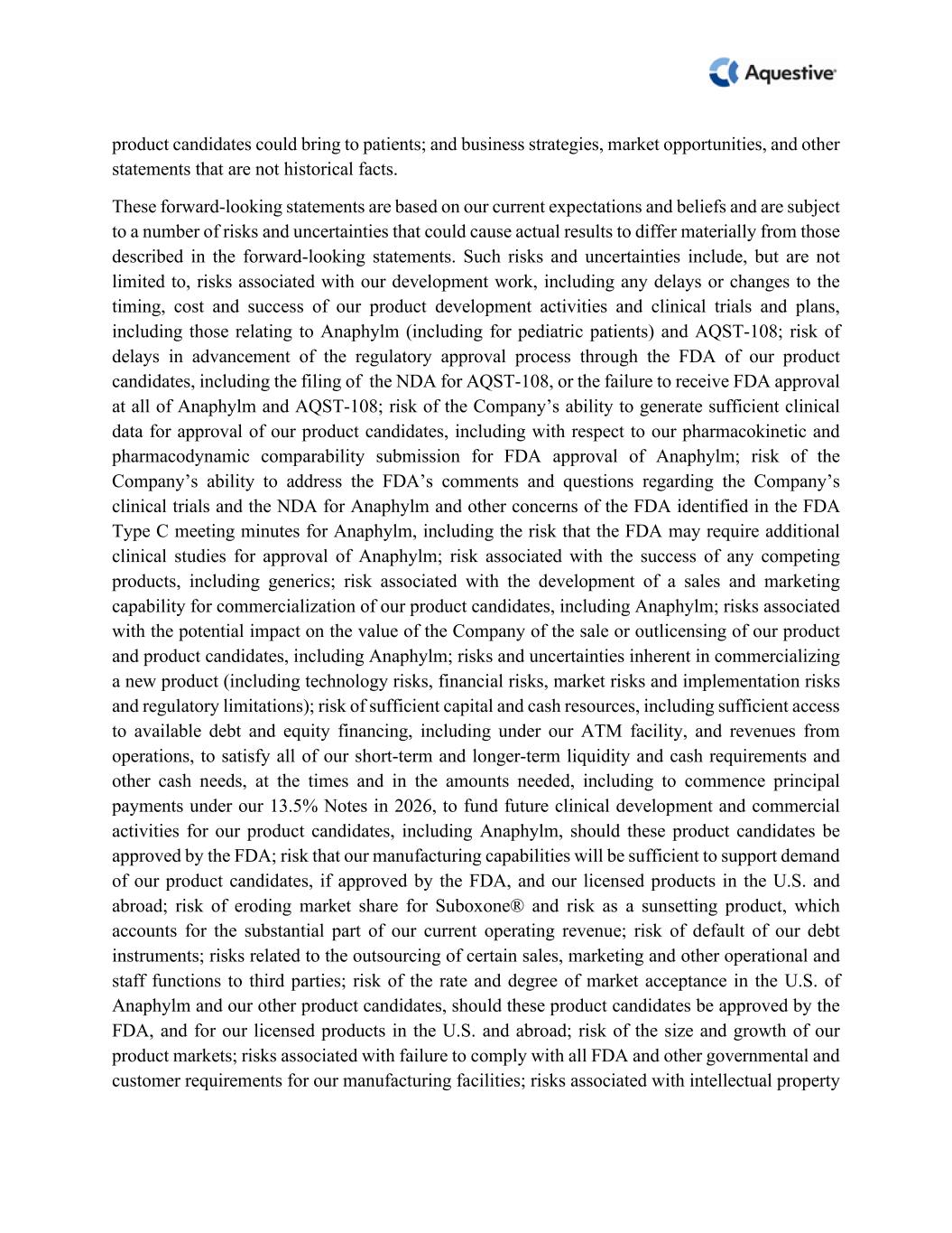 product candidates could bring to patients; and business strategies, market opportunities, and other  statements that are not historical facts.  These forward-looking statements are based on our current expectations and beliefs and are subject  to a number of risks and uncertainties that could cause actual results to differ materially from those  described in the forward-looking statements. Such risks and uncertainties include, but are not  limited to, risks associated with our development work, including any delays or changes to the  timing, cost and success of our product development activities and clinical trials and plans,  including those relating to Anaphylm (including for pediatric patients) and AQST-108; risk of  delays in advancement of the regulatory approval process through the FDA of our product  candidates, including the filing of  the NDA for AQST-108, or the failure to receive FDA approval  at all of Anaphylm and AQST-108; risk of the Company’s ability to generate sufficient clinical  data for approval of our product candidates, including with respect to our pharmacokinetic and  pharmacodynamic comparability submission for FDA approval of Anaphylm; risk of the  Company’s ability to address the FDA’s comments and questions regarding the Company’s  clinical trials and the NDA for Anaphylm and other concerns of the FDA identified in the FDA  Type C meeting minutes for Anaphylm, including the risk that the FDA may require additional  clinical studies for approval of Anaphylm; risk associated with the success of any competing  products, including generics; risk associated with the development of a sales and marketing  capability for commercialization of our product candidates, including Anaphylm; risks associated  with the potential impact on the value of the Company of the sale or outlicensing of our product  and product candidates, including Anaphylm; risks and uncertainties inherent in commercializing  a new product (including technology risks, financial risks, market risks and implementation risks  and regulatory limitations); risk of sufficient capital and cash resources, including sufficient access  to available debt and equity financing, including under our ATM facility, and revenues from  operations, to satisfy all of our short-term and longer-term liquidity and cash requirements and  other cash needs, at the times and in the amounts needed, including to commence principal  payments under our 13.5% Notes in 2026, to fund future clinical development and commercial  activities for our product candidates, including Anaphylm, should these product candidates be  approved by the FDA; risk that our manufacturing capabilities will be sufficient to support demand  of our product candidates, if approved by the FDA, and our licensed products in the U.S. and  abroad; risk of eroding market share for Suboxone® and risk as a sunsetting product, which  accounts for the substantial part of our current operating revenue; risk of default of our debt  instruments; risks related to the outsourcing of certain sales, marketing and other operational and  staff functions to third parties; risk of the rate and degree of market acceptance in the U.S. of  Anaphylm and our other product candidates, should these product candidates be approved by the  FDA, and for our licensed products in the U.S. and abroad; risk of the size and growth of our  product markets; risks associated with failure to comply with all FDA and other governmental and  customer requirements for our manufacturing facilities; risks associated with intellectual property