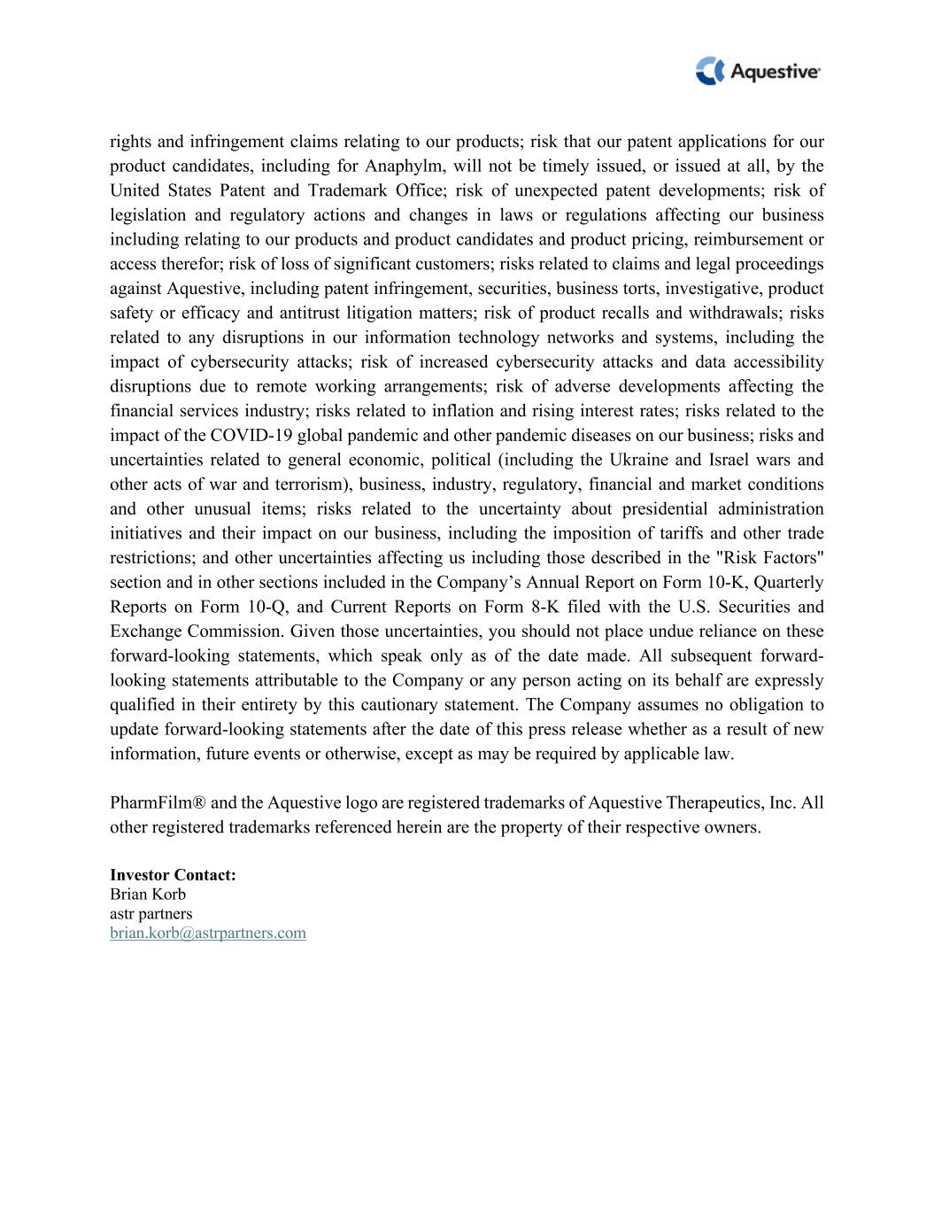 rights and infringement claims relating to our products; risk that our patent applications for our  product candidates, including for Anaphylm, will not be timely issued, or issued at all, by the  United States Patent and Trademark Office; risk of unexpected patent developments; risk of  legislation and regulatory actions and changes in laws or regulations affecting our business  including relating to our products and product candidates and product pricing, reimbursement or  access therefor; risk of loss of significant customers; risks related to claims and legal proceedings  against Aquestive, including patent infringement, securities, business torts, investigative, product  safety or efficacy and antitrust litigation matters; risk of product recalls and withdrawals; risks  related to any disruptions in our information technology networks and systems, including the  impact of cybersecurity attacks; risk of increased cybersecurity attacks and data accessibility  disruptions due to remote working arrangements; risk of adverse developments affecting the  financial services industry; risks related to inflation and rising interest rates; risks related to the  impact of the COVID-19 global pandemic and other pandemic diseases on our business; risks and  uncertainties related to general economic, political (including the Ukraine and Israel wars and  other acts of war and terrorism), business, industry, regulatory, financial and market conditions  and other unusual items; risks related to the uncertainty about presidential administration  initiatives and their impact on our business, including the imposition of tariffs and other trade  restrictions; and other uncertainties affecting us including those described in the "Risk Factors"  section and in other sections included in the Company’s Annual Report on Form 10-K, Quarterly  Reports on Form 10-Q, and Current Reports on Form 8-K filed with the U.S. Securities and  Exchange Commission. Given those uncertainties, you should not place undue reliance on these  forward-looking statements, which speak only as of the date made. All subsequent forward- looking statements attributable to the Company or any person acting on its behalf are expressly  qualified in their entirety by this cautionary statement. The Company assumes no obligation to  update forward-looking statements after the date of this press release whether as a result of new  information, future events or otherwise, except as may be required by applicable law.    PharmFilm® and the Aquestive logo are registered trademarks of Aquestive Therapeutics, Inc. All  other registered trademarks referenced herein are the property of their respective owners.    Investor Contact:  Brian Korb  astr partners  brian.korb@astrpartners.com