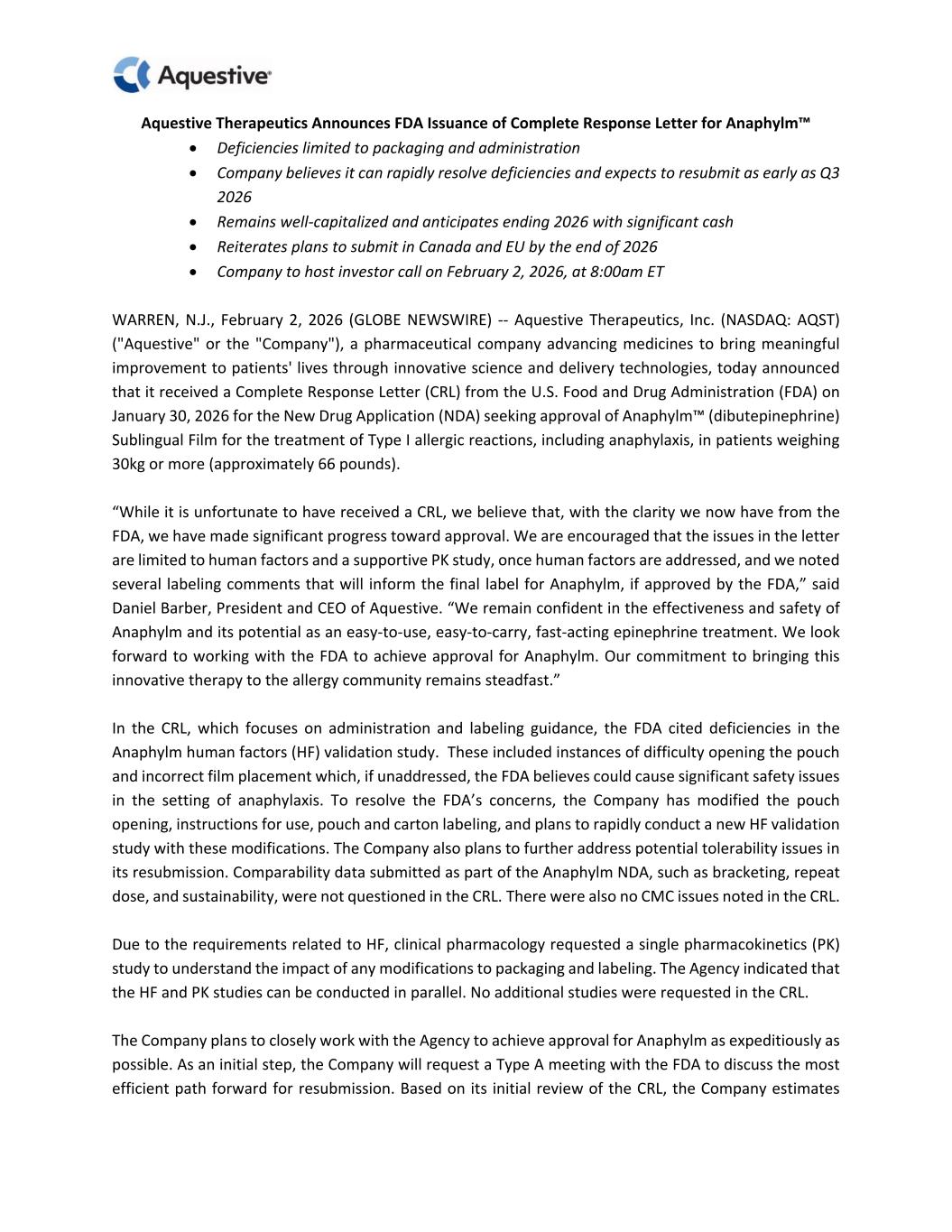 Aquestive Therapeutics Announces FDA Issuance of Complete Response Letter for Anaphylm™ Deficiencies limited to packaging and administration Company believes it can rapidly resolve deficiencies and expects to resubmit as early as Q3 2026 Remains well-capitalized and anticipates ending 2026 with significant cash Reiterates plans to submit in Canada and EU by the end of 2026 Company to host investor call on February 2, 2026, at 8:00am ET WARREN, N.J., February 2, 2026 (GLOBE NEWSWIRE) -- Aquestive Therapeutics, Inc. (NASDAQ: AQST) ("Aquestive" or the "Company"), a pharmaceutical company advancing medicines to bring meaningful improvement to patients' lives through innovative science and delivery technologies, today announced that it received a Complete Response Letter (CRL) from the U.S. Food and Drug Administration (FDA) on January 30, 2026 for the New Drug Application (NDA) seeking approval of Anaphylm™ (dibutepinephrine) Sublingual Film for the treatment of Type I allergic reactions, including anaphylaxis, in patients weighing 30kg or more (approximately 66 pounds). “While it is unfortunate to have received a CRL, we believe that, with the clarity we now have from the FDA, we have made significant progress toward approval. We are encouraged that the issues in the letter are limited to human factors and a supportive PK study, once human factors are addressed, and we noted several labeling comments that will inform the final label for Anaphylm, if approved by the FDA,” said Daniel Barber, President and CEO of Aquestive. “We remain confident in the effectiveness and safety of Anaphylm and its potential as an easy-to-use, easy-to-carry, fast-acting epinephrine treatment. We look forward to working with the FDA to achieve approval for Anaphylm. Our commitment to bringing this innovative therapy to the allergy community remains steadfast.” In the CRL, which focuses on administration and labeling guidance, the FDA cited deficiencies in the Anaphylm human factors (HF) validation study. These included instances of difficulty opening the pouch and incorrect film placement which, if unaddressed, the FDA believes could cause significant safety issues in the setting of anaphylaxis. To resolve the FDA’s concerns, the Company has modified the pouch opening, instructions for use, pouch and carton labeling, and plans to rapidly conduct a new HF validation study with these modifications. The Company also plans to further address potential tolerability issues in its resubmission. Comparability data submitted as part of the Anaphylm NDA, such as bracketing, repeat dose, and sustainability, were not questioned in the CRL. There were also no CMC issues noted in the CRL. Due to the requirements related to HF, clinical pharmacology requested a single pharmacokinetics (PK) study to understand the impact of any modifications to packaging and labeling. The Agency indicated that the HF and PK studies can be conducted in parallel. No additional studies were requested in the CRL. The Company plans to closely work with the Agency to achieve approval for Anaphylm as expeditiously as possible. As an initial step, the Company will request a Type A meeting with the FDA to discuss the most efficient path forward for resubmission. Based on its initial review of the CRL, the Company estimates