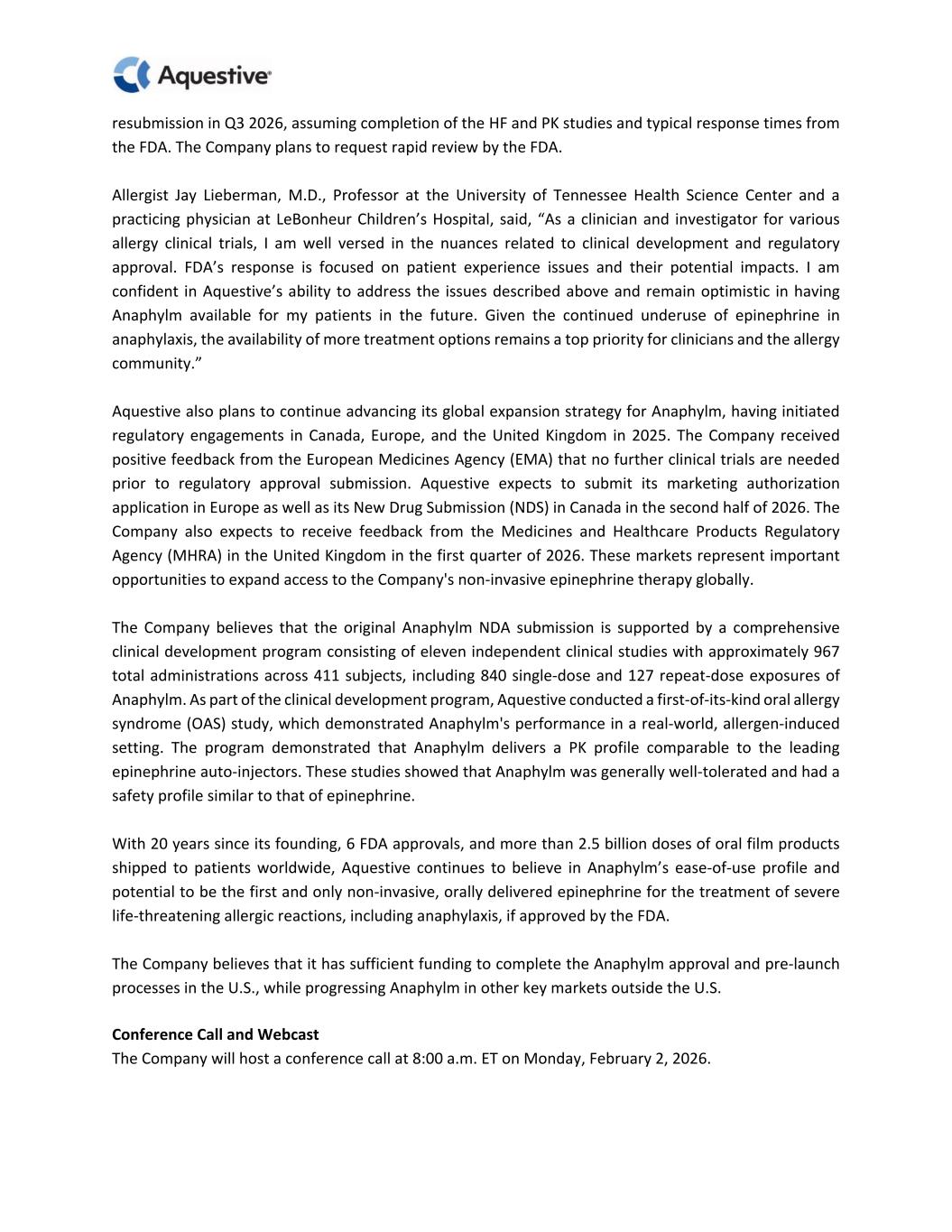 resubmission in Q3 2026, assuming completion of the HF and PK studies and typical response times from the FDA. The Company plans to request rapid review by the FDA. Allergist Jay Lieberman, M.D., Professor at the University of Tennessee Health Science Center and a practicing physician at LeBonheur Children’s Hospital, said, “As a clinician and investigator for various allergy clinical trials, I am well versed in the nuances related to clinical development and regulatory approval. FDA’s response is focused on patient experience issues and their potential impacts. I am confident in Aquestive’s ability to address the issues described above and remain optimistic in having Anaphylm available for my patients in the future. Given the continued underuse of epinephrine in anaphylaxis, the availability of more treatment options remains a top priority for clinicians and the allergy community.” Aquestive also plans to continue advancing its global expansion strategy for Anaphylm, having initiated regulatory engagements in Canada, Europe, and the United Kingdom in 2025. The Company received positive feedback from the European Medicines Agency (EMA) that no further clinical trials are needed prior to regulatory approval submission. Aquestive expects to submit its marketing authorization application in Europe as well as its New Drug Submission (NDS) in Canada in the second half of 2026. The Company also expects to receive feedback from the Medicines and Healthcare Products Regulatory Agency (MHRA) in the United Kingdom in the first quarter of 2026. These markets represent important opportunities to expand access to the Company's non-invasive epinephrine therapy globally. The Company believes that the original Anaphylm NDA submission is supported by a comprehensive clinical development program consisting of eleven independent clinical studies with approximately 967 total administrations across 411 subjects, including 840 single-dose and 127 repeat-dose exposures of Anaphylm. As part of the clinical development program, Aquestive conducted a first-of-its-kind oral allergy syndrome (OAS) study, which demonstrated Anaphylm's performance in a real-world, allergen-induced setting. The program demonstrated that Anaphylm delivers a PK profile comparable to the leading epinephrine auto-injectors. These studies showed that Anaphylm was generally well-tolerated and had a safety profile similar to that of epinephrine. With 20 years since its founding, 6 FDA approvals, and more than 2.5 billion doses of oral film products shipped to patients worldwide, Aquestive continues to believe in Anaphylm’s ease-of-use profile and potential to be the first and only non-invasive, orally delivered epinephrine for the treatment of severe life-threatening allergic reactions, including anaphylaxis, if approved by the FDA. The Company believes that it has sufficient funding to complete the Anaphylm approval and pre-launch processes in the U.S., while progressing Anaphylm in other key markets outside the U.S. Conference Call and Webcast The Company will host a conference call at 8:00 a.m. ET on Monday, February 2, 2026.