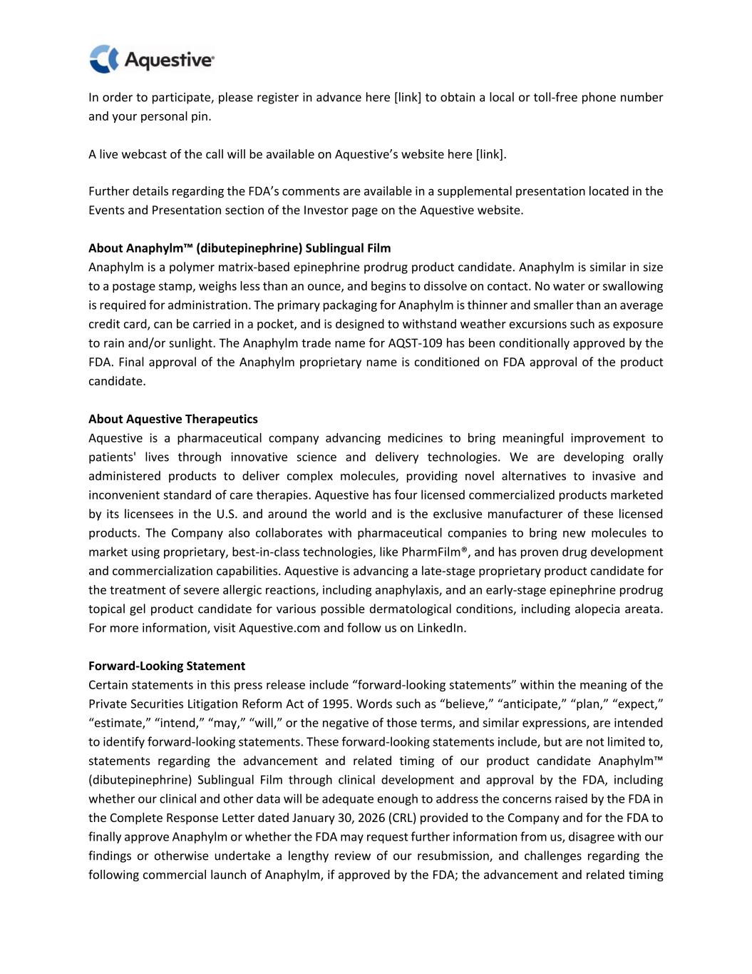 In order to participate, please register in advance here [link] to obtain a local or toll-free phone number and your personal pin. A live webcast of the call will be available on Aquestive’s website here [link]. Further details regarding the FDA’s comments are available in a supplemental presentation located in the Events and Presentation section of the Investor page on the Aquestive website. About Anaphylm™ (dibutepinephrine) Sublingual Film Anaphylm is a polymer matrix-based epinephrine prodrug product candidate. Anaphylm is similar in size to a postage stamp, weighs less than an ounce, and begins to dissolve on contact. No water or swallowing is required for administration. The primary packaging for Anaphylm is thinner and smaller than an average credit card, can be carried in a pocket, and is designed to withstand weather excursions such as exposure to rain and/or sunlight. The Anaphylm trade name for AQST-109 has been conditionally approved by the FDA. Final approval of the Anaphylm proprietary name is conditioned on FDA approval of the product candidate. About Aquestive Therapeutics Aquestive is a pharmaceutical company advancing medicines to bring meaningful improvement to patients' lives through innovative science and delivery technologies. We are developing orally administered products to deliver complex molecules, providing novel alternatives to invasive and inconvenient standard of care therapies. Aquestive has four licensed commercialized products marketed by its licensees in the U.S. and around the world and is the exclusive manufacturer of these licensed products. The Company also collaborates with pharmaceutical companies to bring new molecules to market using proprietary, best-in-class technologies, like PharmFilm®, and has proven drug development and commercialization capabilities. Aquestive is advancing a late-stage proprietary product candidate for the treatment of severe allergic reactions, including anaphylaxis, and an early-stage epinephrine prodrug topical gel product candidate for various possible dermatological conditions, including alopecia areata. For more information, visit Aquestive.com and follow us on LinkedIn. Forward-Looking Statement Certain statements in this press release include “forward-looking statements” within the meaning of the Private Securities Litigation Reform Act of 1995. Words such as “believe,” “anticipate,” “plan,” “expect,” “estimate,” “intend,” “may,” “will,” or the negative of those terms, and similar expressions, are intended to identify forward-looking statements. These forward-looking statements include, but are not limited to, statements regarding the advancement and related timing of our product candidate Anaphylm™ (dibutepinephrine) Sublingual Film through clinical development and approval by the FDA, including whether our clinical and other data will be adequate enough to address the concerns raised by the FDA in the Complete Response Letter dated January 30, 2026 (CRL) provided to the Company and for the FDA to finally approve Anaphylm or whether the FDA may request further information from us, disagree with our findings or otherwise undertake a lengthy review of our resubmission, and challenges regarding the following commercial launch of Anaphylm, if approved by the FDA; the advancement and related timing