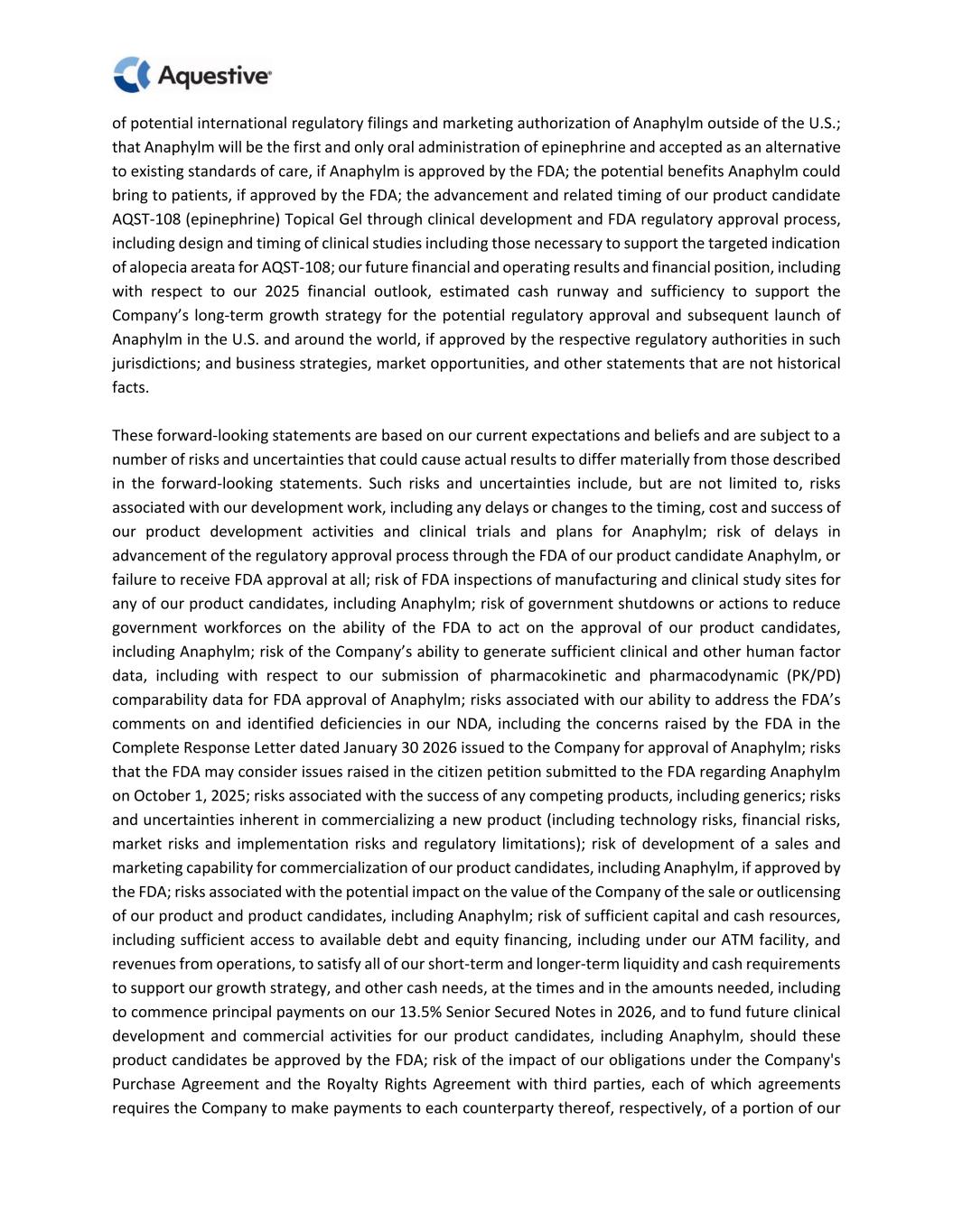 of potential international regulatory filings and marketing authorization of Anaphylm outside of the U.S.; that Anaphylm will be the first and only oral administration of epinephrine and accepted as an alternative to existing standards of care, if Anaphylm is approved by the FDA; the potential benefits Anaphylm could bring to patients, if approved by the FDA; the advancement and related timing of our product candidate AQST-108 (epinephrine) Topical Gel through clinical development and FDA regulatory approval process, including design and timing of clinical studies including those necessary to support the targeted indication of alopecia areata for AQST-108; our future financial and operating results and financial position, including with respect to our 2025 financial outlook, estimated cash runway and sufficiency to support the Company’s long-term growth strategy for the potential regulatory approval and subsequent launch of Anaphylm in the U.S. and around the world, if approved by the respective regulatory authorities in such jurisdictions; and business strategies, market opportunities, and other statements that are not historical facts. These forward-looking statements are based on our current expectations and beliefs and are subject to a number of risks and uncertainties that could cause actual results to differ materially from those described in the forward-looking statements. Such risks and uncertainties include, but are not limited to, risks associated with our development work, including any delays or changes to the timing, cost and success of our product development activities and clinical trials and plans for Anaphylm; risk of delays in advancement of the regulatory approval process through the FDA of our product candidate Anaphylm, or failure to receive FDA approval at all; risk of FDA inspections of manufacturing and clinical study sites for any of our product candidates, including Anaphylm; risk of government shutdowns or actions to reduce government workforces on the ability of the FDA to act on the approval of our product candidates, including Anaphylm; risk of the Company’s ability to generate sufficient clinical and other human factor data, including with respect to our submission of pharmacokinetic and pharmacodynamic (PK/PD) comparability data for FDA approval of Anaphylm; risks associated with our ability to address the FDA’s comments on and identified deficiencies in our NDA, including the concerns raised by the FDA in the Complete Response Letter dated January 30 2026 issued to the Company for approval of Anaphylm; risks that the FDA may consider issues raised in the citizen petition submitted to the FDA regarding Anaphylm on October 1, 2025; risks associated with the success of any competing products, including generics; risks and uncertainties inherent in commercializing a new product (including technology risks, financial risks, market risks and implementation risks and regulatory limitations); risk of development of a sales and marketing capability for commercialization of our product candidates, including Anaphylm, if approved by the FDA; risks associated with the potential impact on the value of the Company of the sale or outlicensing of our product and product candidates, including Anaphylm; risk of sufficient capital and cash resources, including sufficient access to available debt and equity financing, including under our ATM facility, and revenues from operations, to satisfy all of our short-term and longer-term liquidity and cash requirements to support our growth strategy, and other cash needs, at the times and in the amounts needed, including to commence principal payments on our 13.5% Senior Secured Notes in 2026, and to fund future clinical development and commercial activities for our product candidates, including Anaphylm, should these product candidates be approved by the FDA; risk of the impact of our obligations under the Company's Purchase Agreement and the Royalty Rights Agreement with third parties, each of which agreements requires the Company to make payments to each counterparty thereof, respectively, of a portion of our