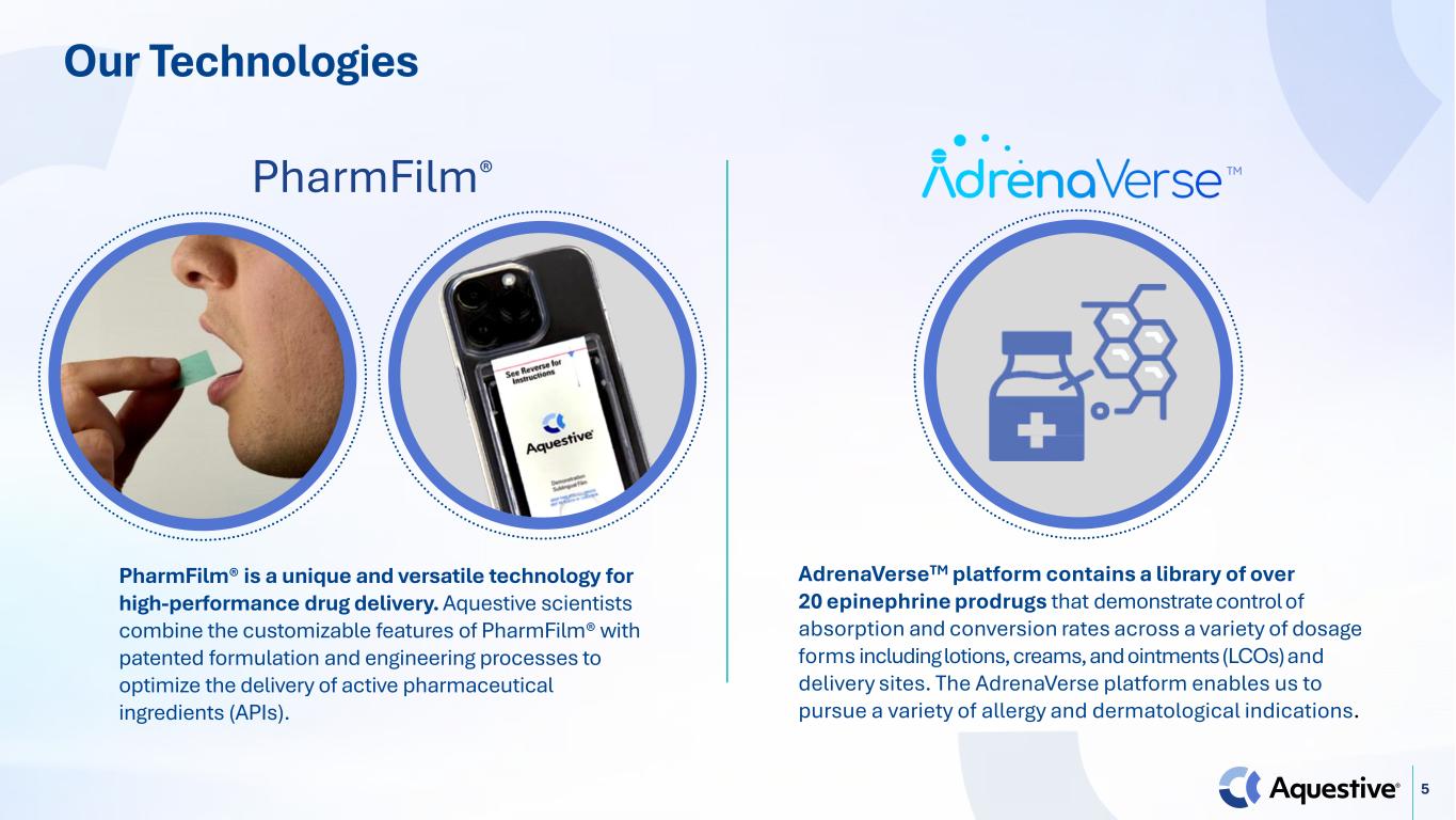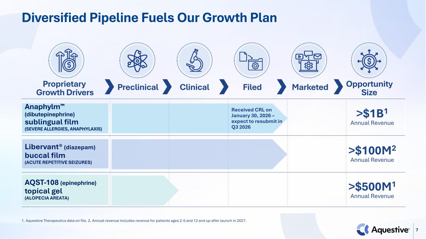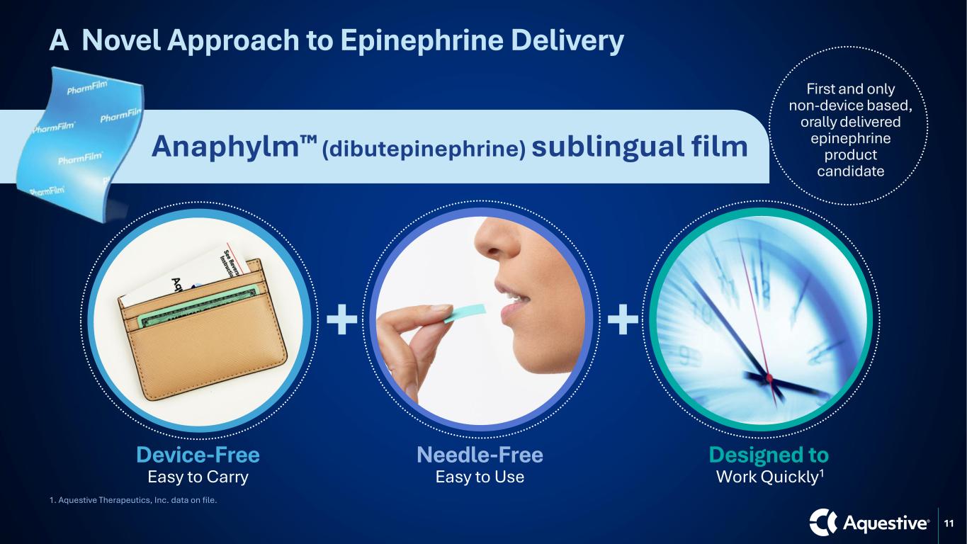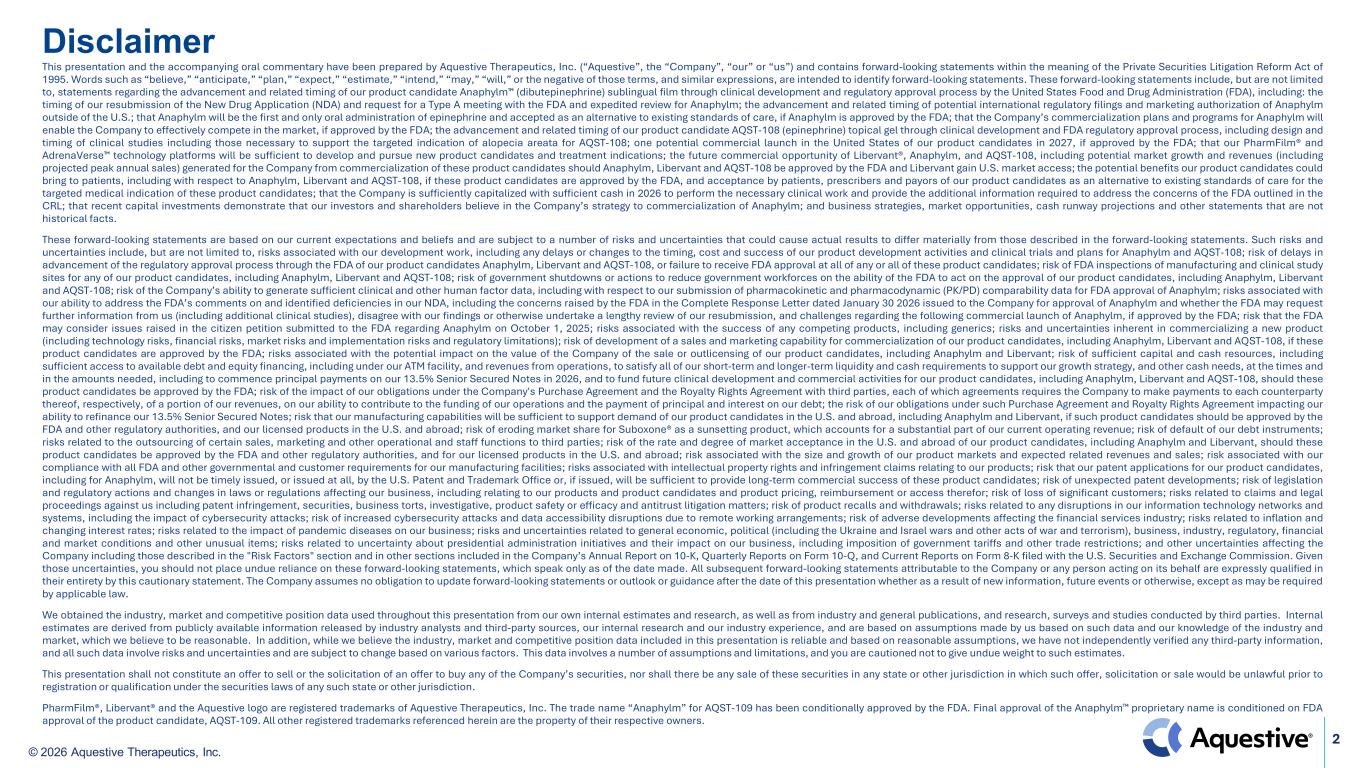 © 2026 Aquestive Therapeutics, Inc. 2 Disclaimer This presentation and the accompanying oral commentary have been prepared by Aquestive Therapeutics, Inc. (“Aquestive”, the “Company”, “our” or “us”) and contains forward-looking statements within the meaning of the Private Securities Litigation Reform Act of 1995. Words such as “believe,” “anticipate,” “plan,” “expect,” “estimate,” “intend,” “may,” “will,” or the negative of those terms, and similar expressions, are intended to identify forward-looking statements. These forward-looking statements include, but are not limited to, statements regarding the advancement and related timing of our product candidate Anaphylm (dibutepinephrine) sublingual film through clinical development and regulatory approval process by the United States Food and Drug Administration (FDA), including: the timing of our resubmission of the New Drug Application (NDA) and request for a Type A meeting with the FDA and expedited review for Anaphylm; the advancement and related timing of potential international regulatory filings and marketing authorization of Anaphylm outside of the U.S.; that Anaphylm will be the first and only oral administration of epinephrine and accepted as an alternative to existing standards of care, if Anaphylm is approved by the FDA; that the Company’s commercialization plans and programs for Anaphylm will enable the Company to effectively compete in the market, if approved by the FDA; the advancement and related timing of our product candidate AQST-108 (epinephrine) topical gel through clinical development and FDA regulatory approval process, including design and timing of clinical studies including those necessary to support the targeted indication of alopecia areata for AQST-108; one potential commercial launch in the United States of our product candidates in 2027, if approved by the FDA; that our PharmFilm® and AdrenaVerse technology platforms will be sufficient to develop and pursue new product candidates and treatment indications; the future commercial opportunity of Libervant®, Anaphylm, and AQST-108, including potential market growth and revenues (including projected peak annual sales) generated for the Company from commercialization of these product candidates should Anaphylm, Libervant and AQST-108 be approved by the FDA and Libervant gain U.S. market access; the potential benefits our product candidates could bring to patients, including with respect to Anaphylm, Libervant and AQST-108, if these product candidates are approved by the FDA, and acceptance by patients, prescribers and payors of our product candidates as an alternative to existing standards of care for the targeted medical indication of these product candidates; that the Company is sufficiently capitalized with sufficient cash in 2026 to perform the necessary clinical work and provide the additional information required to address the concerns of the FDA outlined in the CRL; that recent capital investments demonstrate that our investors and shareholders believe in the Company’s strategy to commercialization of Anaphylm; and business strategies, market opportunities, cash runway projections and other statements that are not historical facts. These forward-looking statements are based on our current expectations and beliefs and are subject to a number of risks and uncertainties that could cause actual results to differ materially from those described in the forward-looking statements. Such risks and uncertainties include, but are not limited to, risks associated with our development work, including any delays or changes to the timing, cost and success of our product development activities and clinical trials and plans for Anaphylm and AQST-108; risk of delays in advancement of the regulatory approval process through the FDA of our product candidates Anaphylm, Libervant and AQST-108, or failure to receive FDA approval at all of any or all of these product candidates; risk of FDA inspections of manufacturing and clinical study sites for any of our product candidates, including Anaphylm, Libervant and AQST-108; risk of government shutdowns or actions to reduce government workforces on the ability of the FDA to act on the approval of our product candidates, including Anaphylm, Libervant and AQST-108; risk of the Company’s ability to generate sufficient clinical and other human factor data, including with respect to our submission of pharmacokinetic and pharmacodynamic (PK/PD) comparability data for FDA approval of Anaphylm; risks associated with our ability to address the FDA’s comments on and identified deficiencies in our NDA, including the concerns raised by the FDA in the Complete Response Letter dated January 30 2026 issued to the Company for approval of Anaphylm and whether the FDA may request further information from us (including additional clinical studies), disagree with our findings or otherwise undertake a lengthy review of our resubmission, and challenges regarding the following commercial launch of Anaphylm, if approved by the FDA; risk that the FDA may consider issues raised in the citizen petition submitted to the FDA regarding Anaphylm on October 1, 2025; risks associated with the success of any competing products, including generics; risks and uncertainties inherent in commercializing a new product (including technology risks, financial risks, market risks and implementation risks and regulatory limitations); risk of development of a sales and marketing capability for commercialization of our product candidates, including Anaphylm, Libervant and AQST-108, if these product candidates are approved by the FDA; risks associated with the potential impact on the value of the Company of the sale or outlicensing of our product candidates, including Anaphylm and Libervant; risk of sufficient capital and cash resources, including sufficient access to available debt and equity financing, including under our 