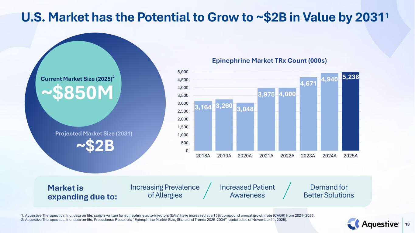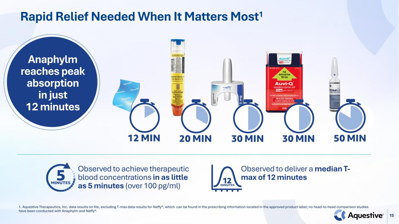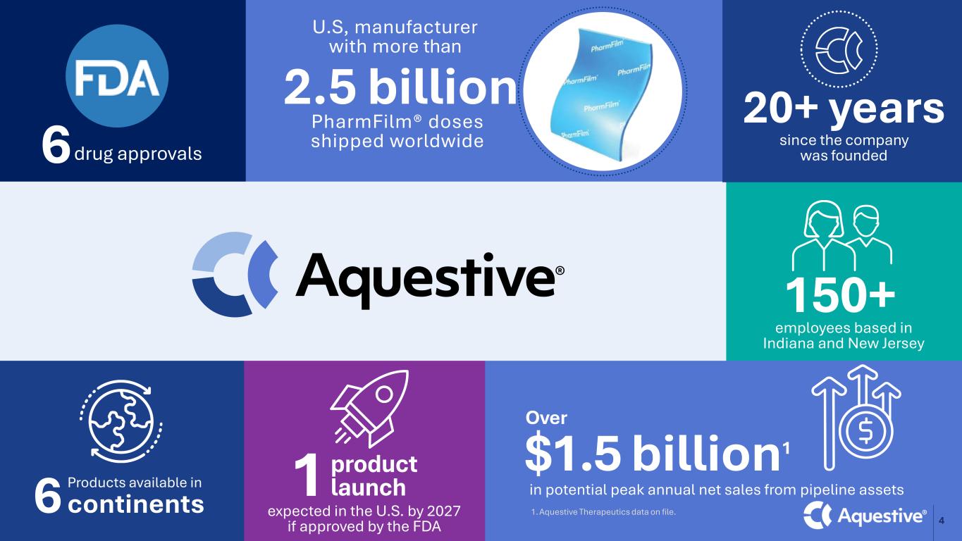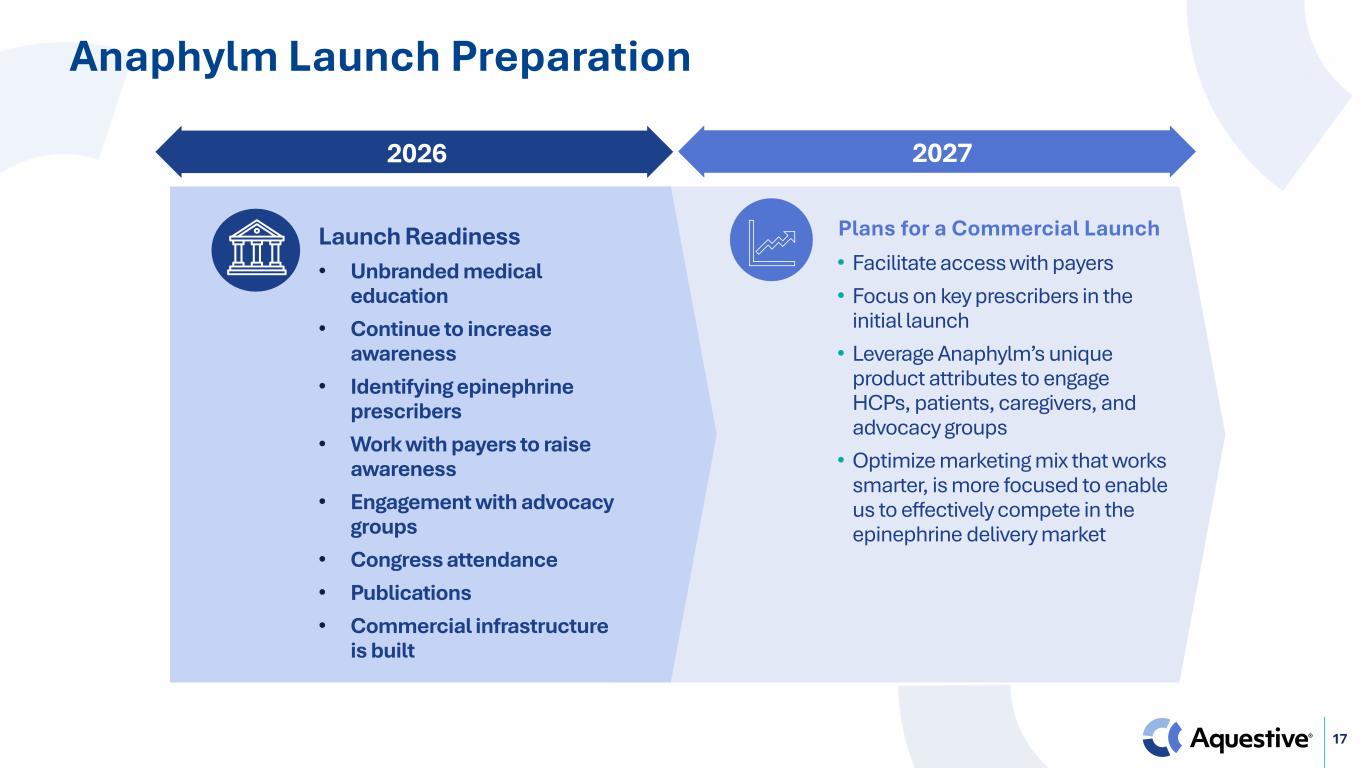 © 2026 Aquestive Therapeutics, Inc. 2 Disclaimer This presentation and the accompanying oral commentary have been prepared by Aquestive Therapeutics, Inc. (“Aquestive”, the “Company”, “our” or “us”) and contains forward-looking statements within the meaning of the Private Securities Litigation Reform Act of 1995. Words such as “believe,” “anticipate,” “plan,” “expect,” “estimate,” “intend,” “may,” “will,” or the negative of those terms, and similar expressions, are intended to identify forward-looking statements. These forward-looking statements include, but are not limited to, statements regarding the advancement and related timing of our product candidate Anaphylm (dibutepinephrine) sublingual film through clinical development and regulatory approval process by the United States Food and Drug Administration (FDA), including: the timing of our resubmission of the New Drug Application (NDA) and request for a Type A meeting with the FDA and expedited review for Anaphylm; the advancement and related timing of potential international regulatory filings and marketing authorization of Anaphylm outside of the U.S.; that Anaphylm will be the first and only oral administration of epinephrine and accepted as an alternative to existing standards of care, if Anaphylm is approved by the FDA; that the Company’s commercialization plans and programs for Anaphylm will enable the Company to effectively compete in the market, if approved by the FDA; the advancement and related timing of our product candidate AQST-108 (epinephrine) topical gel through clinical development and FDA regulatory approval process, including design and timing of clinical studies including those necessary to support the targeted indication of alopecia areata for AQST-108; one potential commercial launch in the United States of our product candidates in 2027, if approved by the FDA; that our PharmFilm® and AdrenaVerse technology platforms will be sufficient to develop and pursue new product candidates and treatment indications; the future commercial opportunity of Libervant®, Anaphylm, and AQST-108, including potential market growth and revenues (including projected peak annual sales) generated for the Company from commercialization of these product candidates should Anaphylm, Libervant and AQST-108 be approved by the FDA and Libervant gain U.S. market access; the potential benefits our product candidates could bring to patients, including with respect to Anaphylm, Libervant and AQST-108, if these product candidates are approved by the FDA, and acceptance by patients, prescribers and payors of our product candidates as an alternative to existing standards of care for the targeted medical indication of these product candidates; that the Company is sufficiently capitalized with sufficient cash in 2026 to perform the necessary clinical work and provide the additional information required to address the concerns of the FDA outlined in the CRL; that recent capital investments demonstrate that our investors and shareholders believe in the Company’s strategy to commercialization of Anaphylm; and business strategies, market opportunities, cash runway projections and other statements that are not historical facts. These forward-looking statements are based on our current expectations and beliefs and are subject to a number of risks and uncertainties that could cause actual results to differ materially from those described in the forward-looking statements. Such risks and uncertainties include, but are not limited to, risks associated with our development work, including any delays or changes to the timing, cost and success of our product development activities and clinical trials and plans for Anaphylm and AQST-108; risk of delays in advancement of the regulatory approval process through the FDA of our product candidates Anaphylm, Libervant and AQST-108, or failure to receive FDA approval at all of any or all of these product candidates; risk of FDA inspections of manufacturing and clinical study sites for any of our product candidates, including Anaphylm, Libervant and AQST-108; risk of government shutdowns or actions to reduce government workforces on the ability of the FDA to act on the approval of our product candidates, including Anaphylm, Libervant and AQST-108; risk of the Company’s ability to generate sufficient clinical and other human factor data, including with respect to our submission of pharmacokinetic and pharmacodynamic (PK/PD) comparability data for FDA approval of Anaphylm; risks associated with our ability to address the FDA’s comments on and identified deficiencies in our NDA, including the concerns raised by the FDA in the Complete Response Letter dated January 30 2026 issued to the Company for approval of Anaphylm and whether the FDA may request further information from us (including additional clinical studies), disagree with our findings or otherwise undertake a lengthy review of our resubmission, and challenges regarding the following commercial launch of Anaphylm, if approved by the FDA; risk that the FDA may consider issues raised in the citizen petition submitted to the FDA regarding Anaphylm on October 1, 2025; risks associated with the success of any competing products, including generics; risks and uncertainties inherent in commercializing a new product (including technology risks, financial risks, market risks and implementation risks and regulatory limitations); risk of development of a sales and marketing capability for commercialization of our product candidates, including Anaphylm, Libervant and AQST-108, if these product candidates are approved by the FDA; risks associated with the potential impact on the value of the Company of the sale or outlicensing of our product candidates, including Anaphylm and Libervant; risk of sufficient capital and cash resources, including sufficient access to available debt and equity financing, including under our 