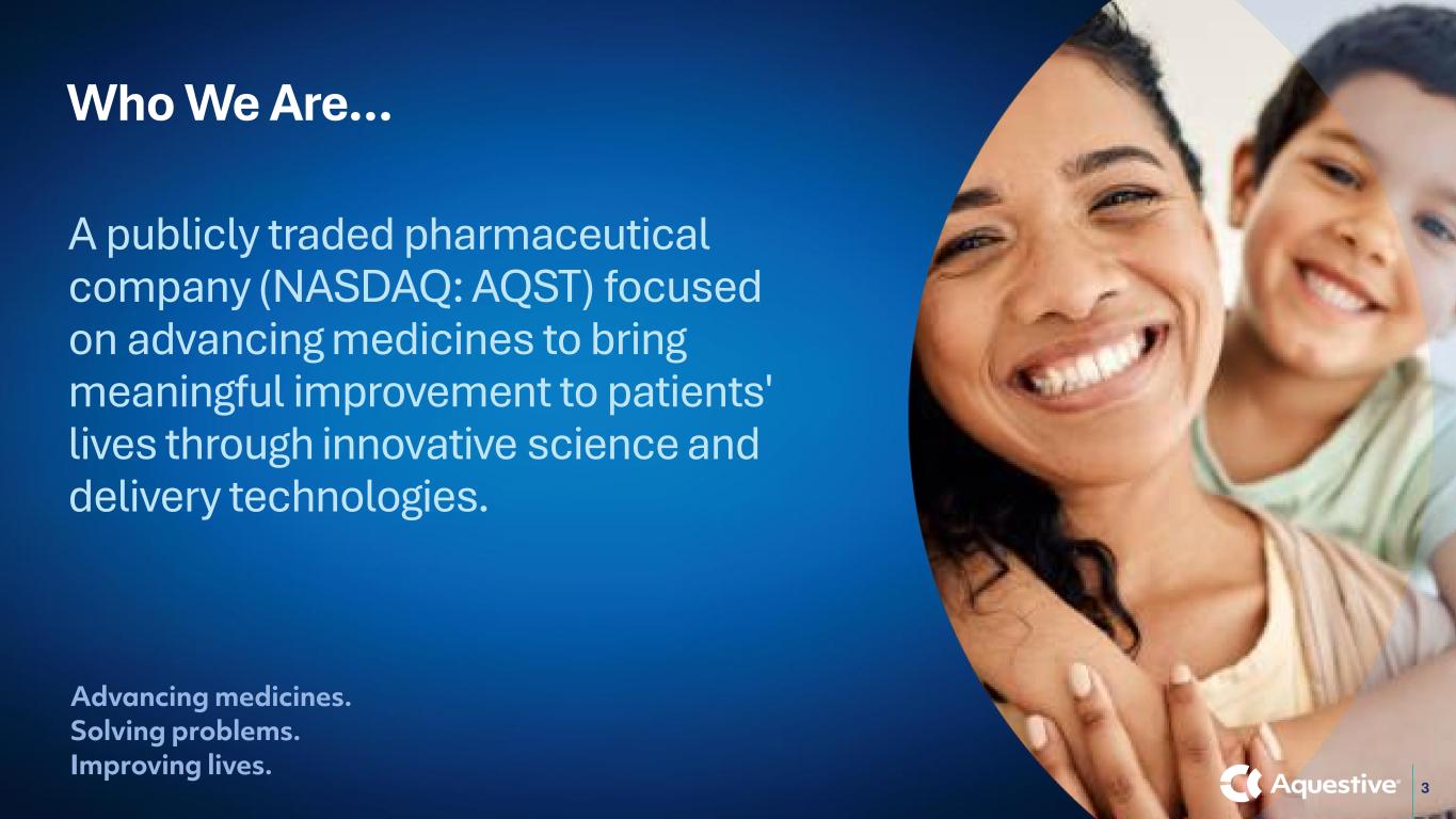 3 A publicly traded pharmaceutical company (NASDAQ: AQST) focused on advancing medicines to bring meaningful improvement to patients' lives through innovative science and delivery technologies. Who We Are…