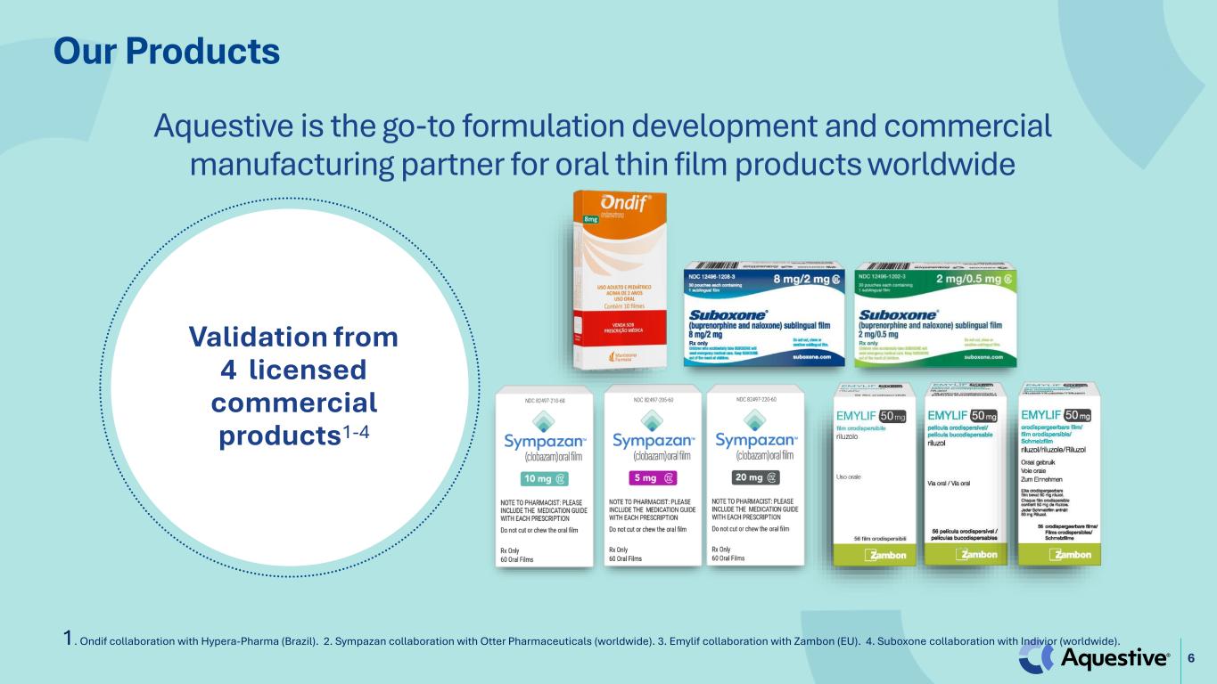5 Our Technologies AdrenaVerseTM platform contains a library of over 20 epinephrine prodrugs that demonstrate control of absorption and conversion rates across a variety of dosage forms including lotions, creams, and ointments (LCOs) and delivery sites. The AdrenaVerse platform enables us to pursue a variety of allergy and dermatological indications. PharmFilm® PharmFilm® is a unique and versatile technology for high-performance drug delivery. Aquestive scientists combine the customizable features of PharmFilm® with patented formulation and engineering processes to optimize the delivery of active pharmaceutical ingredients (APIs). TM