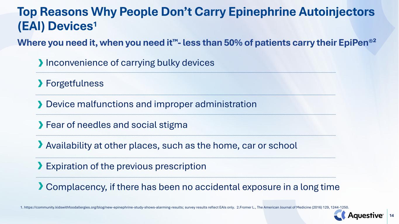 14 Top Reasons Why People Don’t Carry Epinephrine Autoinjectors (EAI) Devices1 1. https://community.kidswithfoodallergies.org/blog/new-epinephrine-study-shows-alarming-results; survey results reflect EAIs only. 2.Fromer L., The American Journal of Medicine (2016) 129, 1244-1250. Inconvenience of carrying bulky devices Forgetfulness Device malfunctions and improper administration Fear of needles and social stigma Availability at other places, such as the home, car or school Expiration of the previous prescription Complacency, if there has been no accidental exposure in a long time Where you need it, when you need it - less than 50% of patients carry their EpiPen®²