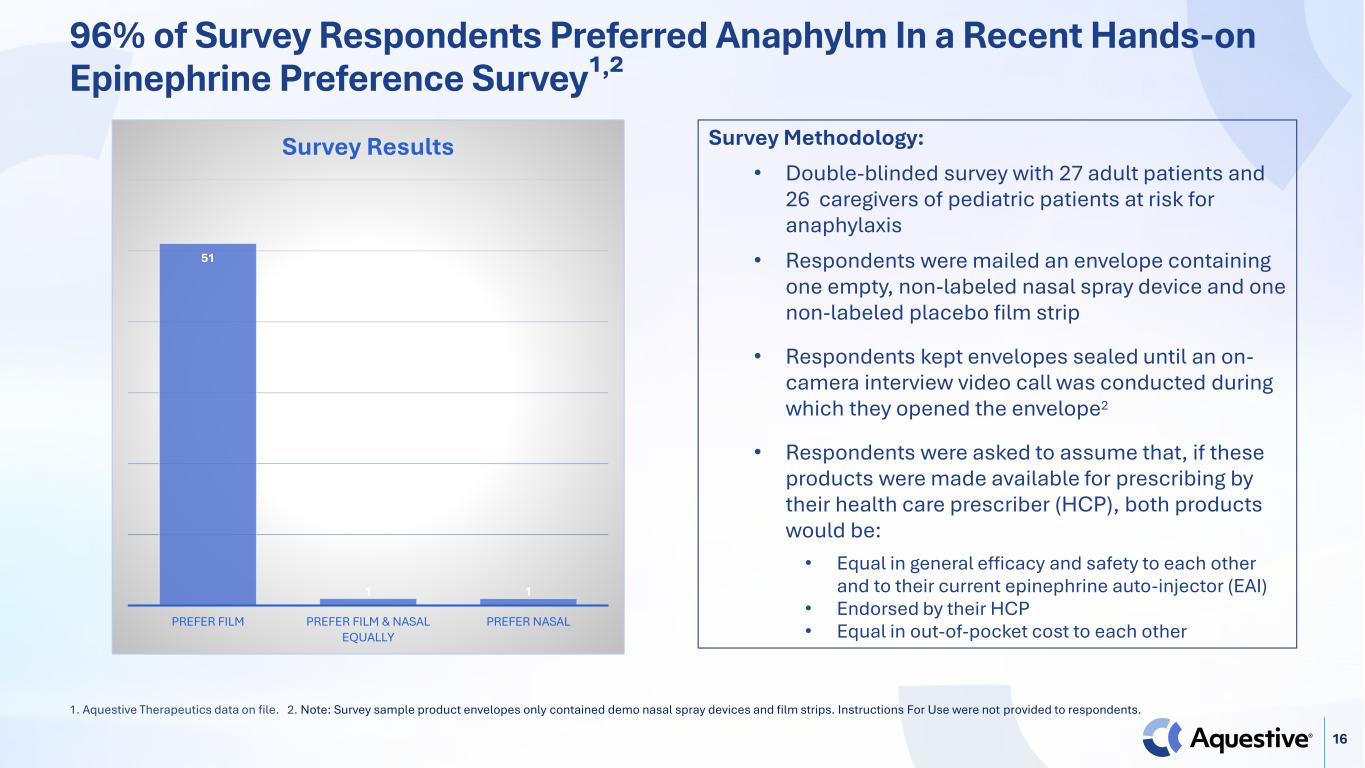 16 Survey Methodology: • Double-blinded survey with 27 adult patients and 26 caregivers of pediatric patients at risk for anaphylaxis • Respondents were mailed an envelope containing one empty, non-labeled nasal spray device and one non-labeled placebo film strip • Respondents kept envelopes sealed until an on- camera interview video call was conducted during which they opened the envelope2 • Respondents were asked to assume that, if these products were made available for prescribing by their health care prescriber (HCP), both products would be: • Equal in general efficacy and safety to each other and to their current epinephrine auto-injector (EAI) • Endorsed by their HCP • Equal in out-of-pocket cost to each other 96% of Survey Respondents Preferred Anaphylm In a Recent Hands-on Epinephrine Preference Survey¹,² 1. Aquestive Therapeutics data on file. 2. Note: Survey sample product envelopes only contained demo nasal spray devices and film strips. Instructions For Use were not provided to respondents. 51 1 1 PREFER FILM PREFER FILM & NASAL EQUALLY PREFER NASAL Survey Results
