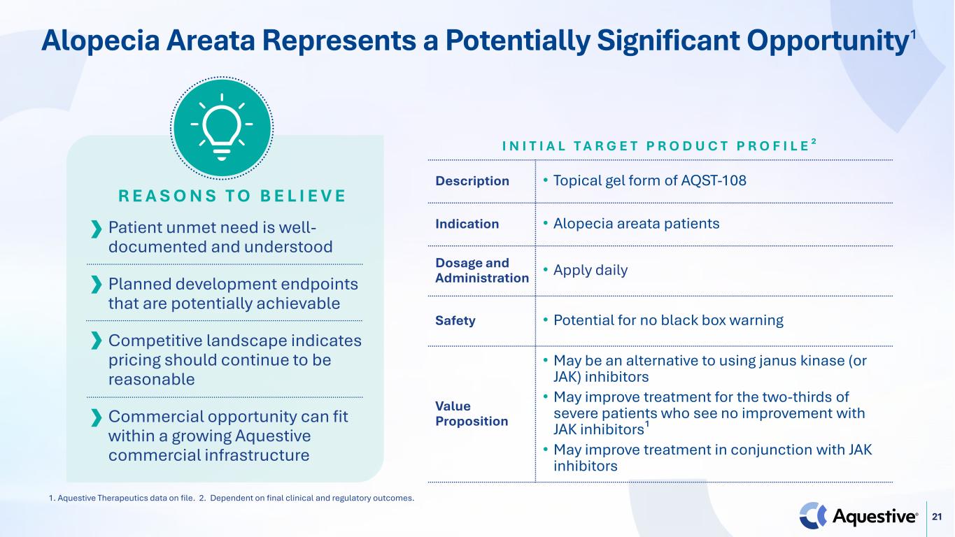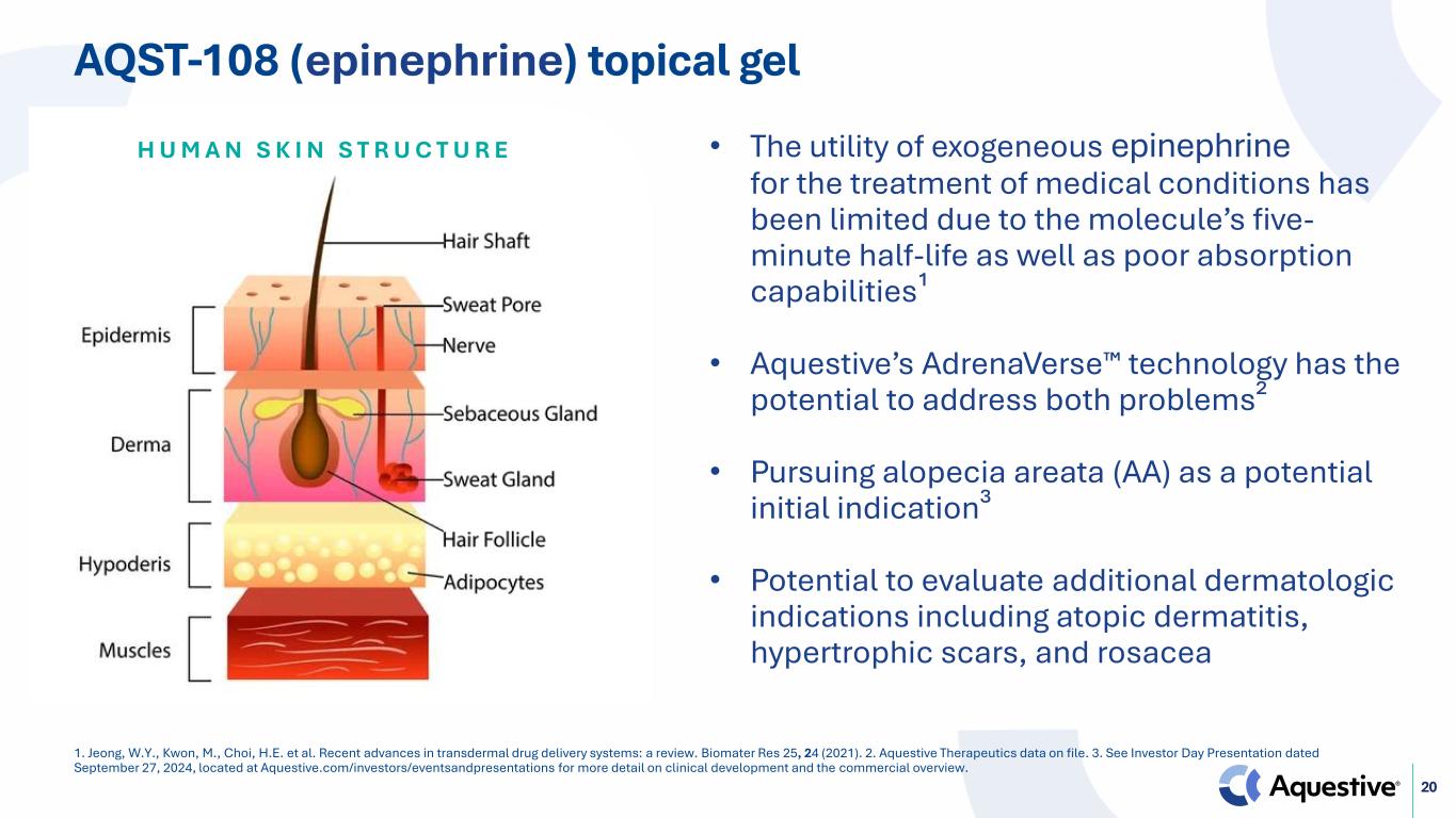 20 AQST-108 (epinephrine) topical gel 1. Jeong, W.Y., Kwon, M., Choi, H.E. et al. Recent advances in transdermal drug delivery systems: a review. Biomater Res 25, 24 (2021). 2. Aquestive Therapeutics data on file. 3. See Investor Day Presentation dated September 27, 2024, located at Aquestive.com/investors/eventsandpresentations for more detail on clinical development and the commercial overview. z H U M A N S K I N S T R U C T U R E • The utility of exogeneous epinephrine for the treatment of medical conditions has been limited due to the molecule’s five- minute half-life as well as poor absorption capabilities¹ • Aquestive’s AdrenaVerse technology has the potential to address both problems² • Pursuing alopecia areata (AA) as a potential initial indication³ • Potential to evaluate additional dermatologic indications including atopic dermatitis, hypertrophic scars, and rosacea