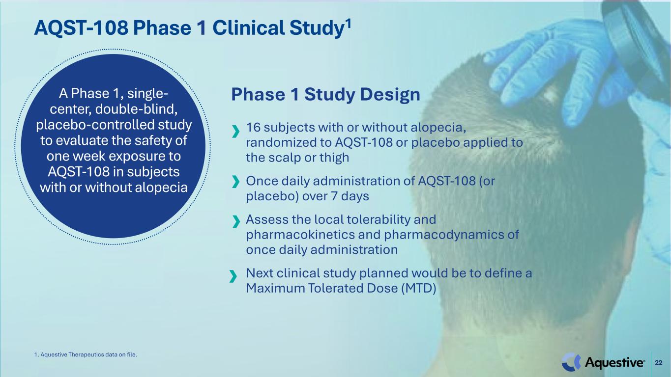 22 AQST-108 Phase 1 Clinical Study1 Phase 1 Study Design 16 subjects with or without alopecia, randomized to AQST-108 or placebo applied to the scalp or thigh Once daily administration of AQST-108 (or placebo) over 7 days Assess the local tolerability and pharmacokinetics and pharmacodynamics of once daily administration Next clinical study planned would be to define a Maximum Tolerated Dose (MTD) A Phase 1, single- center, double-blind, placebo-controlled study to evaluate the safety of one week exposure to AQST-108 in subjects with or without alopecia 1. Aquestive Therapeutics data on file.
