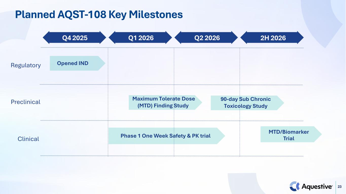 23 Planned AQST-108 Key Milestones Q4 2025 Q1 2026 Q2 2026 2H 2026 Opened IND MTD/Biomarker TrialPhase 1 One Week Safety & PK trial Regulatory Preclinical Clinical Maximum Tolerate Dose (MTD) Finding Study 90-day Sub Chronic Toxicology Study