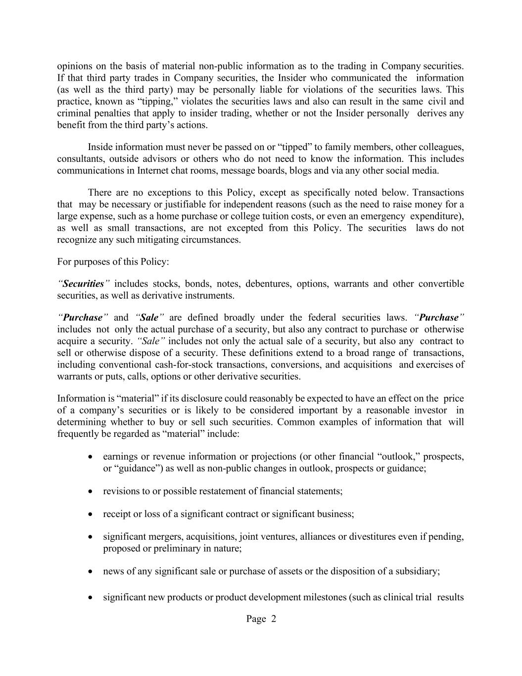 Page 2 opinions on the basis of material non-public information as to the trading in Company securities. If that third party trades in Company securities, the Insider who communicated the information (as well as the third party) may be personally liable for violations of the securities laws. This practice, known as “tipping,” violates the securities laws and also can result in the same civil and criminal penalties that apply to insider trading, whether or not the Insider personally derives any benefit from the third party’s actions. Inside information must never be passed on or “tipped” to family members, other colleagues, consultants, outside advisors or others who do not need to know the information. This includes communications in Internet chat rooms, message boards, blogs and via any other social media. There are no exceptions to this Policy, except as specifically noted below. Transactions that may be necessary or justifiable for independent reasons (such as the need to raise money for a large expense, such as a home purchase or college tuition costs, or even an emergency expenditure), as well as small transactions, are not excepted from this Policy. The securities laws do not recognize any such mitigating circumstances. For purposes of this Policy: “Securities” includes stocks, bonds, notes, debentures, options, warrants and other convertible securities, as well as derivative instruments. “Purchase” and “Sale” are defined broadly under the federal securities laws. “Purchase” includes not only the actual purchase of a security, but also any contract to purchase or otherwise acquire a security. “Sale” includes not only the actual sale of a security, but also any contract to sell or otherwise dispose of a security. These definitions extend to a broad range of transactions, including conventional cash-for-stock transactions, conversions, and acquisitions and exercises of warrants or puts, calls, options or other derivative securities. Information is “material” if its disclosure could reasonably be expected to have an effect on the price of a company’s securities or is likely to be considered important by a reasonable investor in determining whether to buy or sell such securities. Common examples of information that will frequently be regarded as “material” include: • earnings or revenue information or projections (or other financial “outlook,” prospects, or “guidance”) as well as non-public changes in outlook, prospects or guidance; • revisions to or possible restatement of financial statements; • receipt or loss of a significant contract or significant business; • significant mergers, acquisitions, joint ventures, alliances or divestitures even if pending, proposed or preliminary in nature; • news of any significant sale or purchase of assets or the disposition of a subsidiary; • significant new products or product development milestones (such as clinical trial results