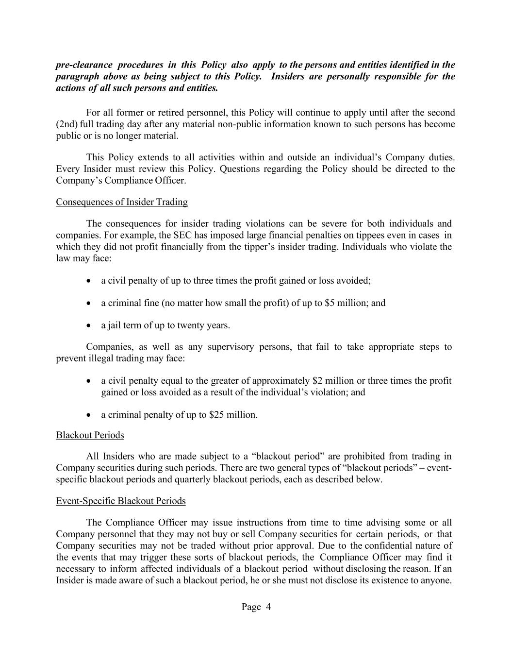 Page 4 pre-clearance procedures in this Policy also apply to the persons and entities identified in the paragraph above as being subject to this Policy. Insiders are personally responsible for the actions of all such persons and entities. For all former or retired personnel, this Policy will continue to apply until after the second (2nd) full trading day after any material non-public information known to such persons has become public or is no longer material. This Policy extends to all activities within and outside an individual’s Company duties. Every Insider must review this Policy. Questions regarding the Policy should be directed to the Company’s Compliance Officer. Consequences of Insider Trading The consequences for insider trading violations can be severe for both individuals and companies. For example, the SEC has imposed large financial penalties on tippees even in cases in which they did not profit financially from the tipper’s insider trading. Individuals who violate the law may face: • a civil penalty of up to three times the profit gained or loss avoided; • a criminal fine (no matter how small the profit) of up to $5 million; and • a jail term of up to twenty years. Companies, as well as any supervisory persons, that fail to take appropriate steps to prevent illegal trading may face: • a civil penalty equal to the greater of approximately $2 million or three times the profit gained or loss avoided as a result of the individual’s violation; and • a criminal penalty of up to $25 million. Blackout Periods All Insiders who are made subject to a “blackout period” are prohibited from trading in Company securities during such periods. There are two general types of “blackout periods” – event- specific blackout periods and quarterly blackout periods, each as described below. Event-Specific Blackout Periods The Compliance Officer may issue instructions from time to time advising some or all Company personnel that they may not buy or sell Company securities for certain periods, or that Company securities may not be traded without prior approval. Due to the confidential nature of the events that may trigger these sorts of blackout periods, the Compliance Officer may find it necessary to inform affected individuals of a blackout period without disclosing the reason. If an Insider is made aware of such a blackout period, he or she must not disclose its existence to anyone.