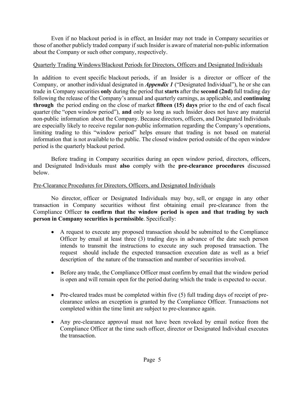 Page 5 Even if no blackout period is in effect, an Insider may not trade in Company securities or those of another publicly traded company if such Insider is aware of material non-public information about the Company or such other company, respectively. Quarterly Trading Windows/Blackout Periods for Directors, Officers and Designated Individuals In addition to event specific blackout periods, if an Insider is a director or officer of the Company, or another individual designated in Appendix 1 (“Designated Individual”), he or she can trade in Company securities only during the period that starts after the second (2nd) full trading day following the release of the Company’s annual and quarterly earnings, as applicable, and continuing through the period ending on the close of market fifteen (15) days prior to the end of each fiscal quarter (the “open window period”), and only so long as such Insider does not have any material non-public information about the Company. Because directors, officers, and Designated Individuals are especially likely to receive regular non-public information regarding the Company’s operations, limiting trading to this “window period” helps ensure that trading is not based on material information that is not available to the public. The closed window period outside of the open window period is the quarterly blackout period. Before trading in Company securities during an open window period, directors, officers, and Designated Individuals must also comply with the pre-clearance procedures discussed below. Pre-Clearance Procedures for Directors, Officers, and Designated Individuals No director, officer or Designated Individuals may buy, sell, or engage in any other transaction in Company securities without first obtaining email pre-clearance from the Compliance Officer to confirm that the window period is open and that trading by such person in Company securities is permissible. Specifically: • A request to execute any proposed transaction should be submitted to the Compliance Officer by email at least three (3) trading days in advance of the date such person intends to transmit the instructions to execute any such proposed transaction. The request should include the expected transaction execution date as well as a brief description of the nature of the transaction and number of securities involved. • Before any trade, the Compliance Officer must confirm by email that the window period is open and will remain open for the period during which the trade is expected to occur. • Pre-cleared trades must be completed within five (5) full trading days of receipt of pre- clearance unless an exception is granted by the Compliance Officer. Transactions not completed within the time limit are subject to pre-clearance again. • Any pre-clearance approval must not have been revoked by email notice from the Compliance Officer at the time such officer, director or Designated Individual executes the transaction.