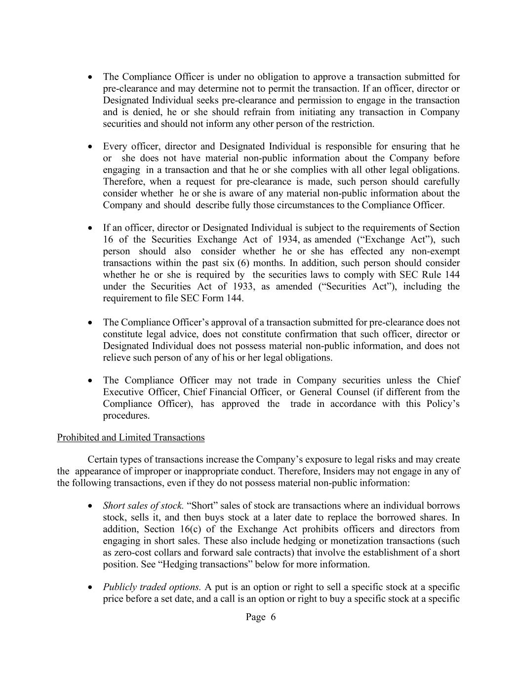 Page 6 • The Compliance Officer is under no obligation to approve a transaction submitted for pre-clearance and may determine not to permit the transaction. If an officer, director or Designated Individual seeks pre-clearance and permission to engage in the transaction and is denied, he or she should refrain from initiating any transaction in Company securities and should not inform any other person of the restriction. • Every officer, director and Designated Individual is responsible for ensuring that he or she does not have material non-public information about the Company before engaging in a transaction and that he or she complies with all other legal obligations. Therefore, when a request for pre-clearance is made, such person should carefully consider whether he or she is aware of any material non-public information about the Company and should describe fully those circumstances to the Compliance Officer. • If an officer, director or Designated Individual is subject to the requirements of Section 16 of the Securities Exchange Act of 1934, as amended (“Exchange Act”), such person should also consider whether he or she has effected any non-exempt transactions within the past six (6) months. In addition, such person should consider whether he or she is required by the securities laws to comply with SEC Rule 144 under the Securities Act of 1933, as amended (“Securities Act”), including the requirement to file SEC Form 144. • The Compliance Officer’s approval of a transaction submitted for pre-clearance does not constitute legal advice, does not constitute confirmation that such officer, director or Designated Individual does not possess material non-public information, and does not relieve such person of any of his or her legal obligations. • The Compliance Officer may not trade in Company securities unless the Chief Executive Officer, Chief Financial Officer, or General Counsel (if different from the Compliance Officer), has approved the trade in accordance with this Policy’s procedures. Prohibited and Limited Transactions Certain types of transactions increase the Company’s exposure to legal risks and may create the appearance of improper or inappropriate conduct. Therefore, Insiders may not engage in any of the following transactions, even if they do not possess material non-public information: • Short sales of stock. “Short” sales of stock are transactions where an individual borrows stock, sells it, and then buys stock at a later date to replace the borrowed shares. In addition, Section 16(c) of the Exchange Act prohibits officers and directors from engaging in short sales. These also include hedging or monetization transactions (such as zero-cost collars and forward sale contracts) that involve the establishment of a short position. See “Hedging transactions” below for more information. • Publicly traded options. A put is an option or right to sell a specific stock at a specific price before a set date, and a call is an option or right to buy a specific stock at a specific
